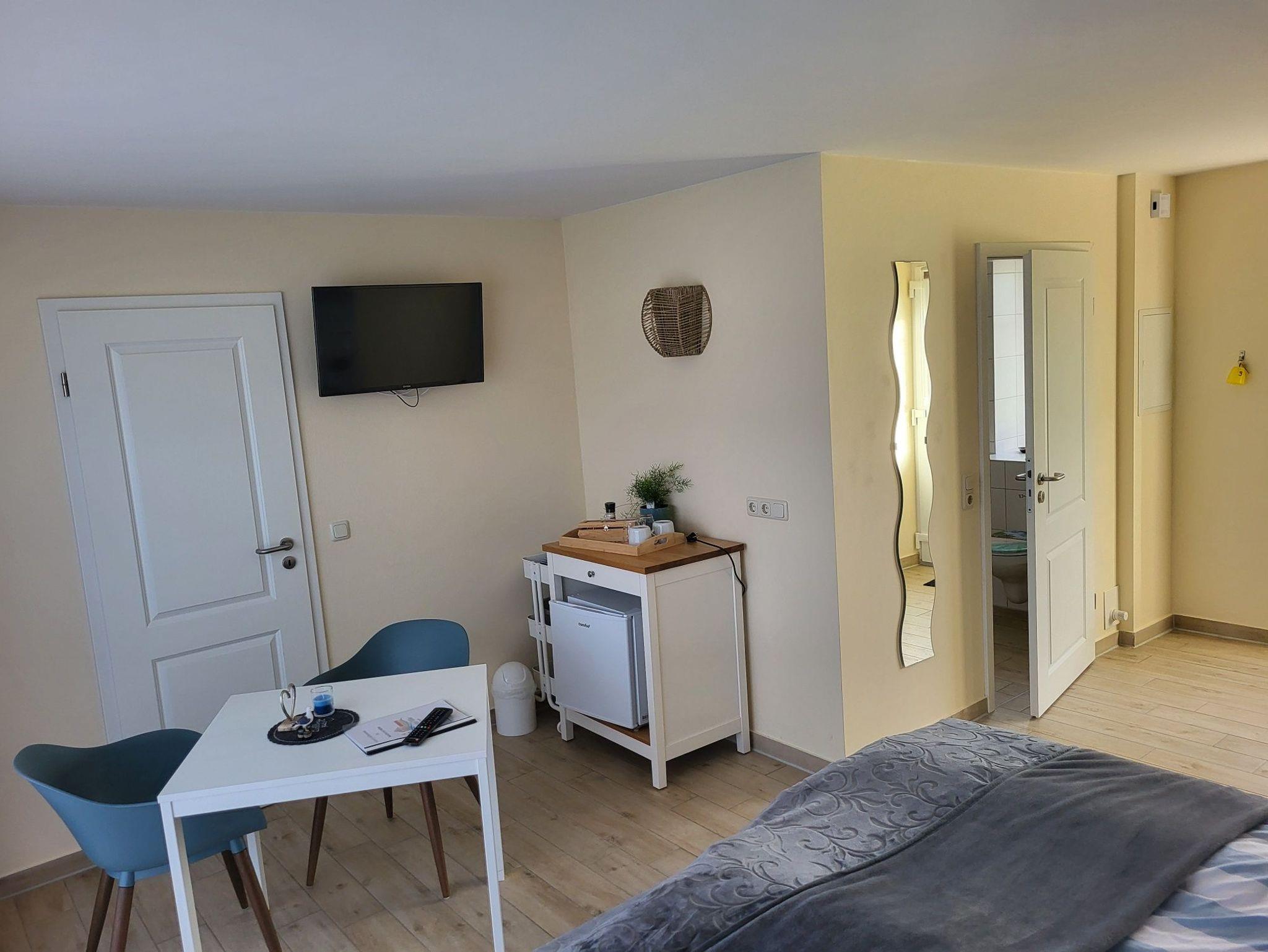 Das Doppelzimmer verfügt über ein Boxspringbett, das wahlweise als Doppelbett oder zwei Einzelbetten gestellt werden kann. Es gibt ein Duschbad/WC und ein kleines Küchenregal mit Wasserkocher, Minikühlschrank und Geschirr.