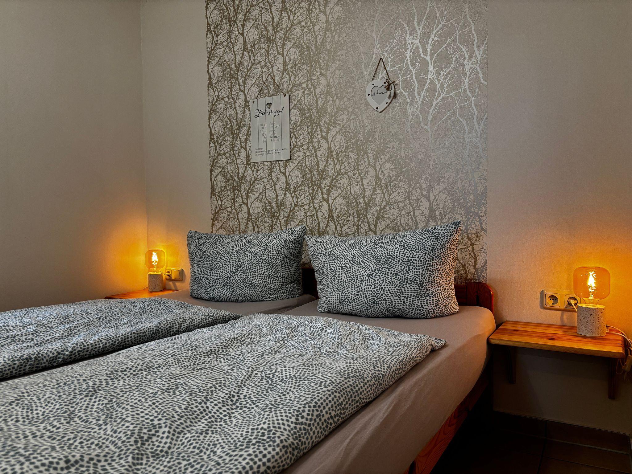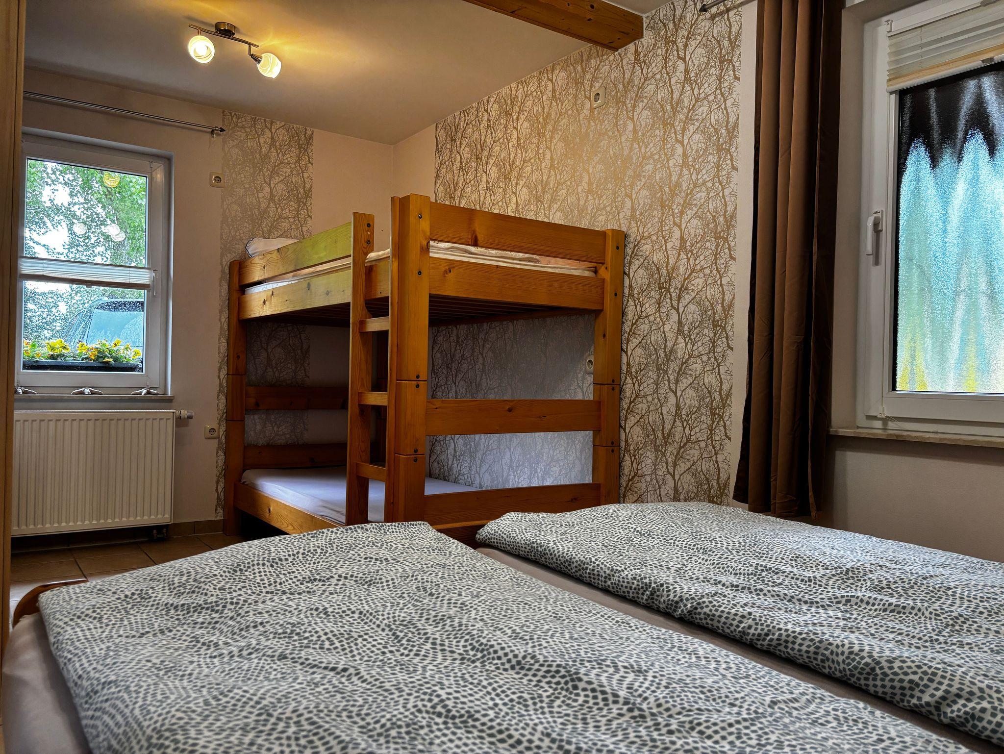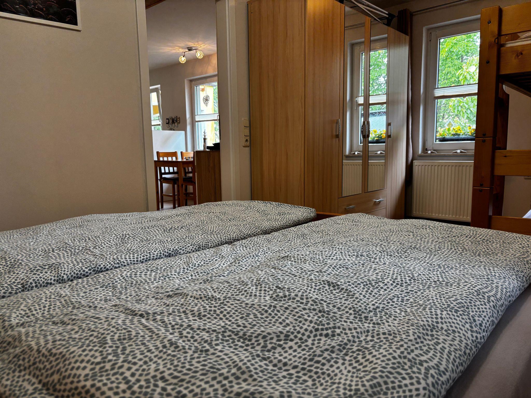 1 Schlafraum mit Doppelbett und Etagenbett. Für ein Babybett ist Platz im Schlafzimmer. Duschbad/ WC.