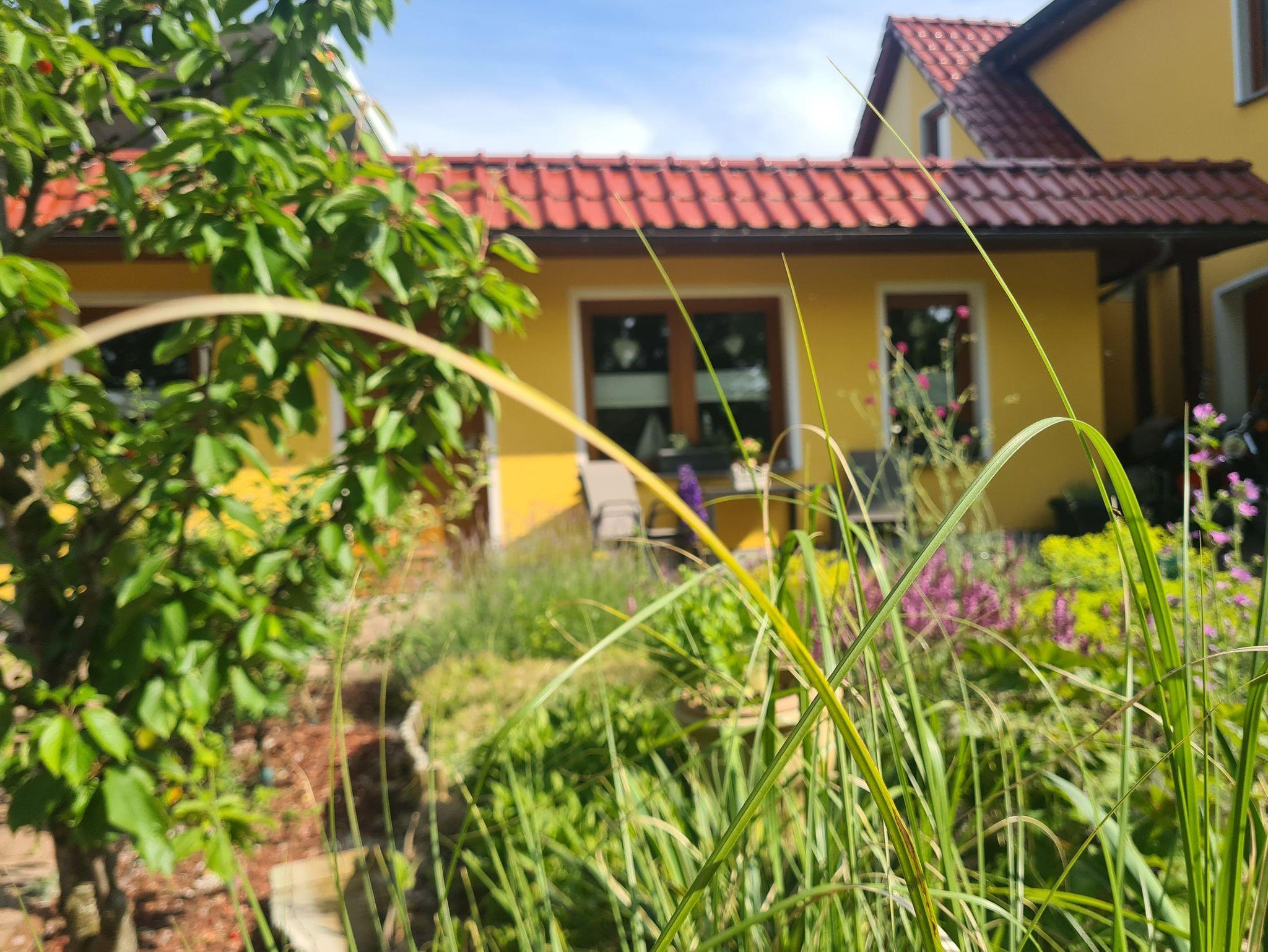 2-Raum-Gartenbungalow für 2-4 Personen, ebenerdig, rollstuhlgeeignet, Nichtraucher, Fußbodenheizung. Auf dem Grundstück des Wohnhauses der Gastgeberfamilie. Urlaub für Gäste mit Handicap: Bungalow komplett ebenerdig, schwellenlos, mit breiter Eingangstür und Schiebetüren innen. Stufenloser barrierefreier Zugang vom Parkplatz zum Bungalow mit Terrasse.