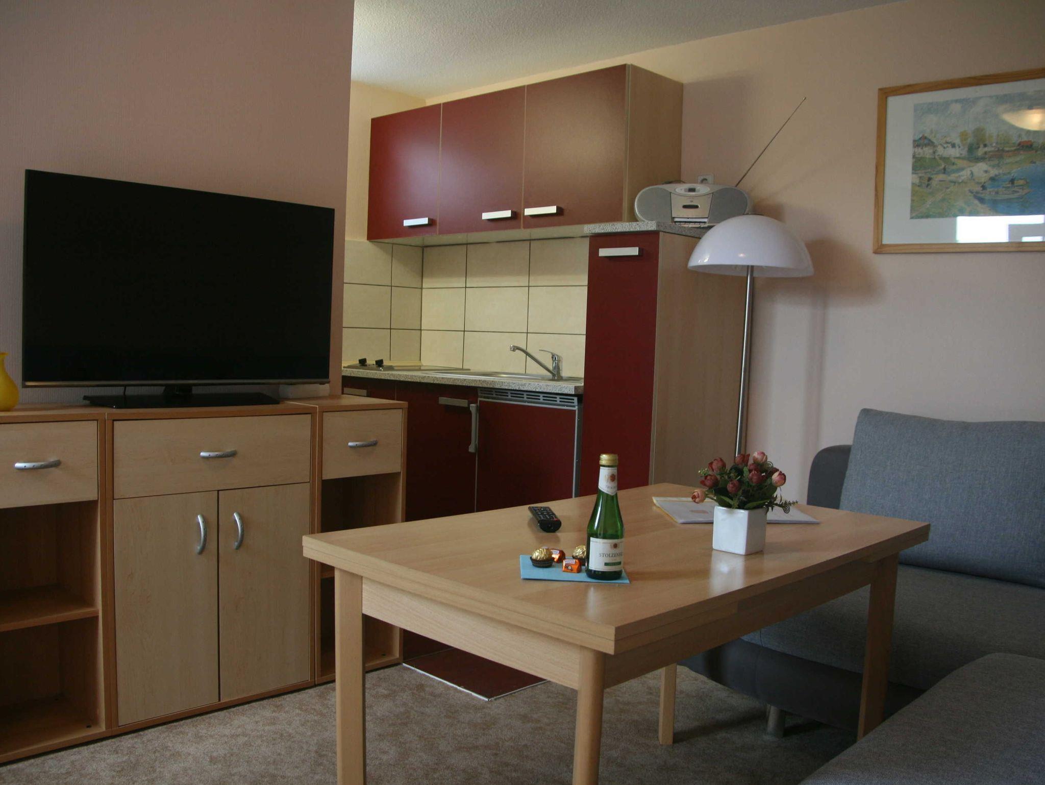 Wohnraum mit Sitzecke, Schlafraum 1 mit Doppelbett für 2 Personen (2 Polsterbetten), Schlafraum 2 mit Einzelbett (Polsterbett). Küchenzeile mit 2-Kochfelder-Herd (Ceran), Toaster, Kaffeemaschine, Wasserkocher, DU/ WC, TV, Radio.