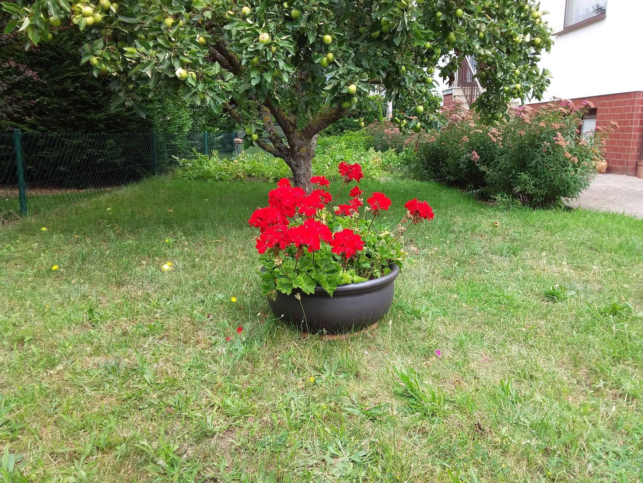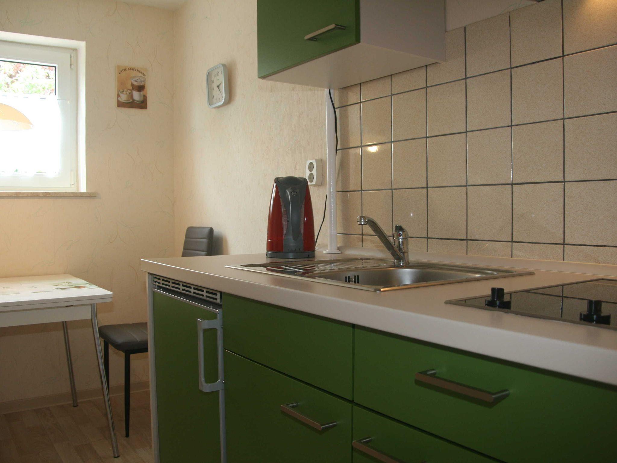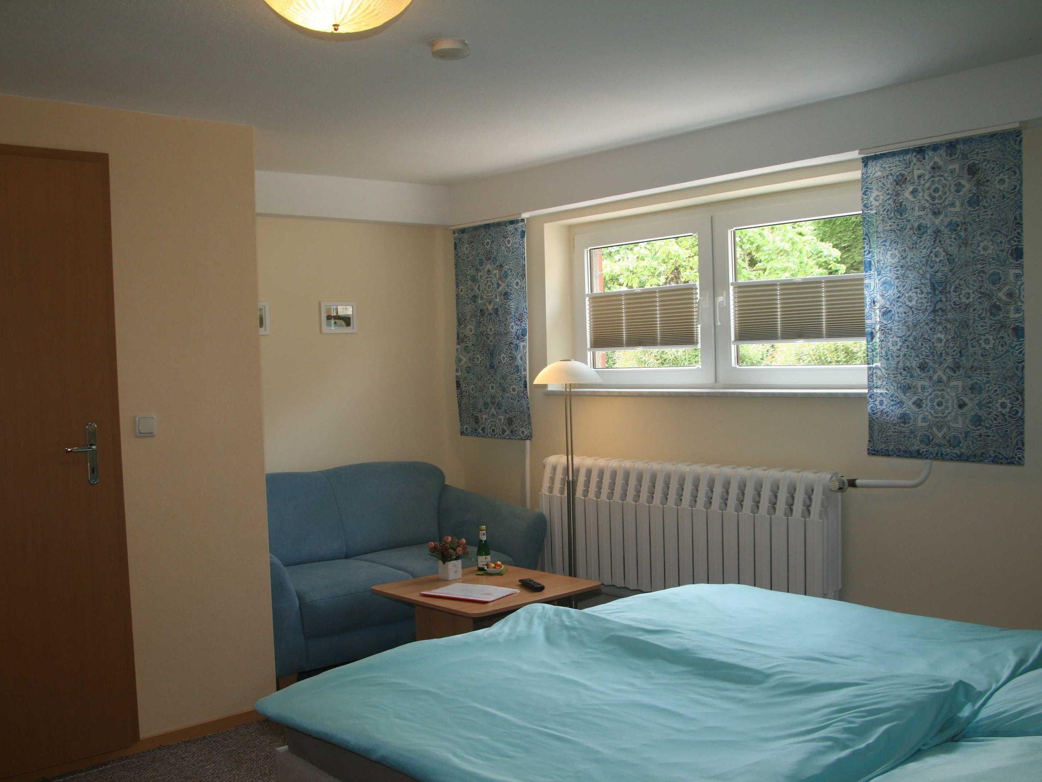 1-Raum-Ferienwohnung (20m²; max. 2 Personen, nur Erwachsene erwünscht) im Souterrain eines Familienhauses mit 1 kombinierten Wohn/ Schlafraum mit Sitzecke und 1 Doppelbett (2 Polsterbetten), Sat-TV und Radio. Separate Küche mit 2-Kochfelder-Herd (Ceran), Wasserkocher, Toaster. Kleines Duschbad/ WC. Sitzecke im Garten direkt am Haus.
