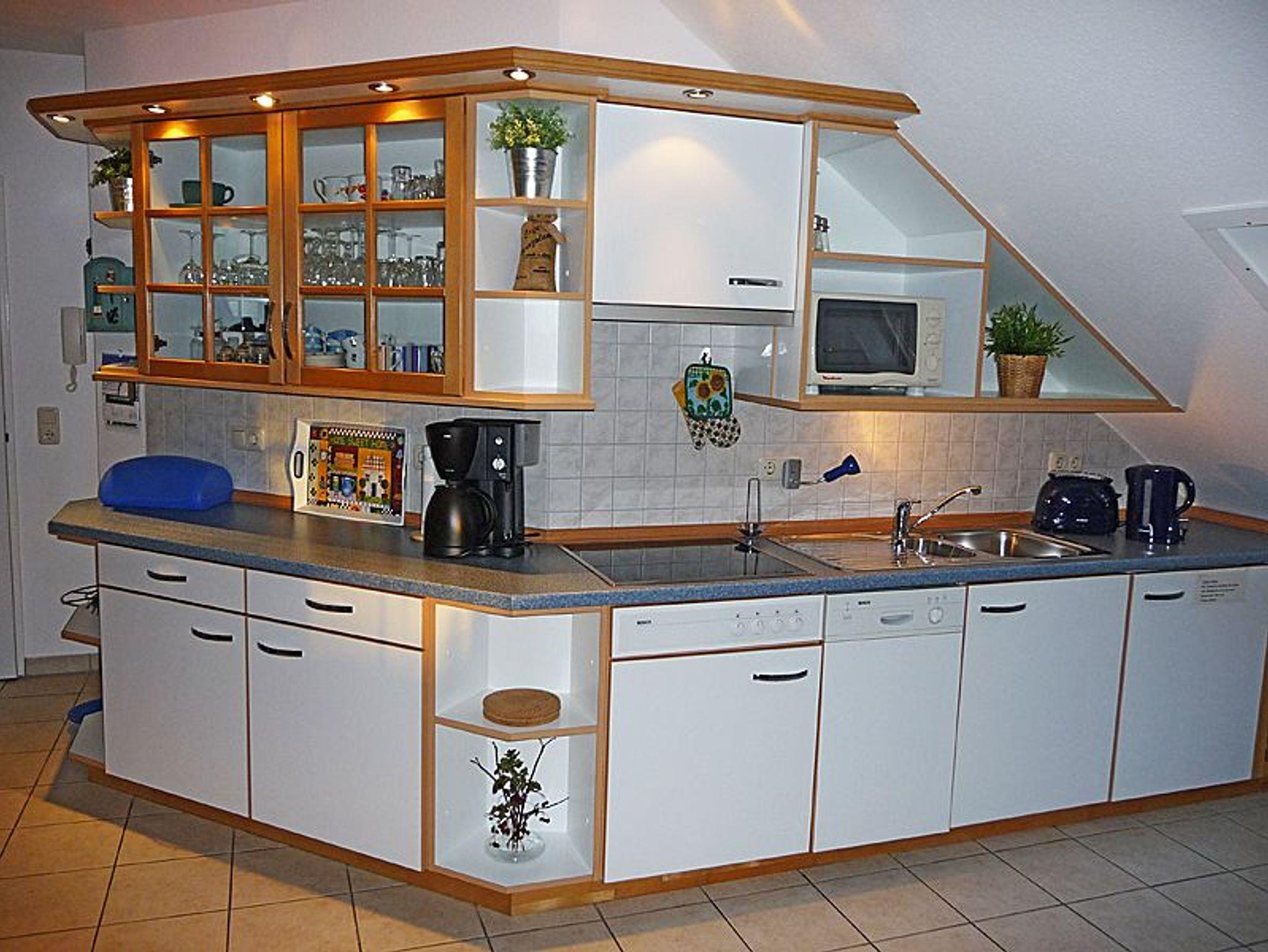 Die komplett ausgestattete Küchenzeile mit Ceranfeld, Mikrowelle, Geschirrspüler, Wasserkocher und Kaffeemaschine lässt keine Wünsche offen.