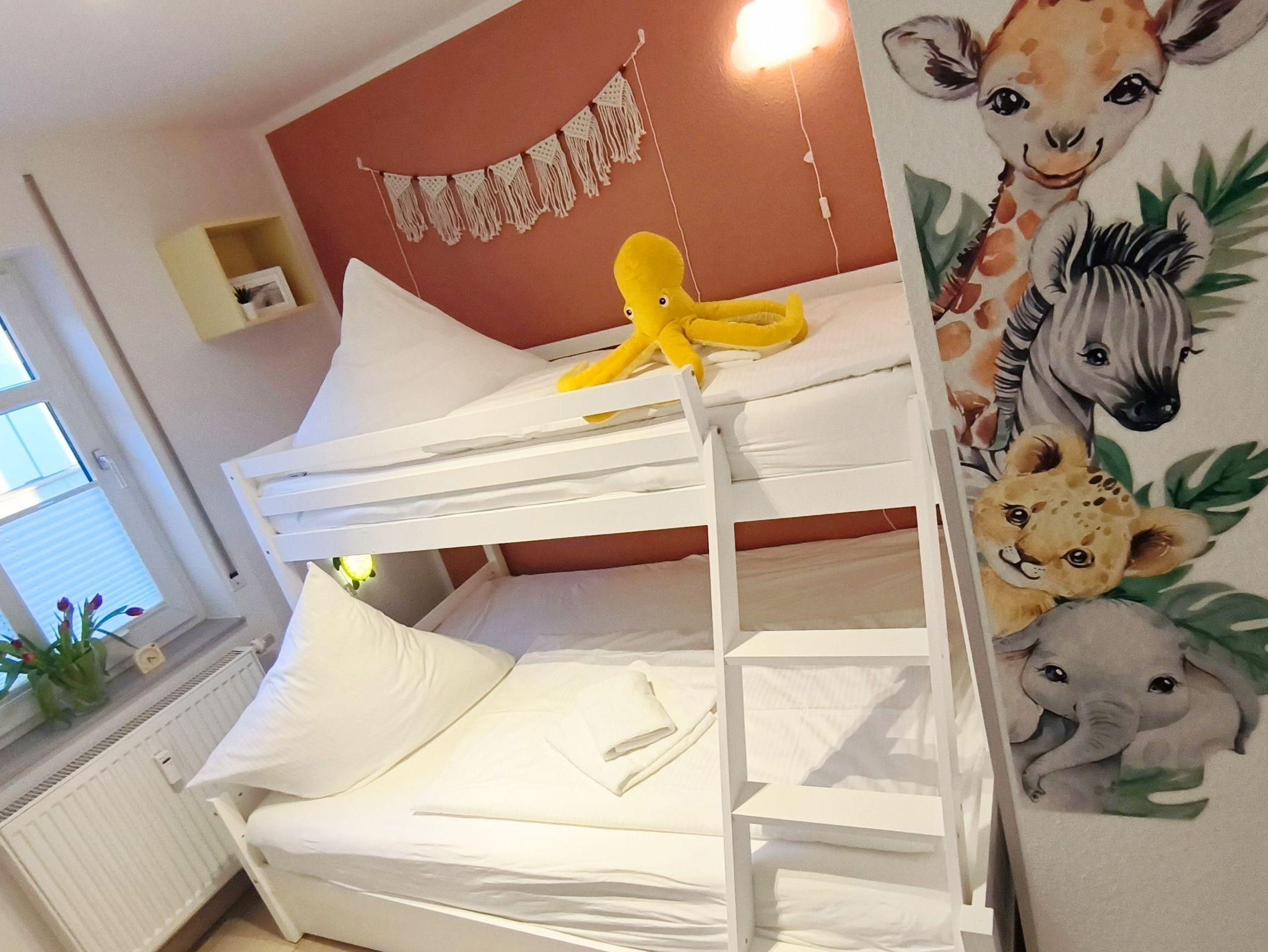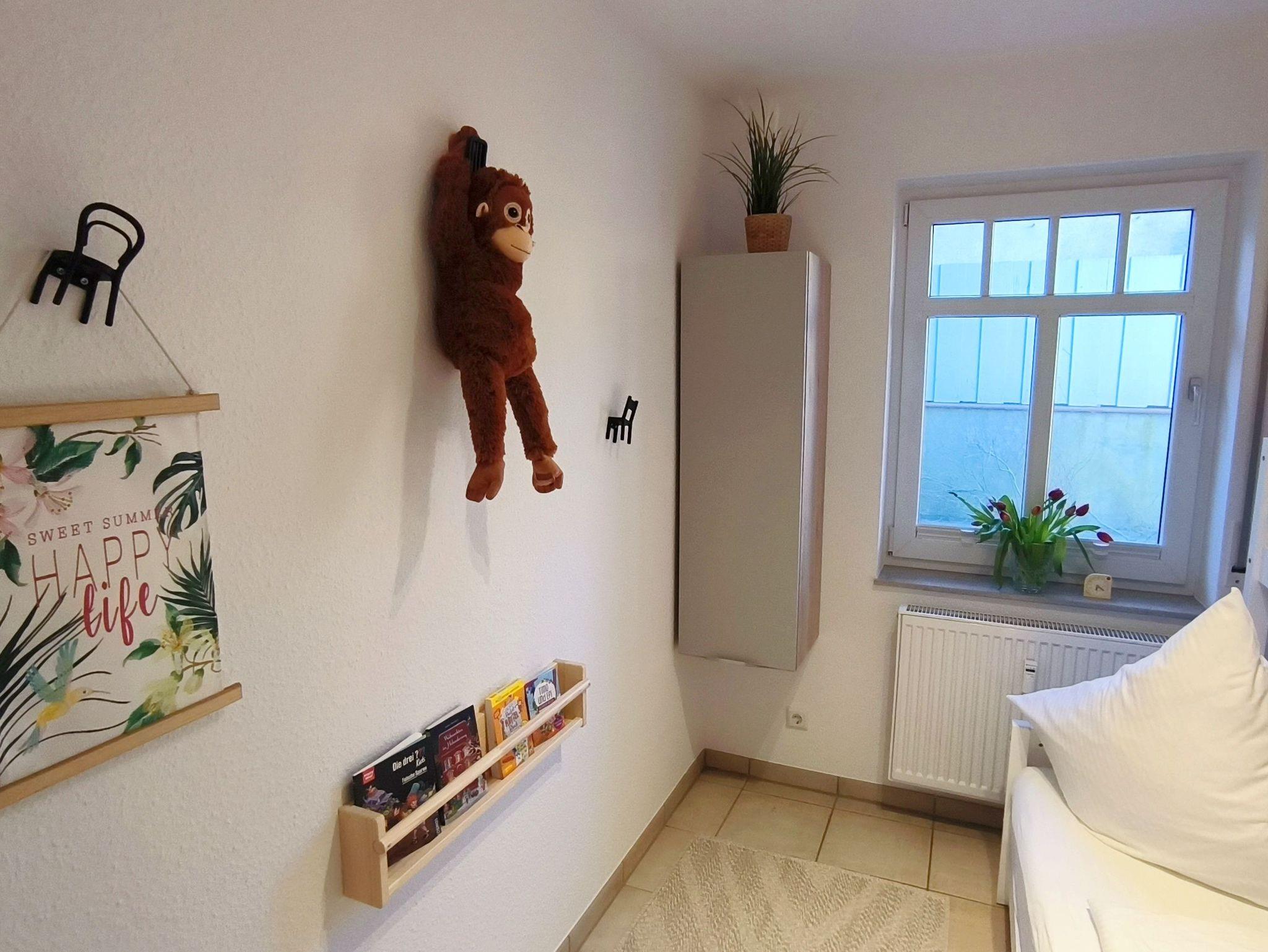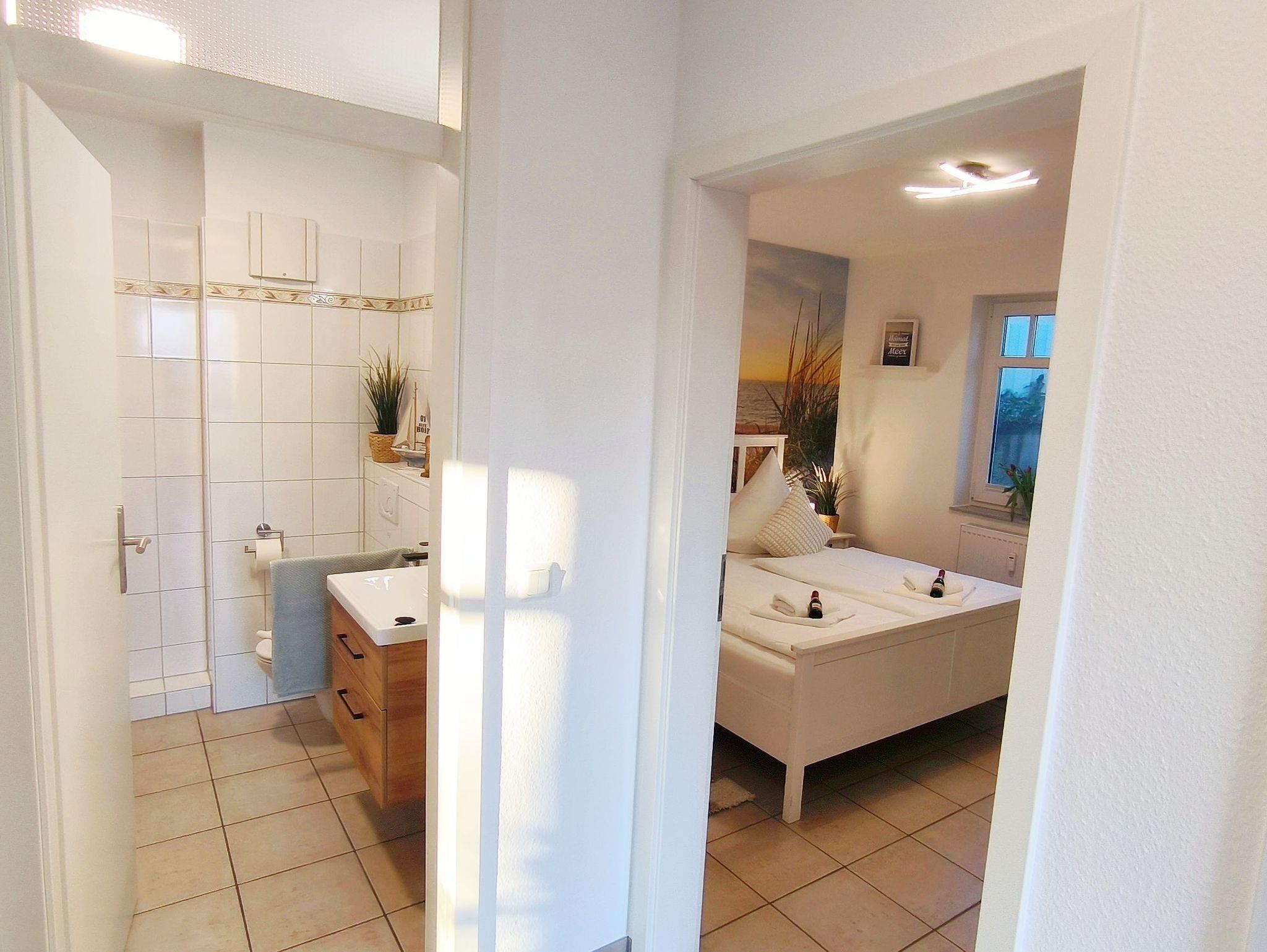 Die FeWo verfügt über einen Flur, mit Zugang zum Kinderzimmer, dem Schlafzimmer, dem Badezimmer und dem Wohnzimmer mit offener Küche.