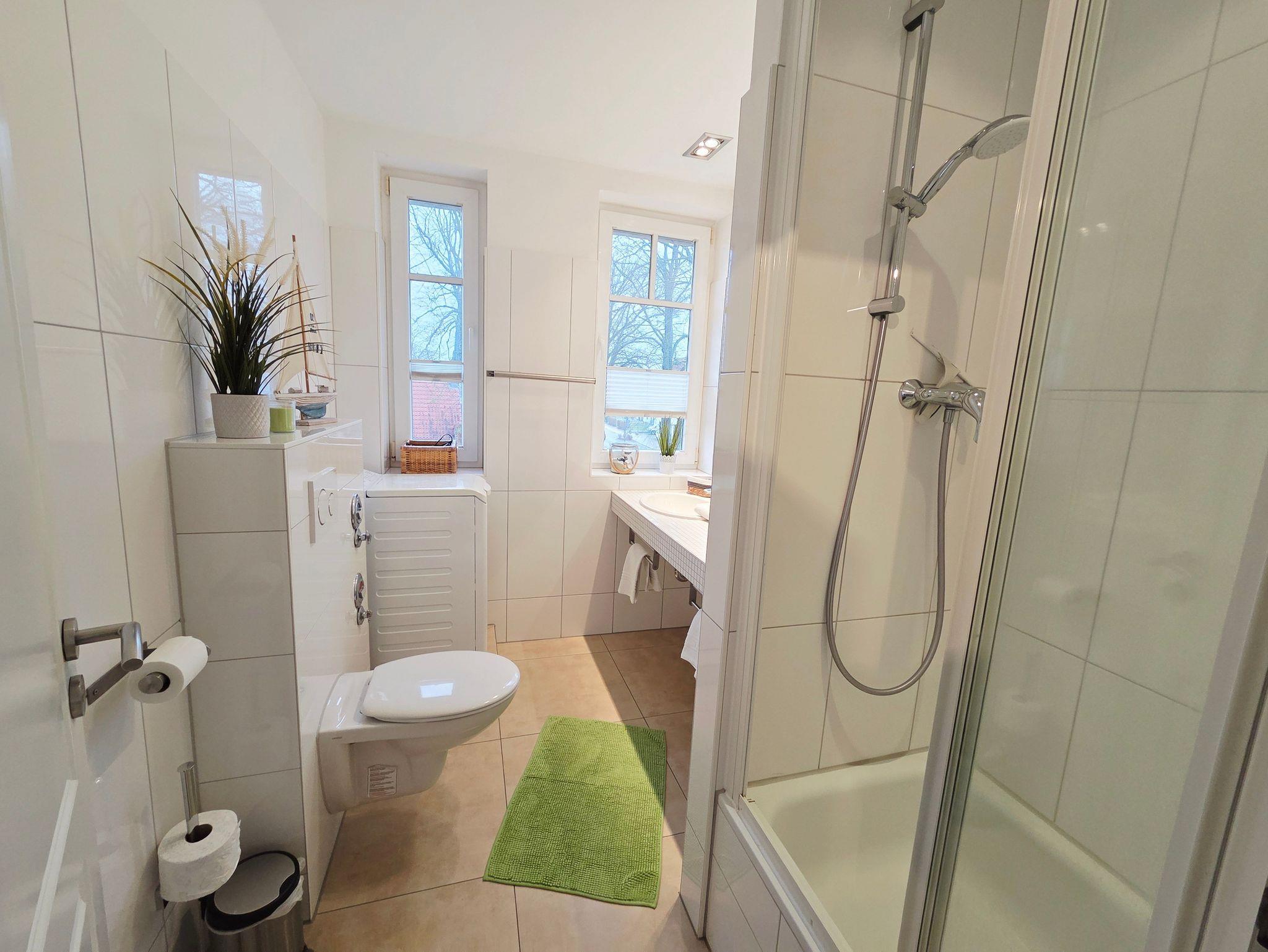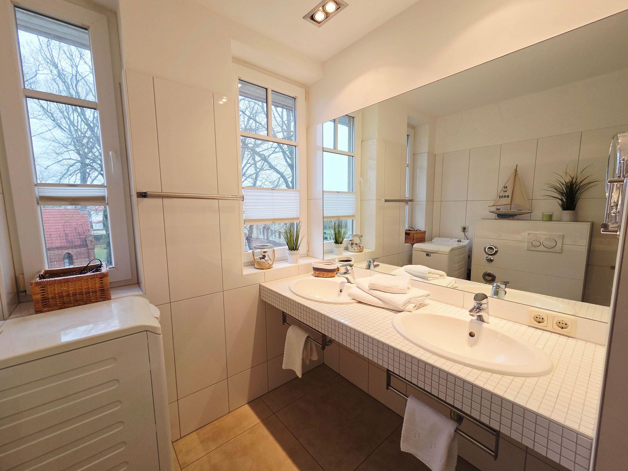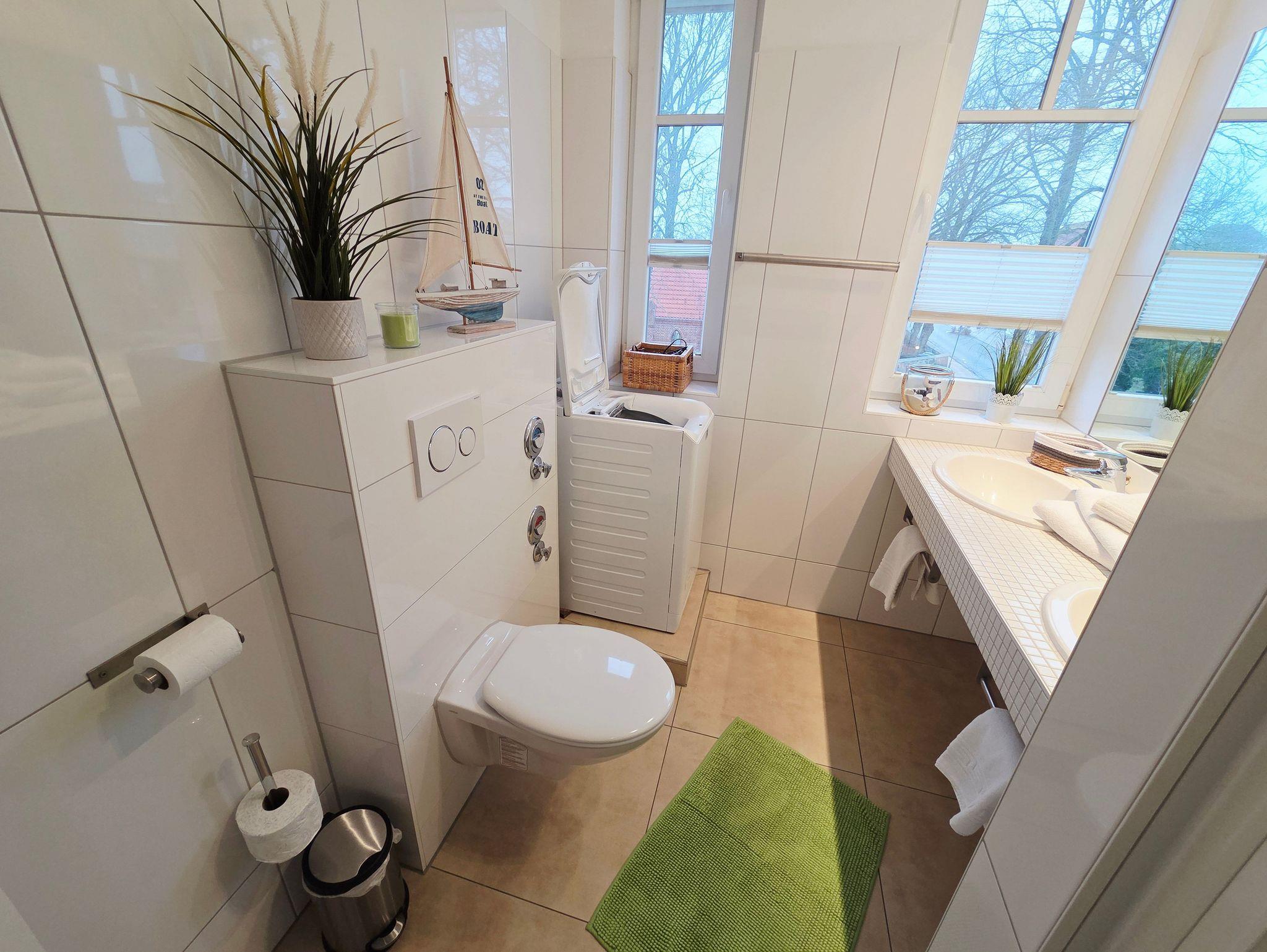 Das Bad verfügt über eine Dusche (hoher Einstieg), 2 Waschbecken und eine Waschmaschine, diese kostenlos ist.