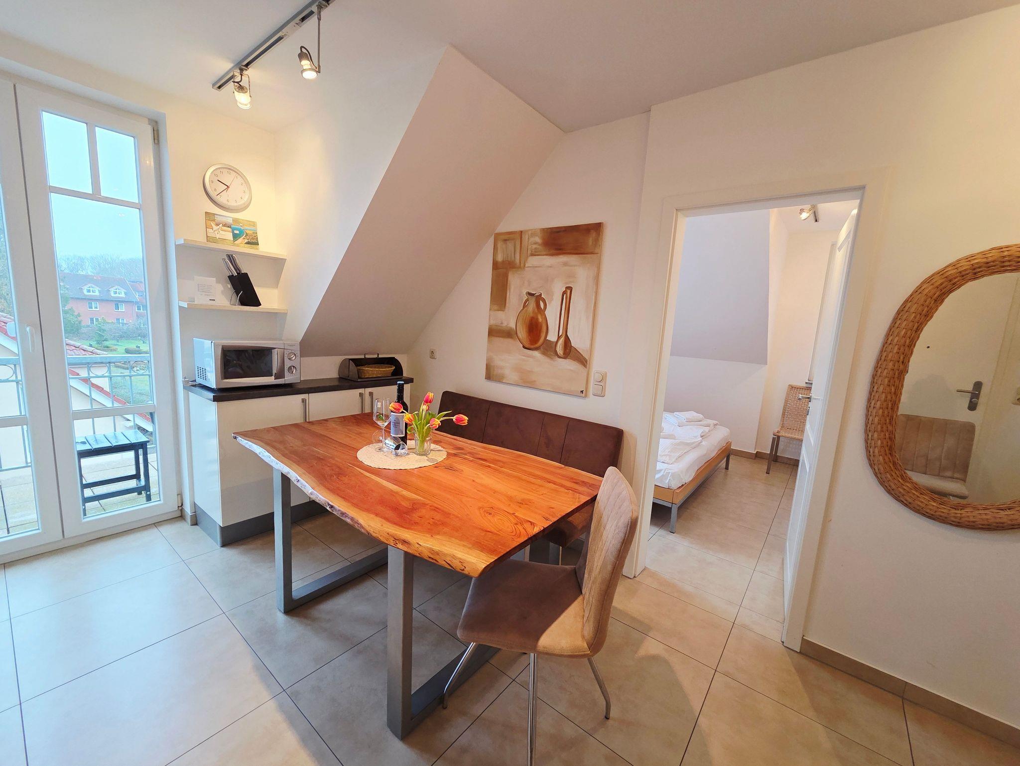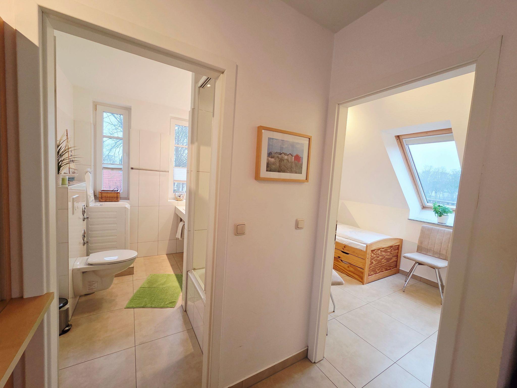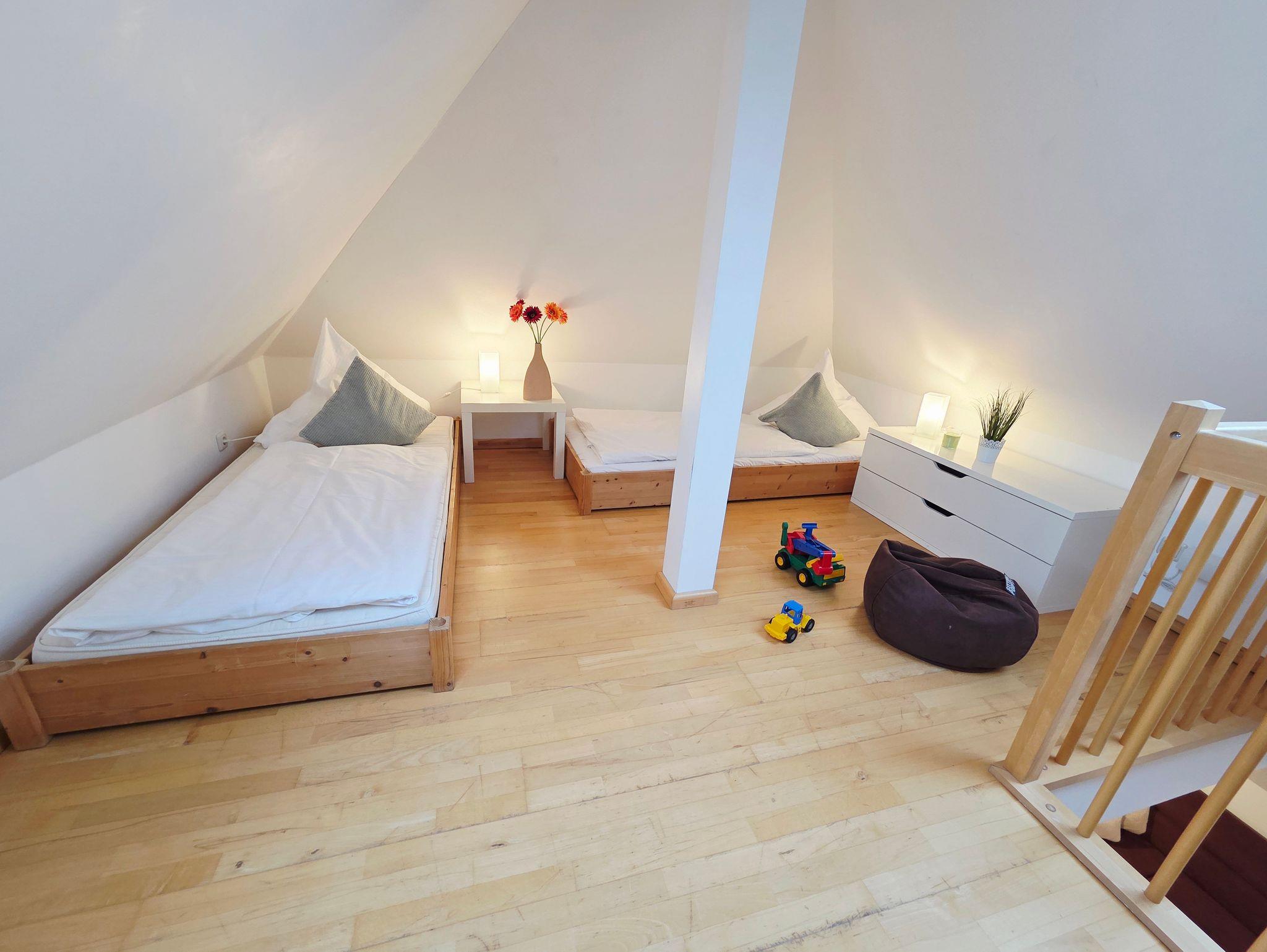 Die großzügige Dreiraumwohnung verfügt auf einer Wohnfläche von über 70m² über zwei separate Schlafzimmer sowie zusätzlich über eine offene Galerie. Das Apartment verläuft über 2 Ebenen und bietet Platz für bis zu 5 Personen. Ein Parkplatz befindet sich direkt hinter dem Haus. Diesen können Sie kostenfrei nutzen. Fahrräder werden im hauseigenen Fahrradschuppen direkt neben dem Eingang abgestellt.