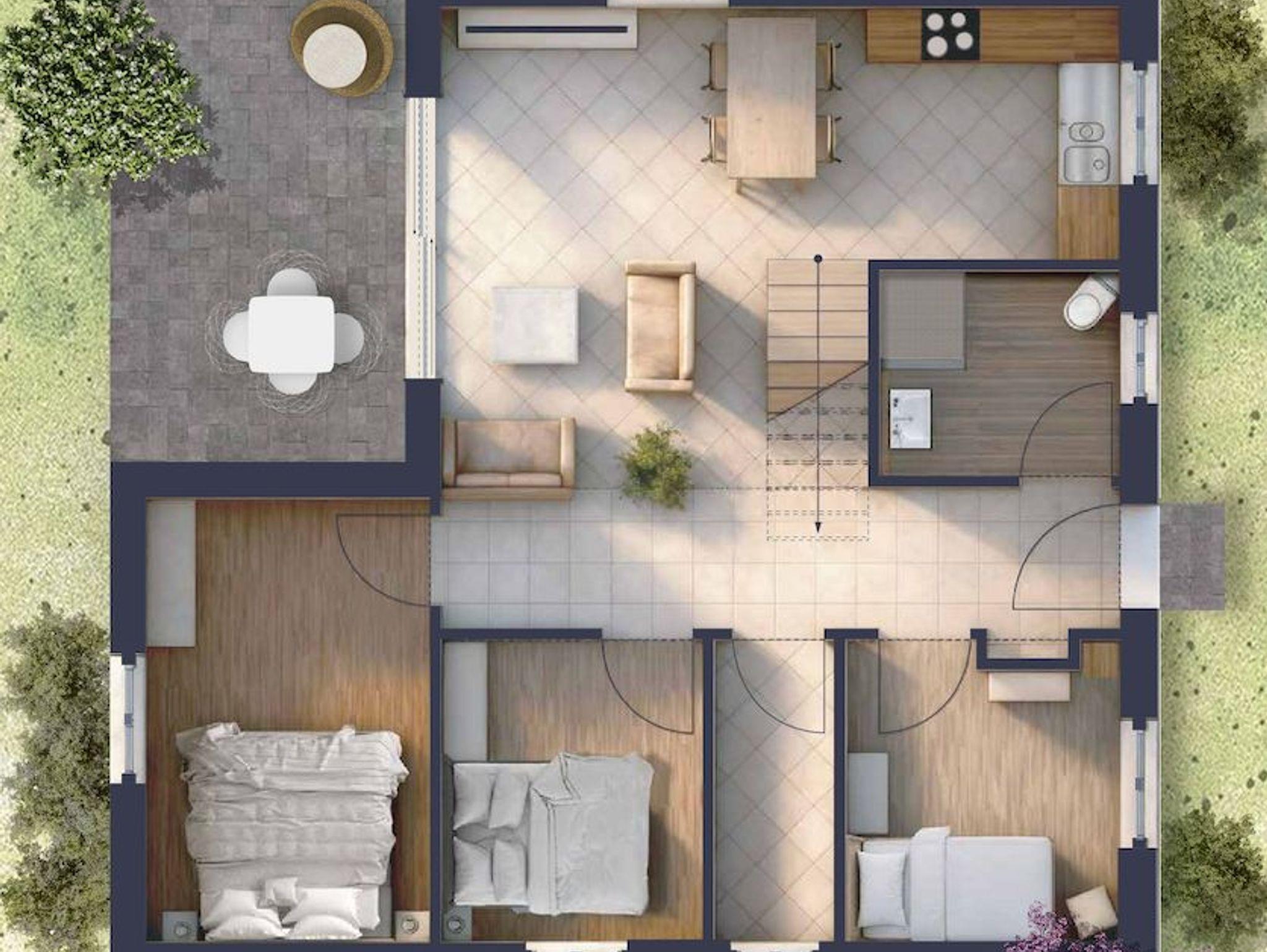 Es bietet einen großen Wohne/ Ess.- Bereich mit offener Küche und bis zu 3 Schlafzimmern.