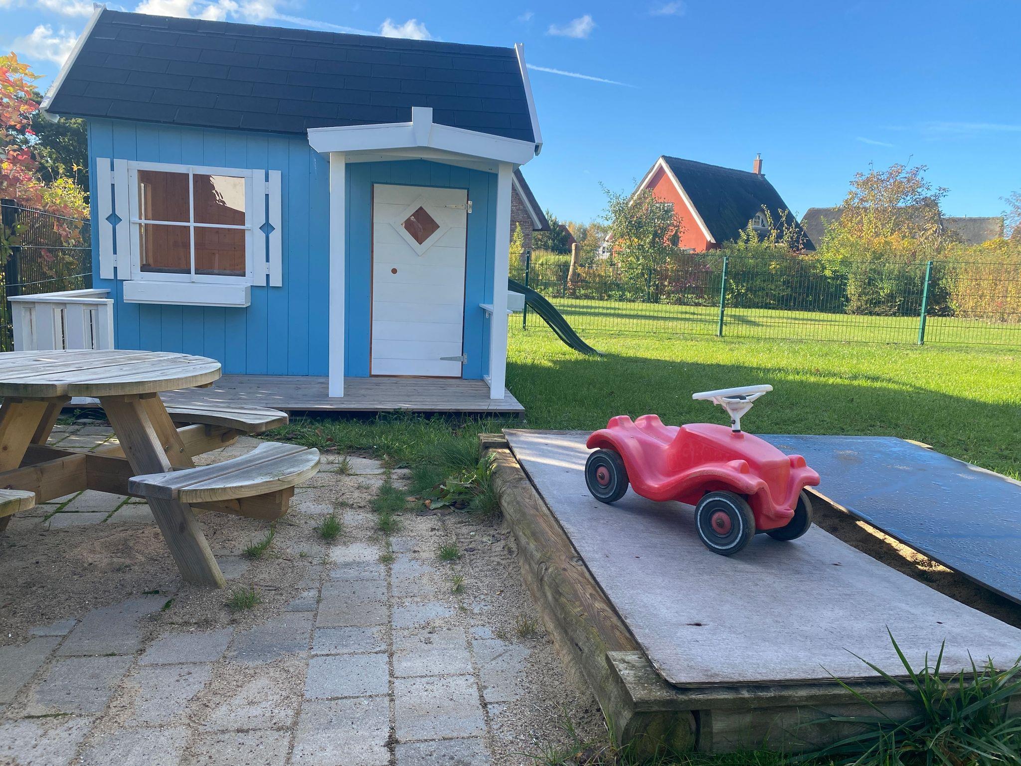 Babybett (Reisebett ohne Bettwäsche), Hochstuhl, kindersichere Steckdosen, Treppenschutzgitter, großer, eingezäunter Garten. Zusätzlich gibt es einen Gemeinschaftsgarten mit Strandkorb und Sandkasten, der bitte tierfrei bleibt.