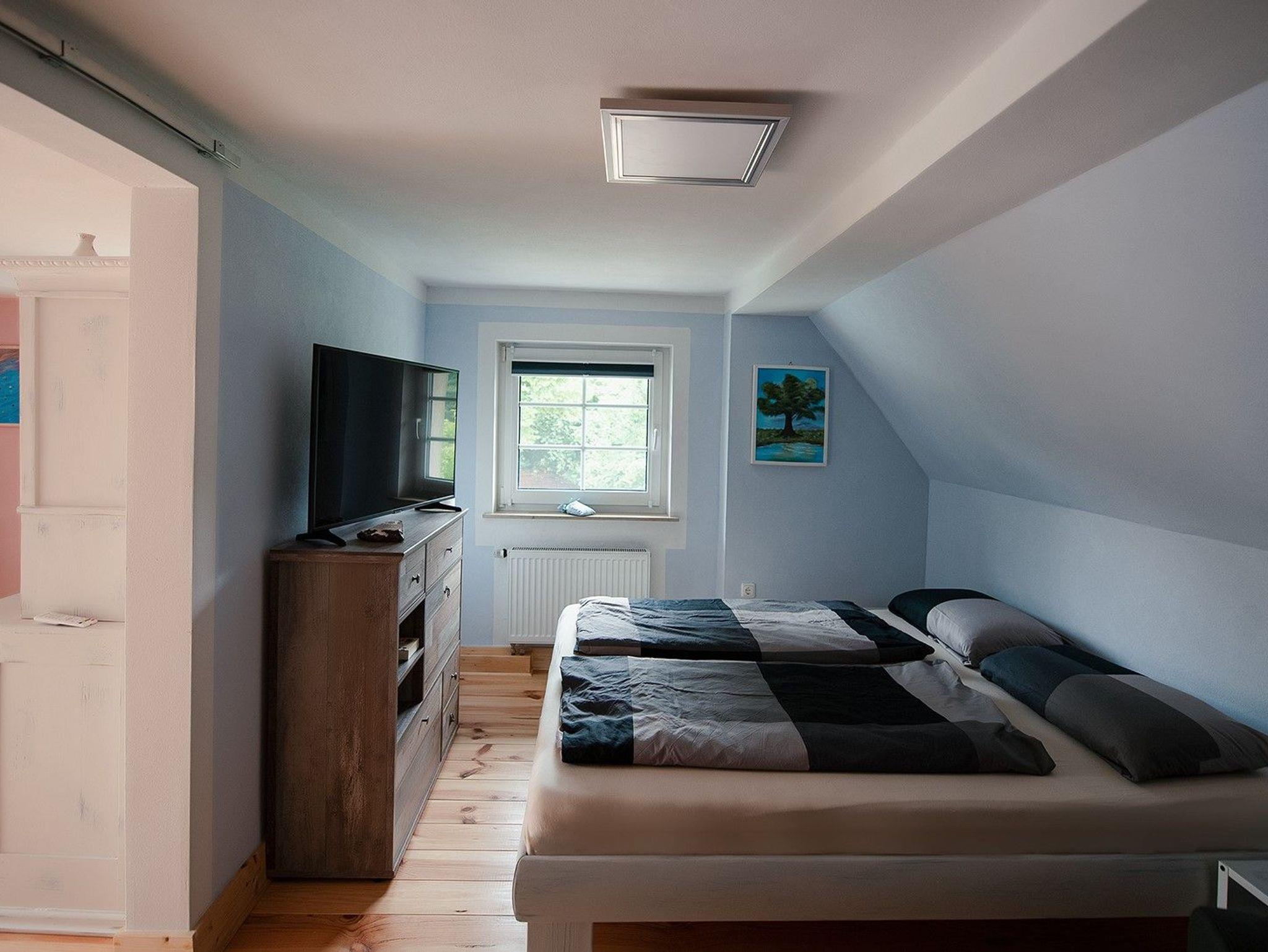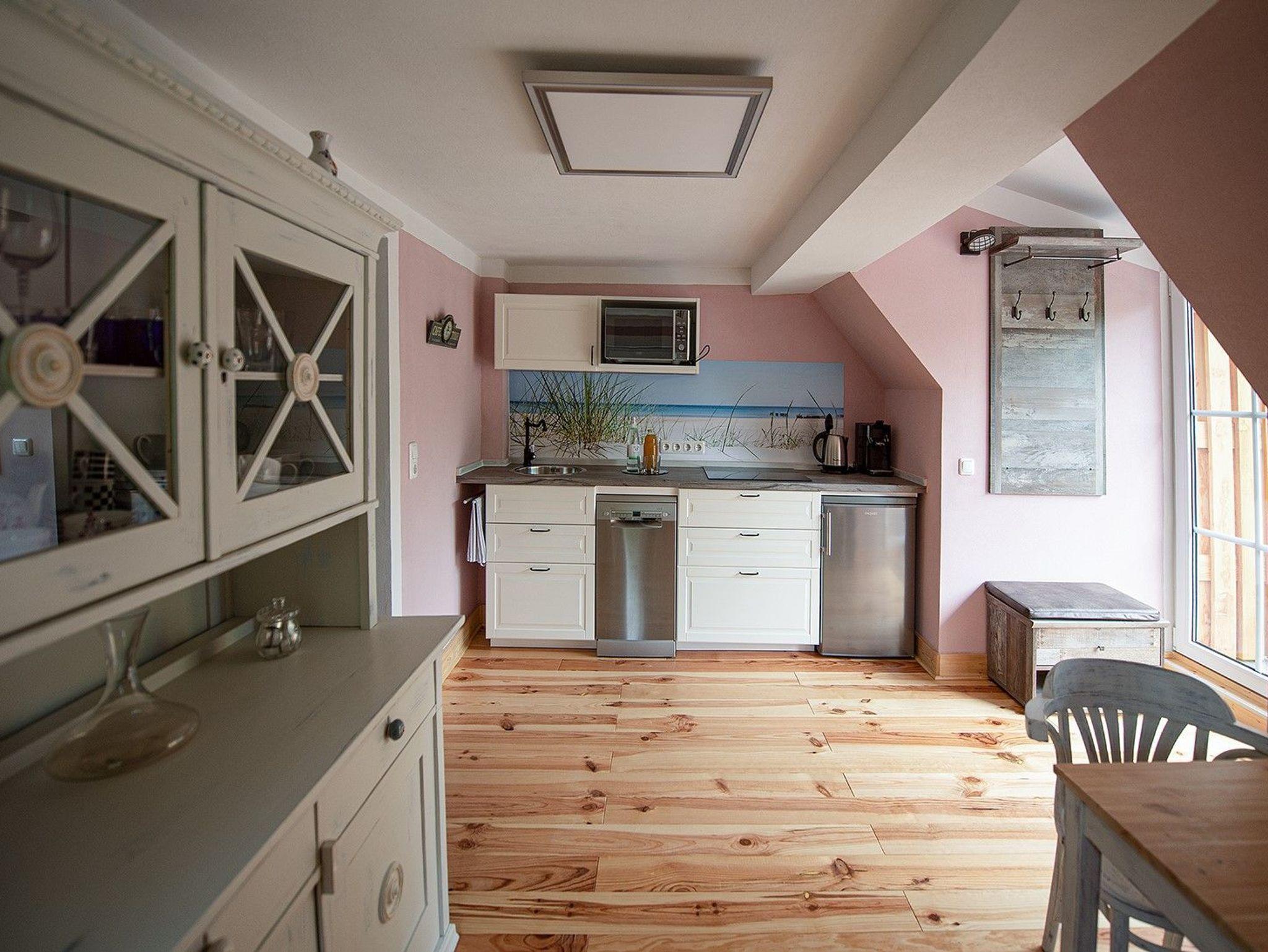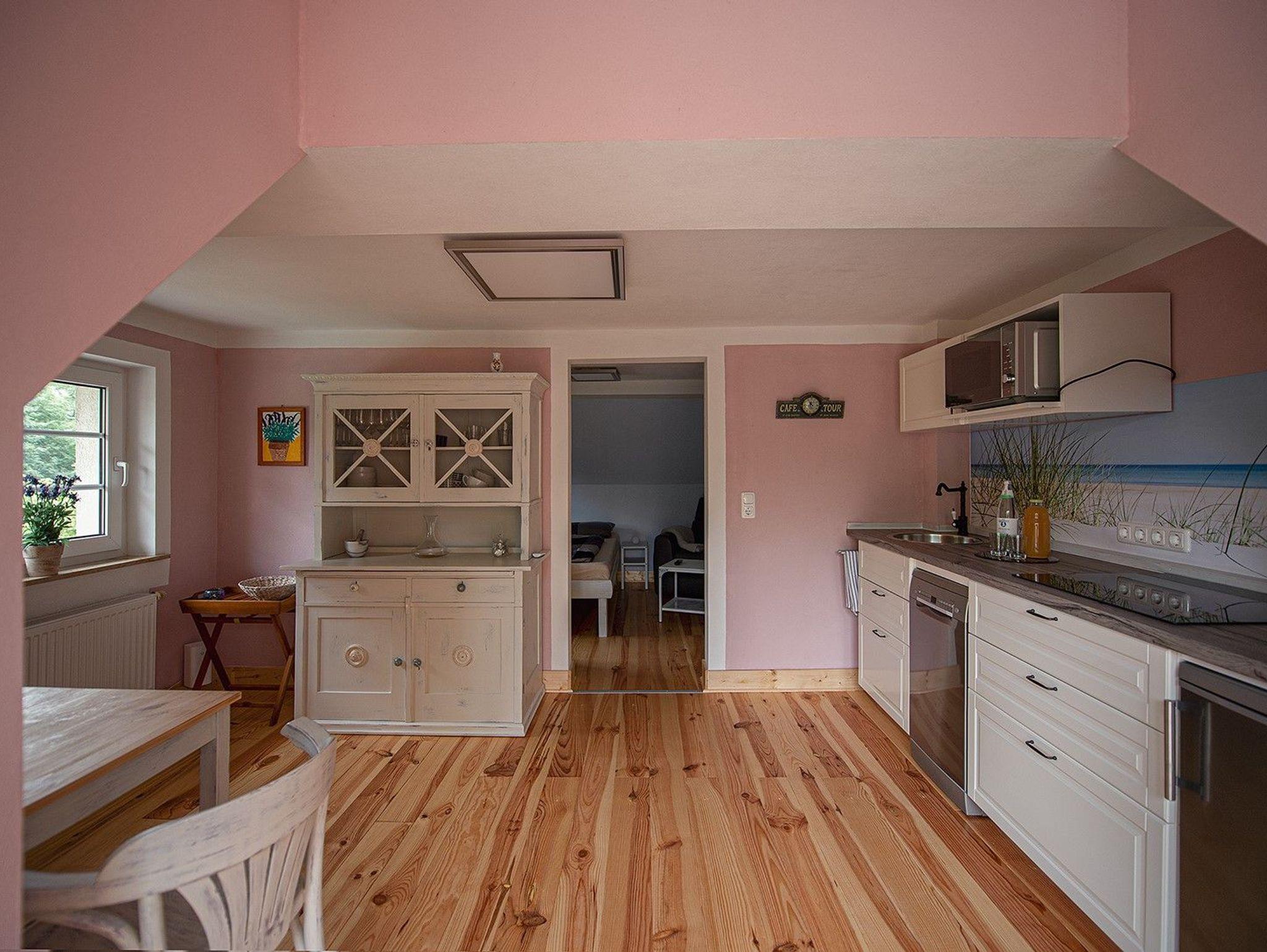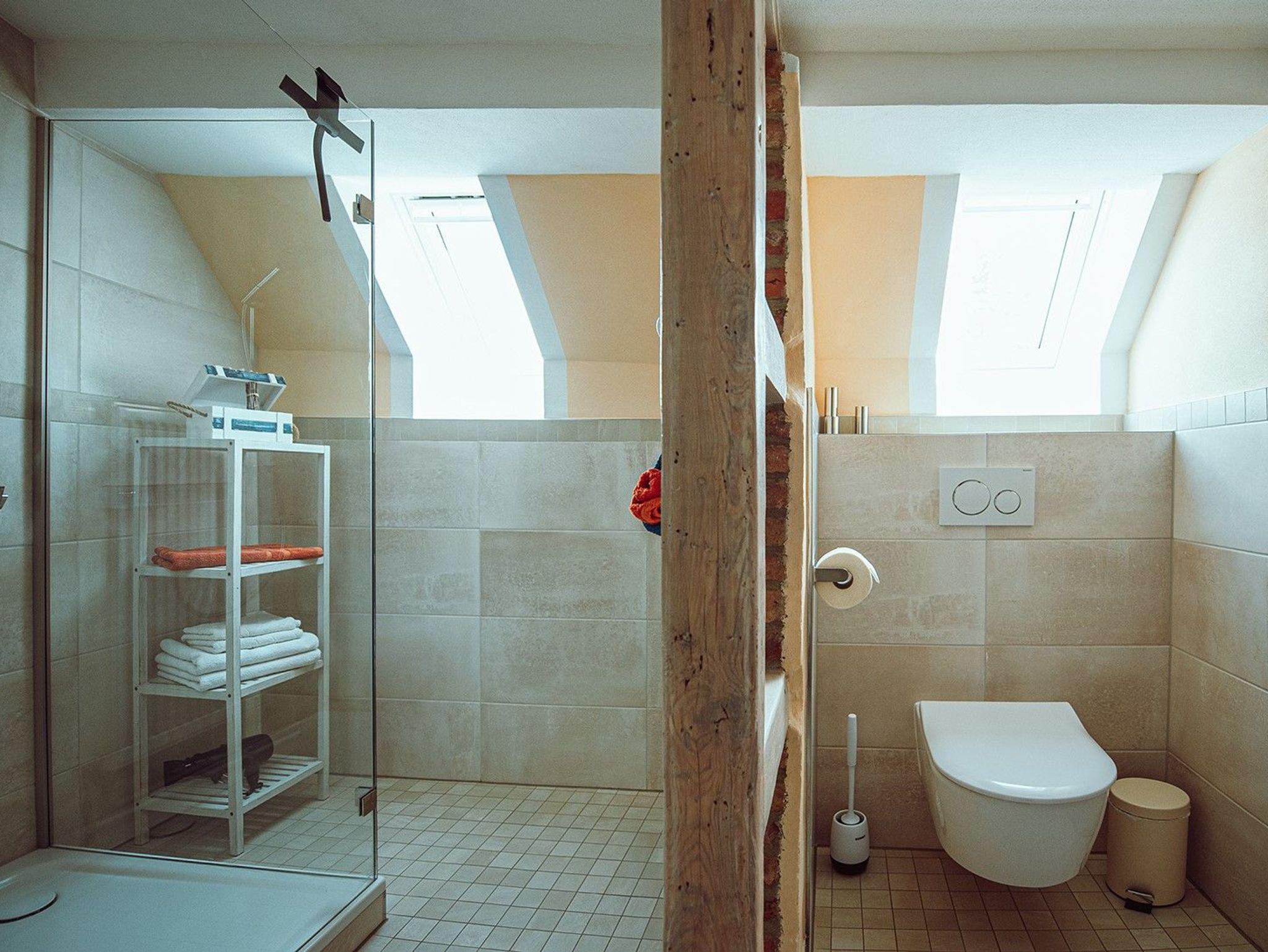 Die Ferienwohnung liegt im 1. OG und der Zugang erfolgt über eine breite Außentreppe und die zur Ferienwohnung gehörige Dachterrasse. Da es sich um einen typischen Gutsverwalterhof aus dem Jahr 1860 handelt, sind die Decken in der Ferienwohnung nur 2,05m hoch. Bitte beachten Sie dies bei der Auswahl der Wohnung!