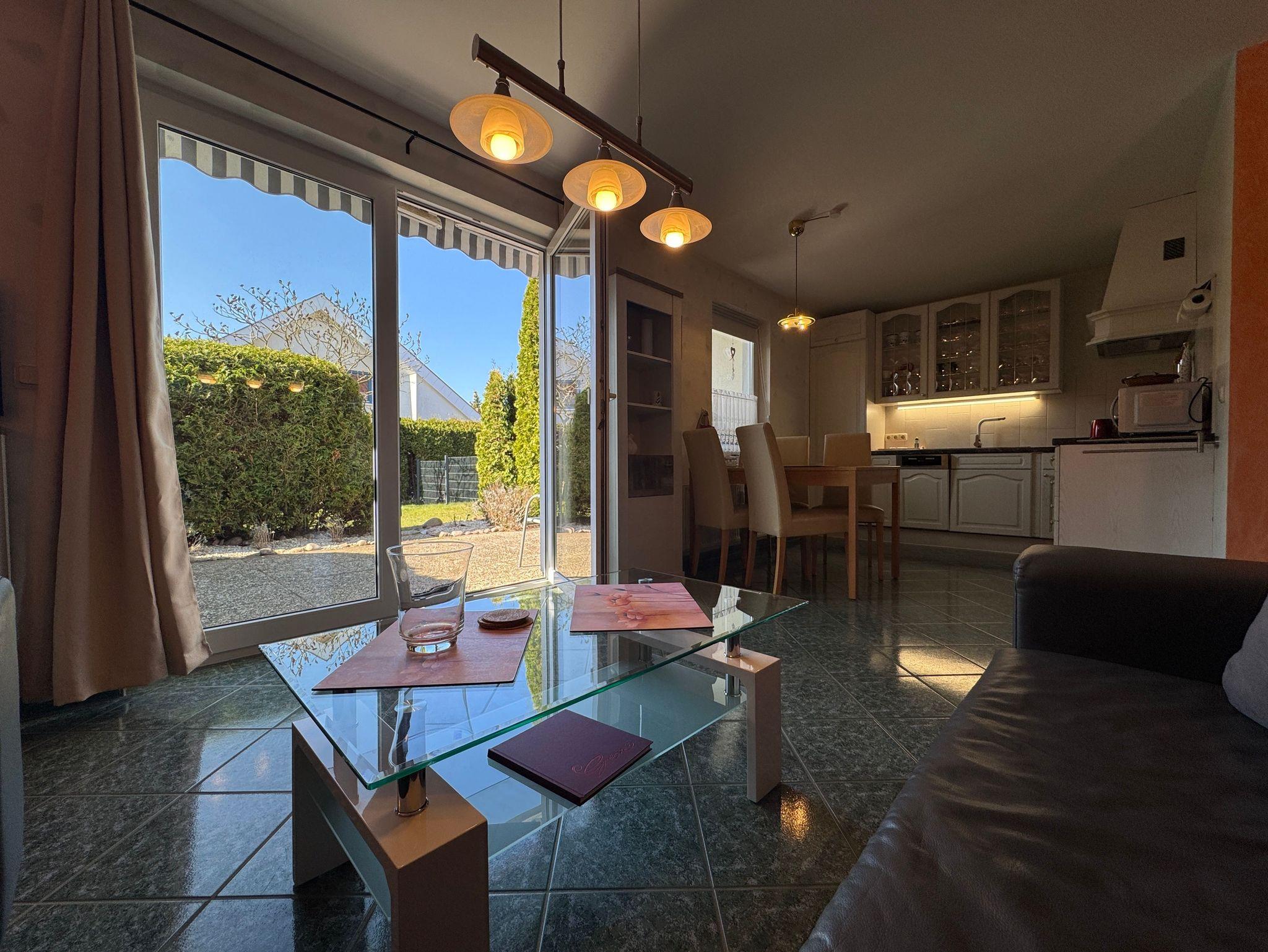 Offener Wohnbereich, voll ausgestattete Küchenzeile, Terrasse, zwei Schlafräume, Duschbad/ WC.