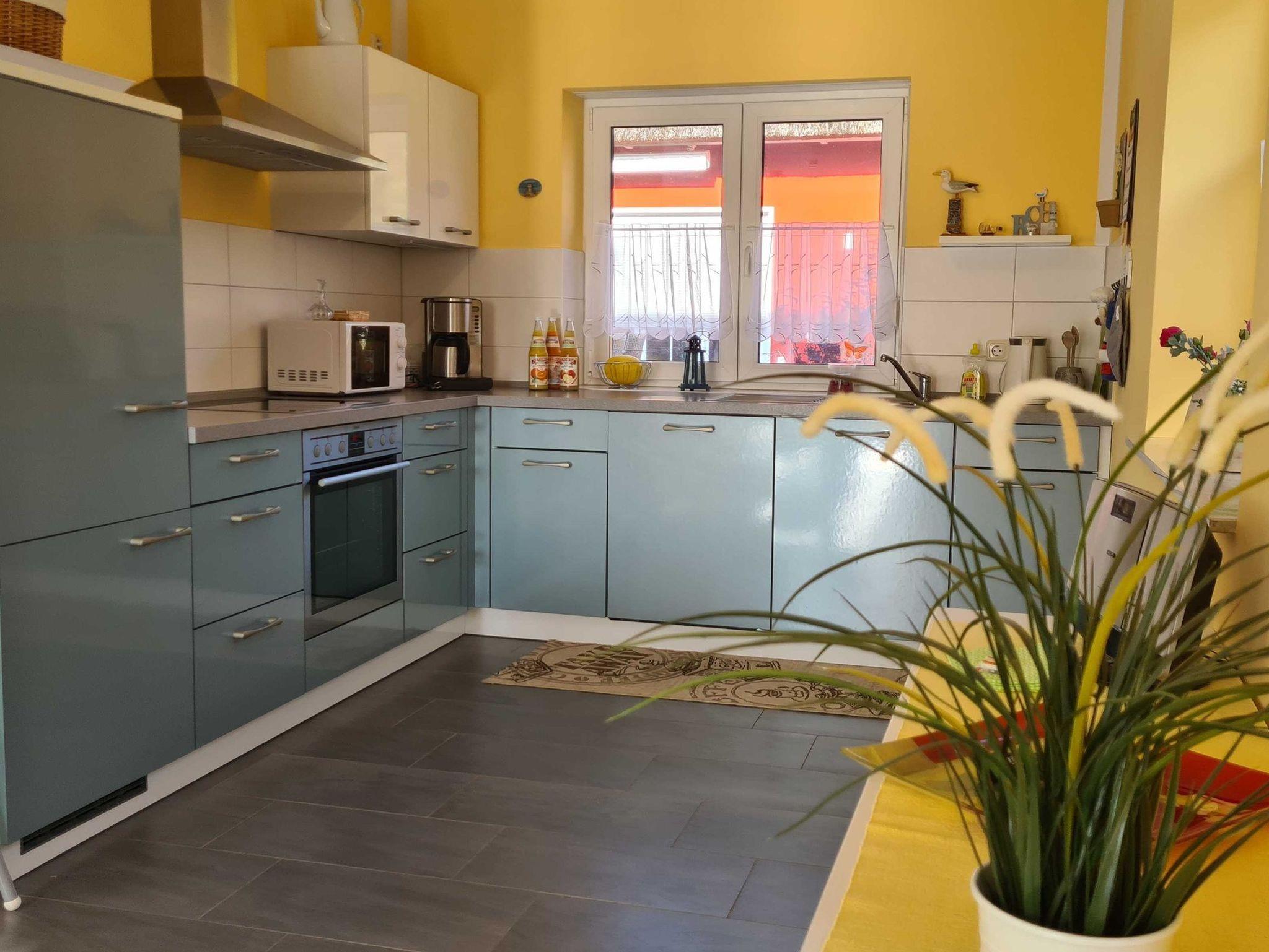 Küchenzeile mit Geschirrspüler, Backofen, Ceran-Kochfeld, Mikrowelle, Kaffeemaschine, Wasserkocher sowie Koch-und Essgeschirr ausgestattet.