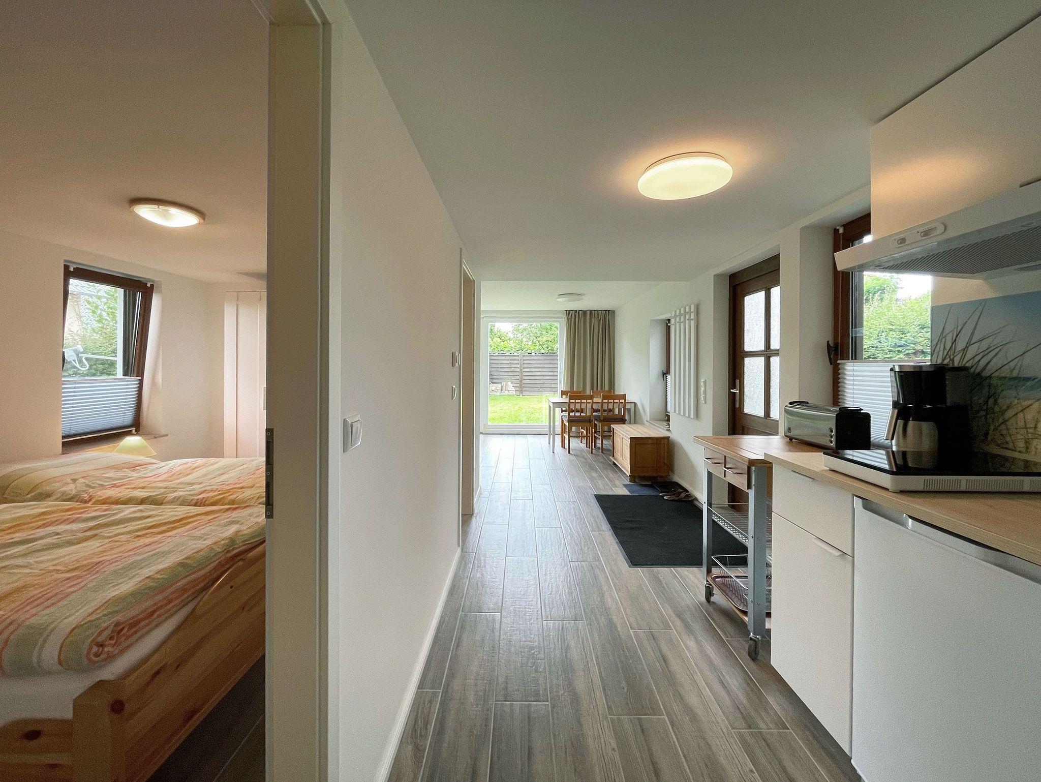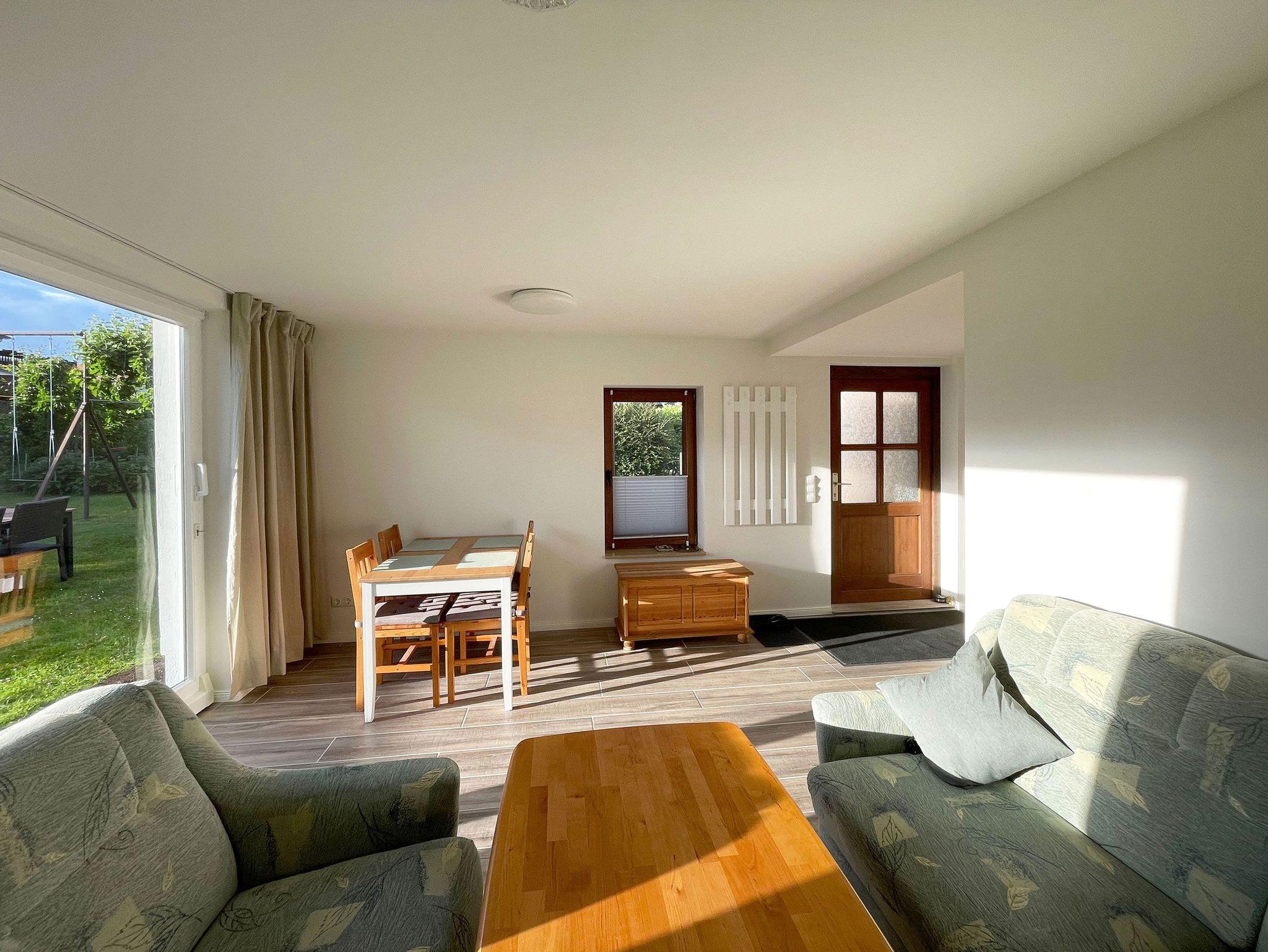 1 Wohn-/Esszimmer mit integrierter Küchenzeile, Doppelschlafcouch, Sessel, Esstisch, großer Glasschiebetür mit Zugang in den Garten, SAT-TV und Radio