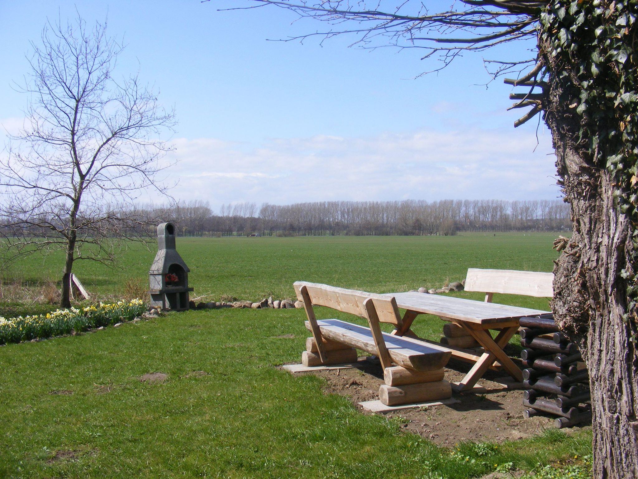 Der große Garten verfügt über eine Liegewiese und einen Grillplatz mit Blick zum Salzhaff.