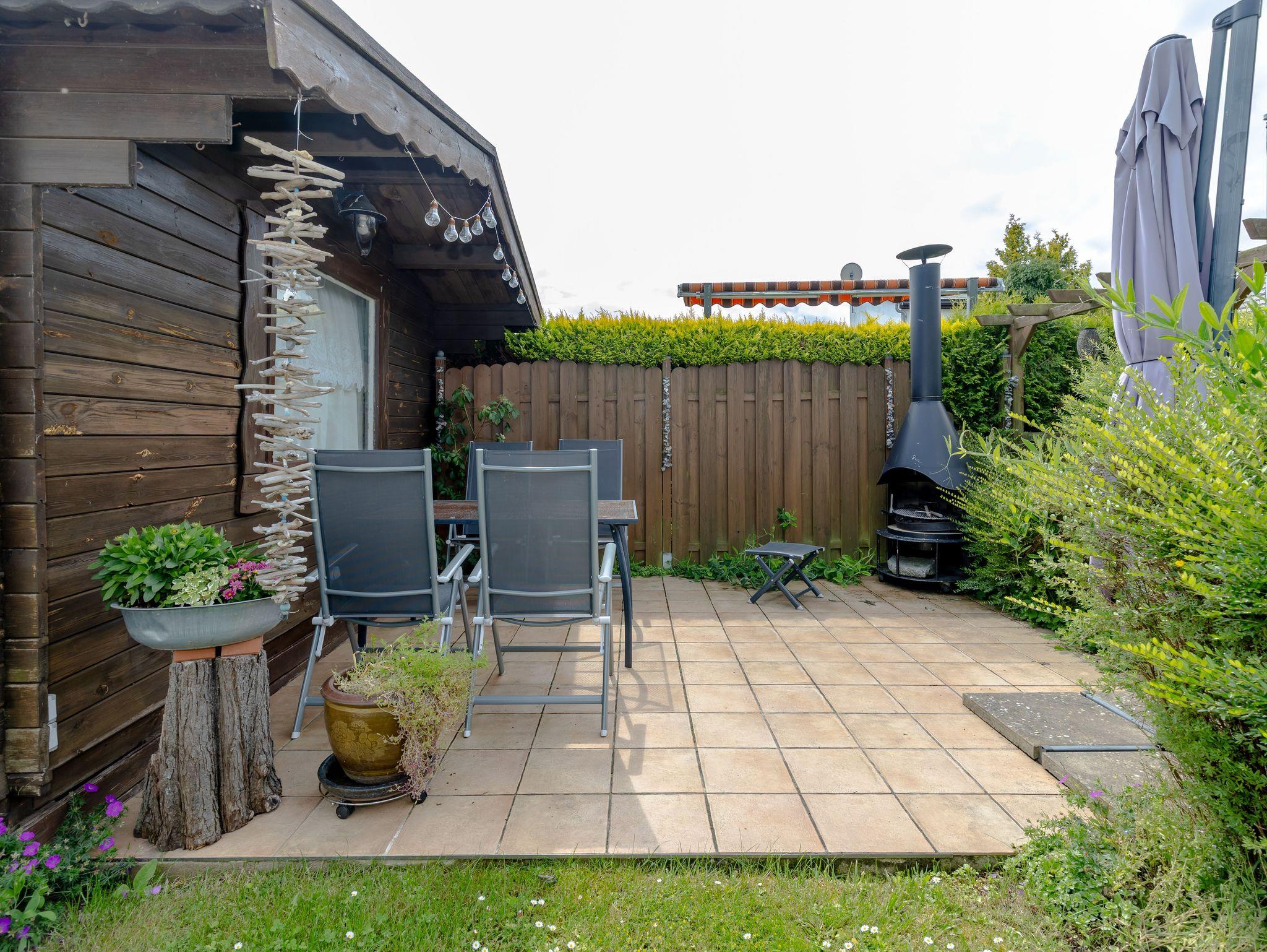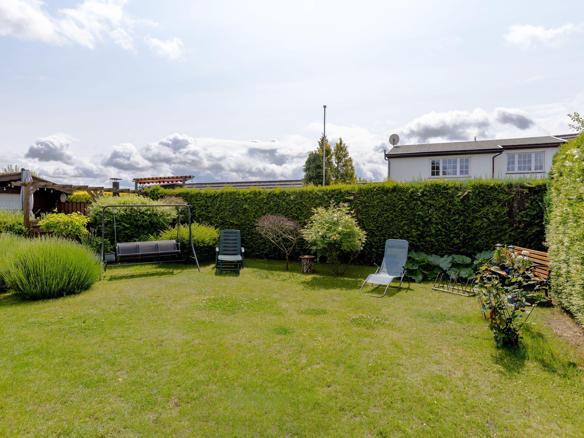 Zu dieser Wohnung gehört eine Gartenterrasse und Sitzgelegenheiten im Garten, zum Sonnetanken, Lesen oder zum Lauschen des Vogelgezwitschers.