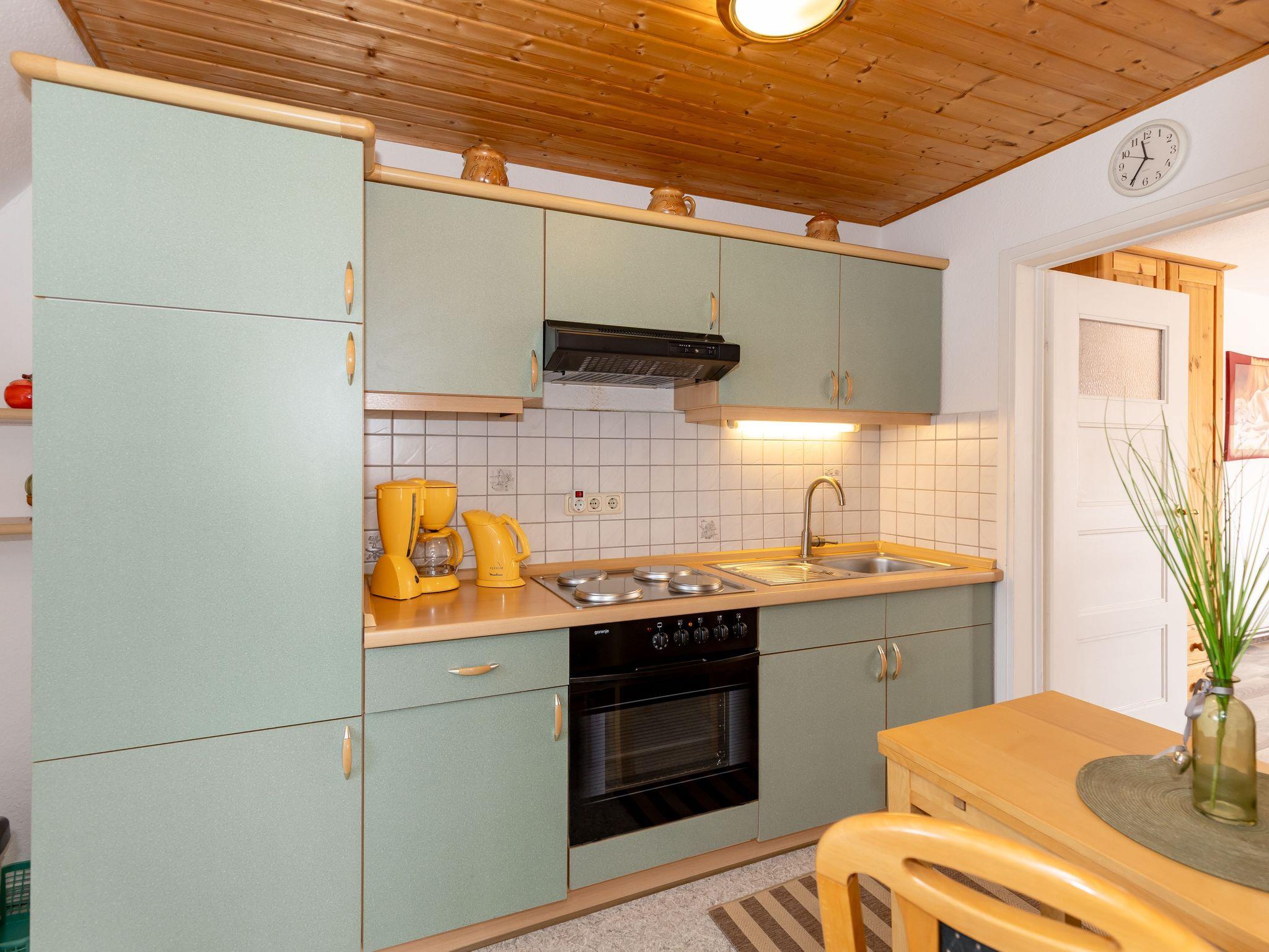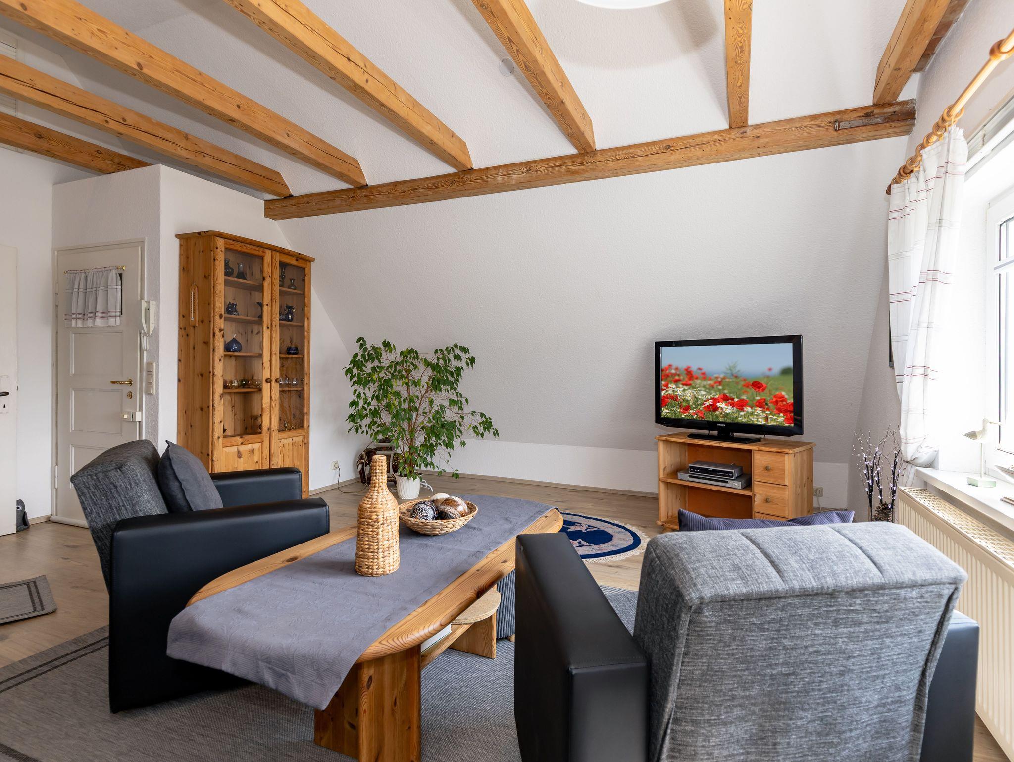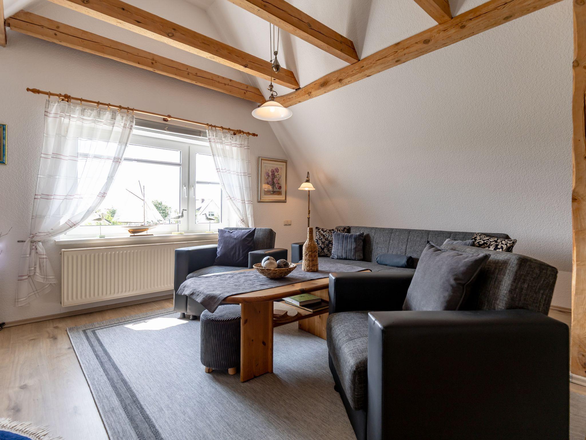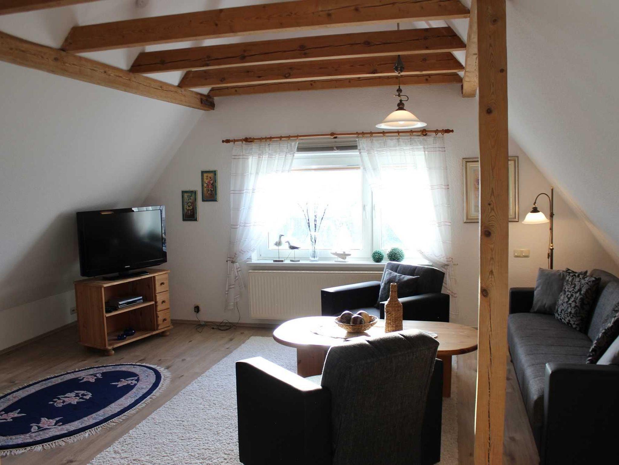 Das Wohnzimmer verfügt über eine moderne und sehr bequeme Couchgarnitur, einen Tv mit Sat-Anschluss, sowie ein CD-Radio. Durch das ausgebaute Spitzdach und die Herausarbeitung der Dachbalken bekommt das Wohnzimmer ein wohlig warmes Ambiente. Vom Wohnzimmer aus gelangen Sie in die separate, voll ausgestattete Küche mit Wasserkocher, Kaffeemaschine, Toaster, 4-Platten-Kochfeld, Backofen, Kühlschrank (ohne Gefrierfach), ausreichend Geschirr und Kochutensilien. Tisch und Stühle sind ebenfalls vorhanden.