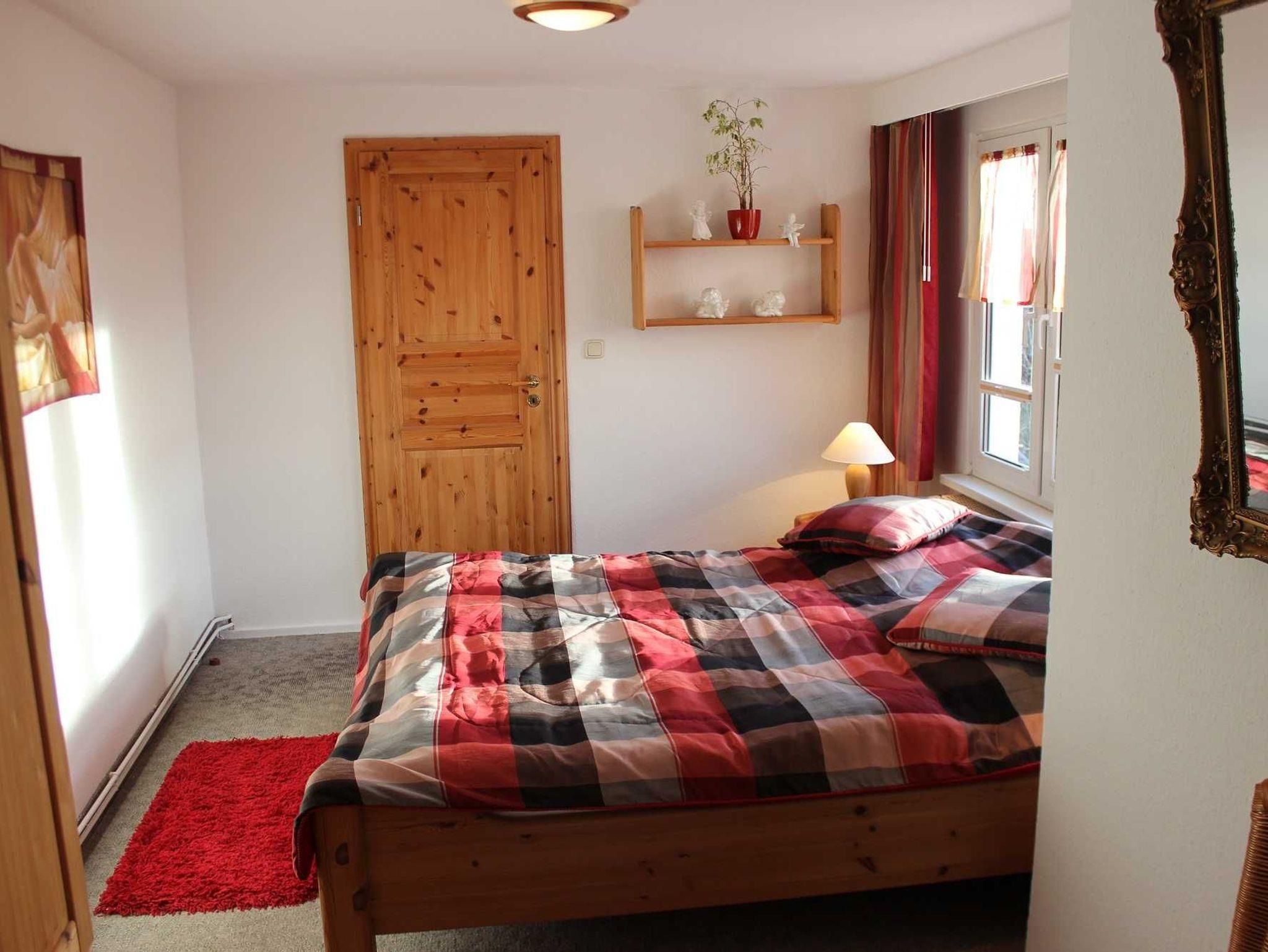 Das Schlafzimmer ist ausgestattet mit einem Kleiderschrank, einem Ganzkörperspiegel, einem Doppelbett (1,80 x 2,00) mit manuell verstellbaren Lattenrosten und einem herrlichen Blick in den Garten. Hier können Sie abends gemeinsam die Sternschnuppen zählen und werden morgens von der Sonne wachgekitzelt.
