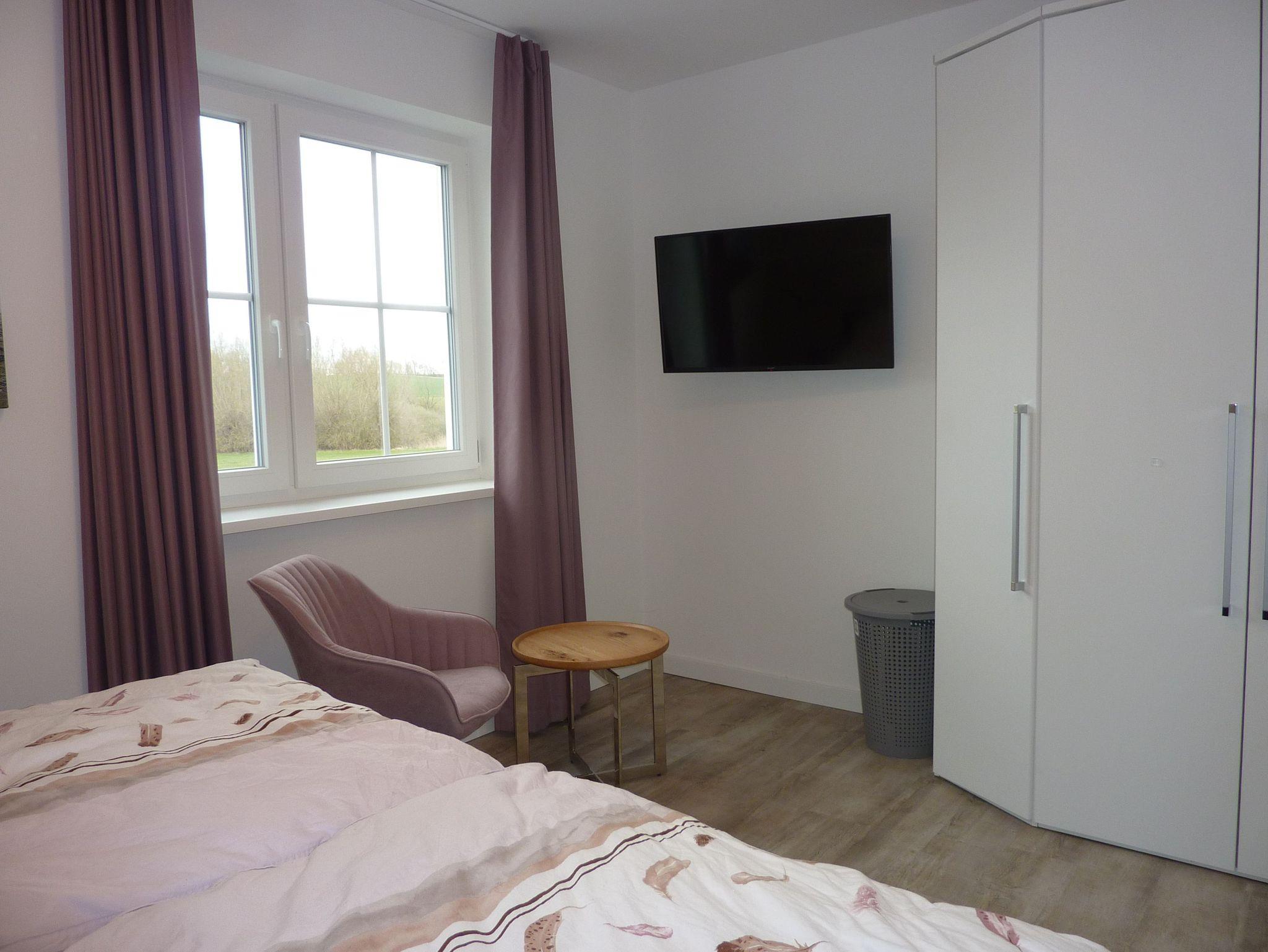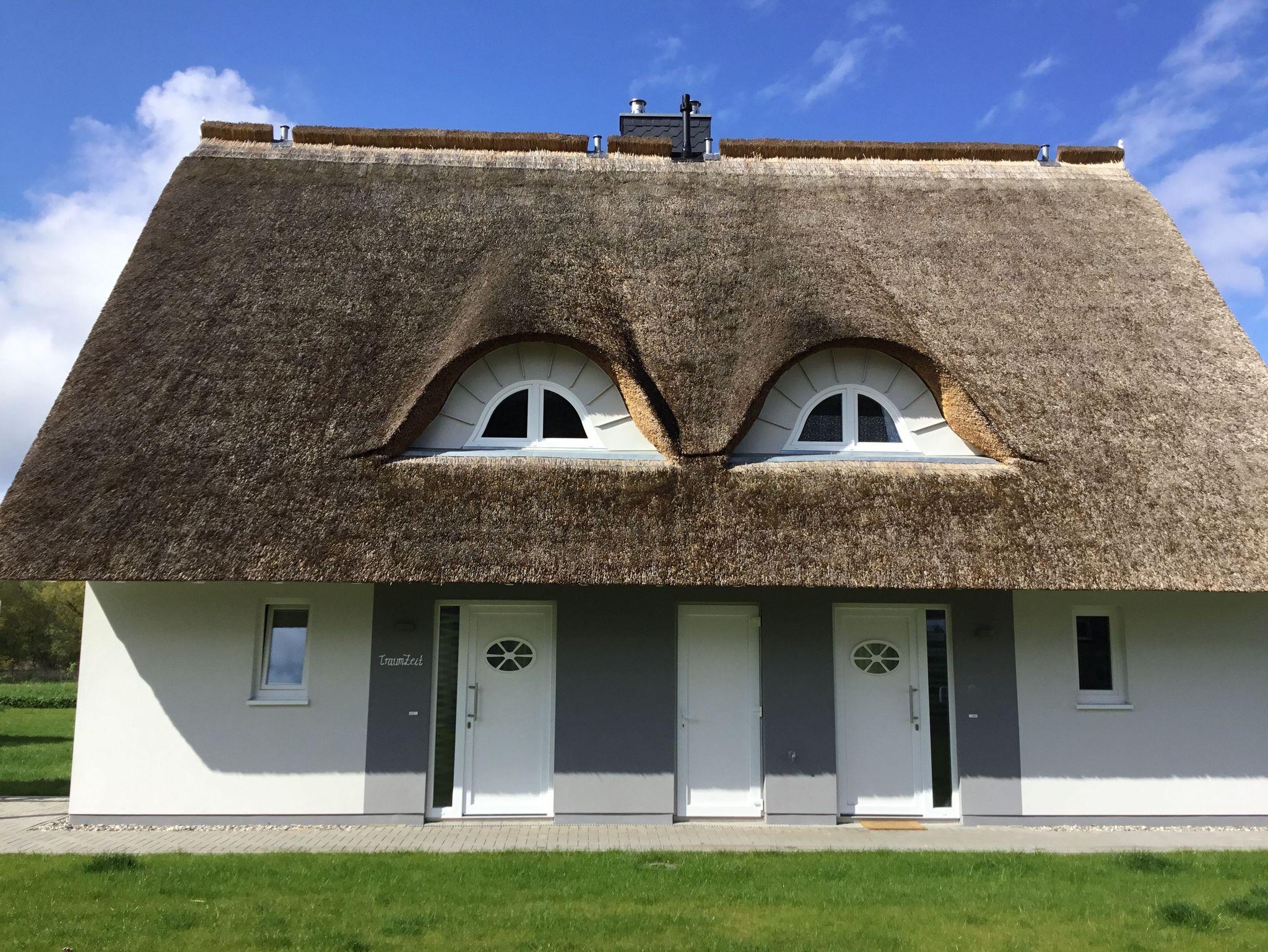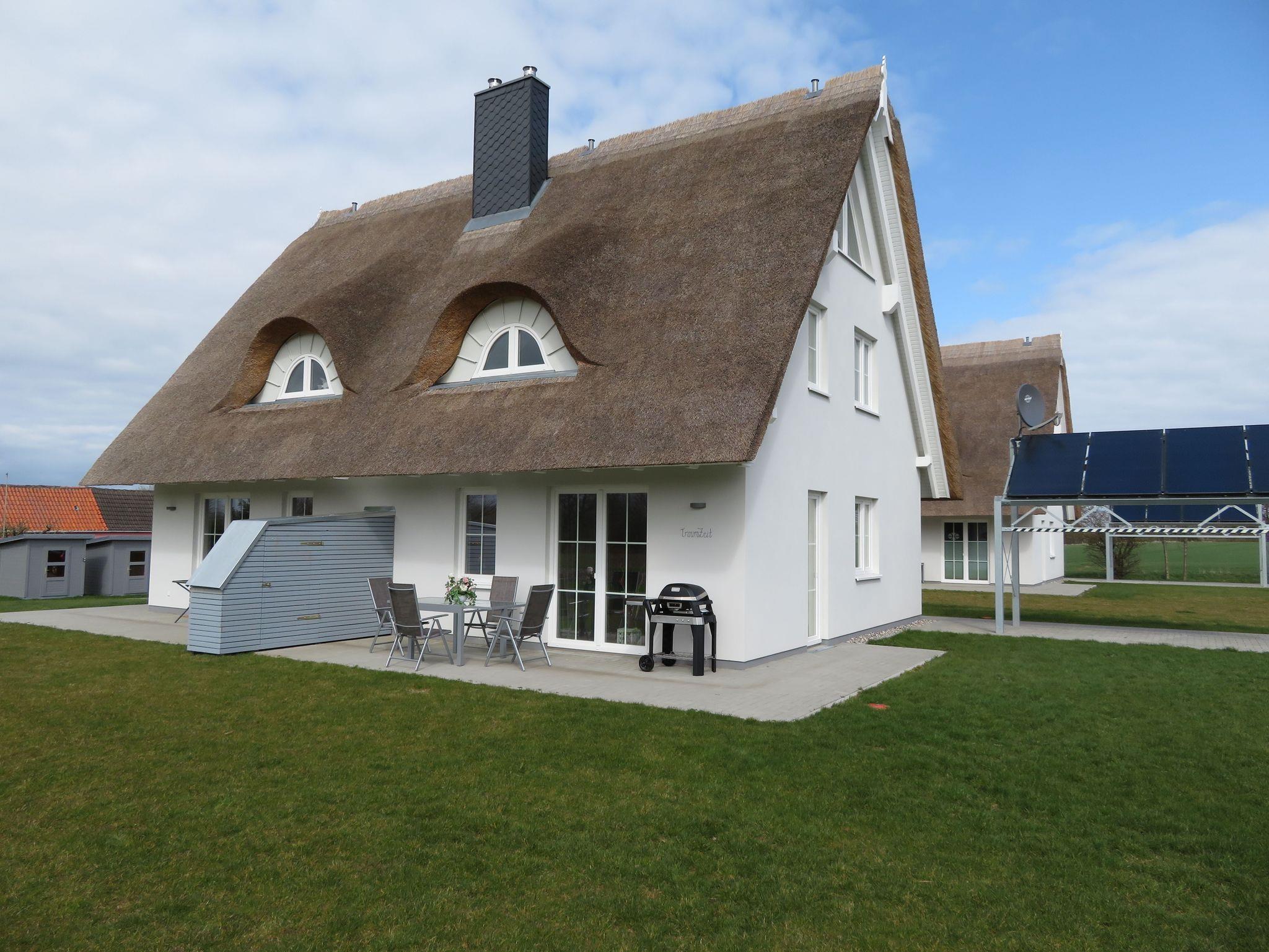 neu erbaute Reetdoppelhaushälfte (Baujahr 2020, Erstvermietung 2021) mit Flair auf großzügigem Grundstück in idyllischem Ort für Naturliebhaber, Ruhe- und Entspannungssuchende, modern eingerichtet, beide Schlafzimmer mit Doppelbetten und hochwertigen, bequemen Federkernmatratzen, Badezimmer (EG, OG) mit ebenerdiger Dusche und Tageslichtfenstern, großer Kicker und Sitzsäcke im Spitzboden, freier Blick in die Natur auf der Süd-West-Terrasse mit ausziehbarem Tisch, Premium Weber-Außengrill (Elektro) steht zur Verfügung, große Rasenfläche lädt zum Spielen ein, abschließbarer Schuppen mit Strom zum Aufladen von E-Bikes vorhanden, Waschmaschine mit integriertem Trockner kann ohne Zusatzkosten genutzt werden, Naturstrand ist fußläufig in ca. 10-15 min zu erreichen, zwei Surfschulen (auch Kitesurfen) in der Nähe