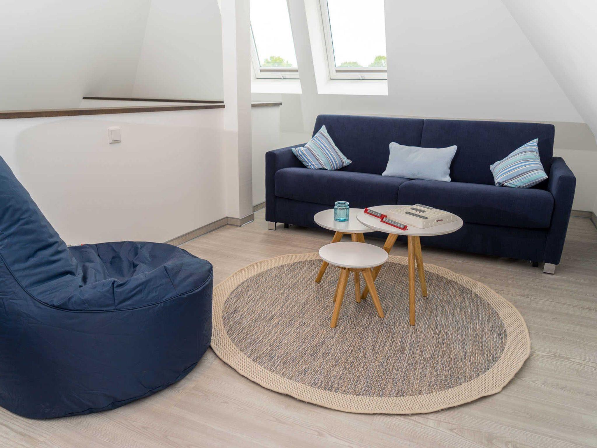 Die offene Galerie ist ein gemütlicher Rückzugsort, ausgestattet mit einem hochwertigen Schlafsofa und kuscheligen Sitzen. Ein Schreibtisch bietet ausreichend Platz zum Arbeiten und kann als Mobile Office genutzt werden.