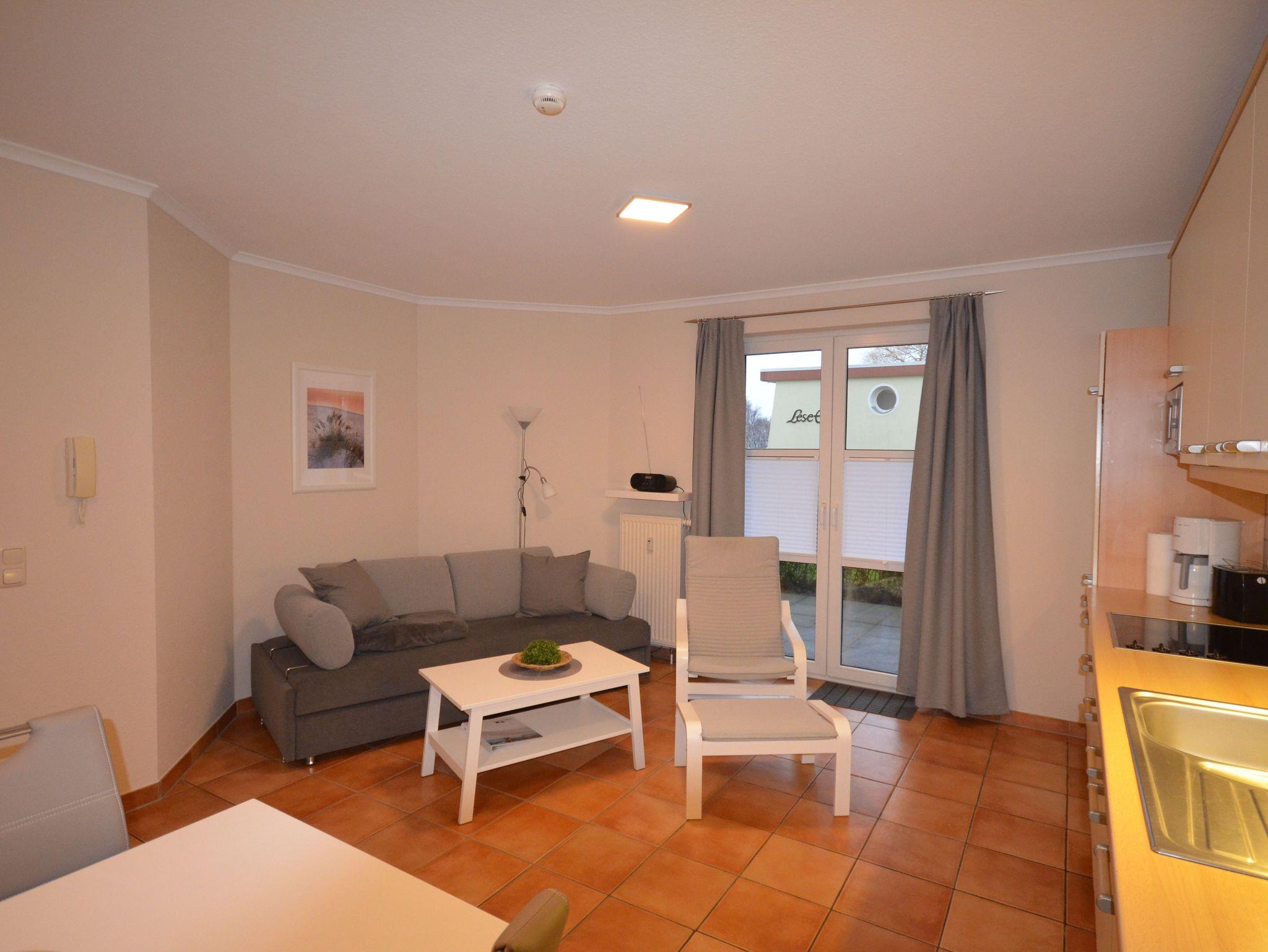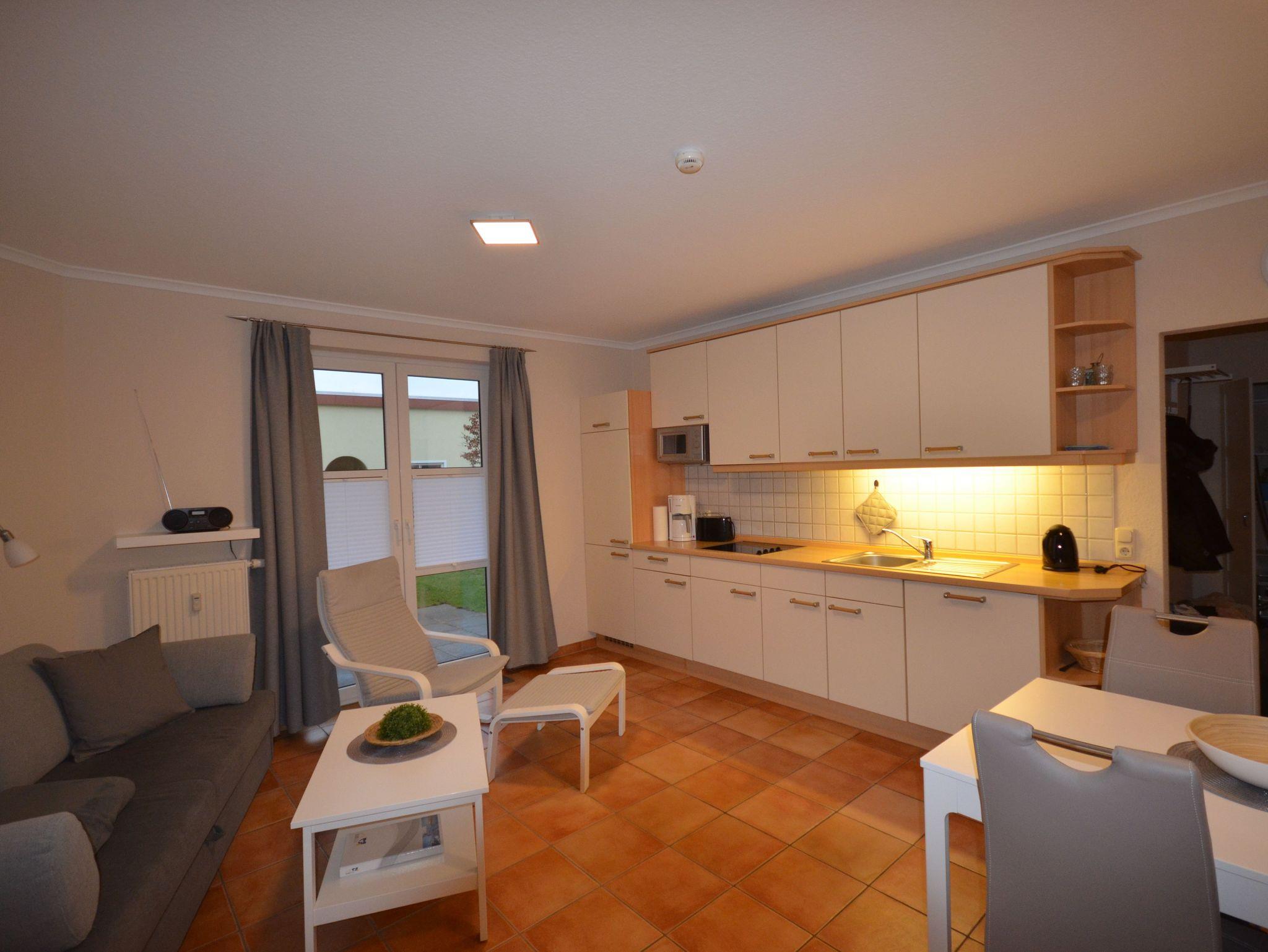 Kleine moderne Ferienwohnung mit Terrasse, einem Schlafzimmer sowie einer Schlafcouch im Wohn-Essbereich für insgesamt 4 Personen. In der Küchenzeile stehen neben der Spülmaschine und dem Herd natürlich auch eine Mikrowelle, eine Kaffee- und Senseo-Kaffeemaschine zur Verfügung. Fernseher, Radio, sind ebenso vorhanden, wie kostenfreies WLAN.