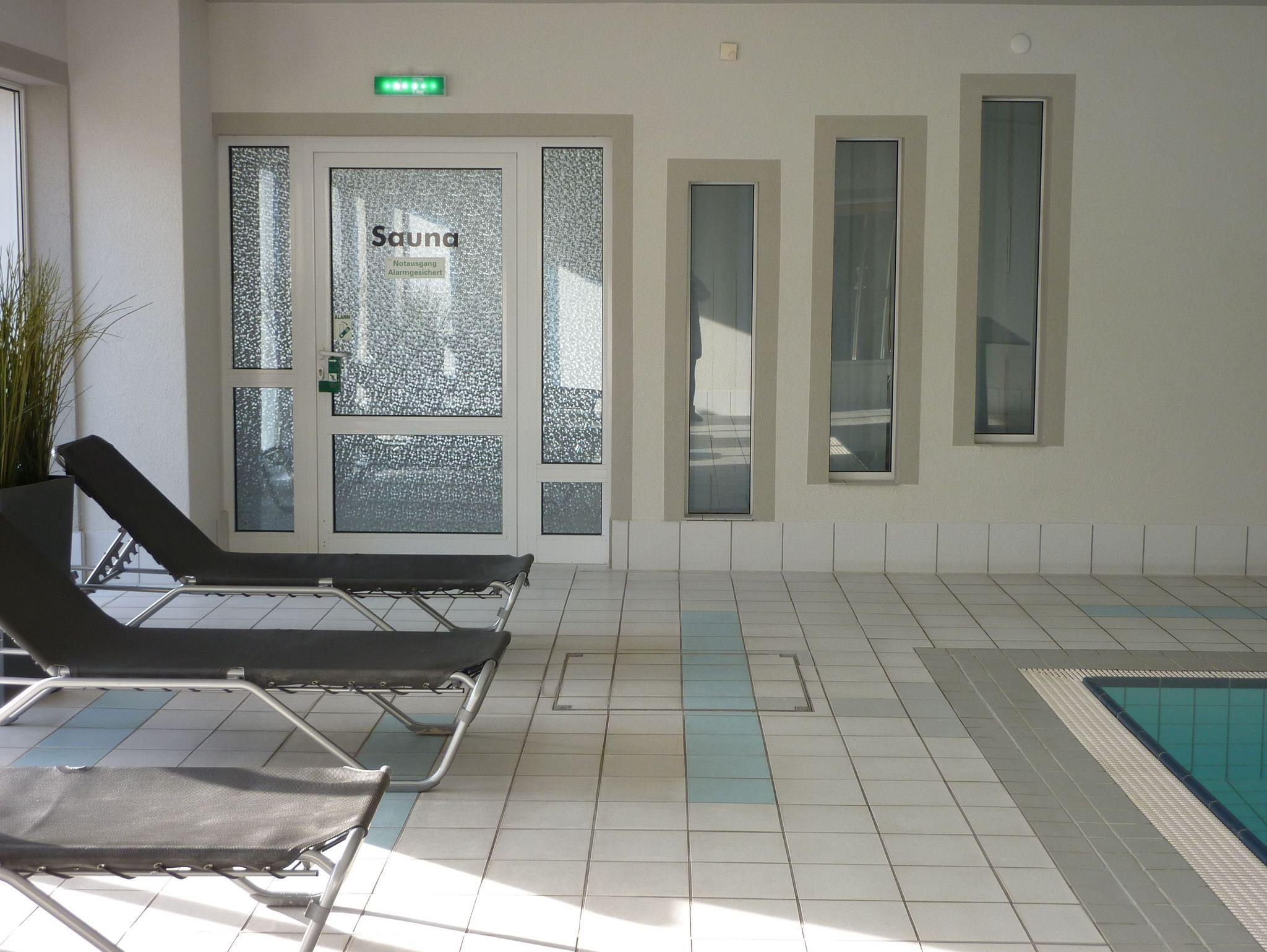 Das Schwimmbad (täglich) sowie der Saunabereich (Die., Fr., Sa.) können kostenfrei im Kurhaus direkt nebenan mitbenutzt werden.