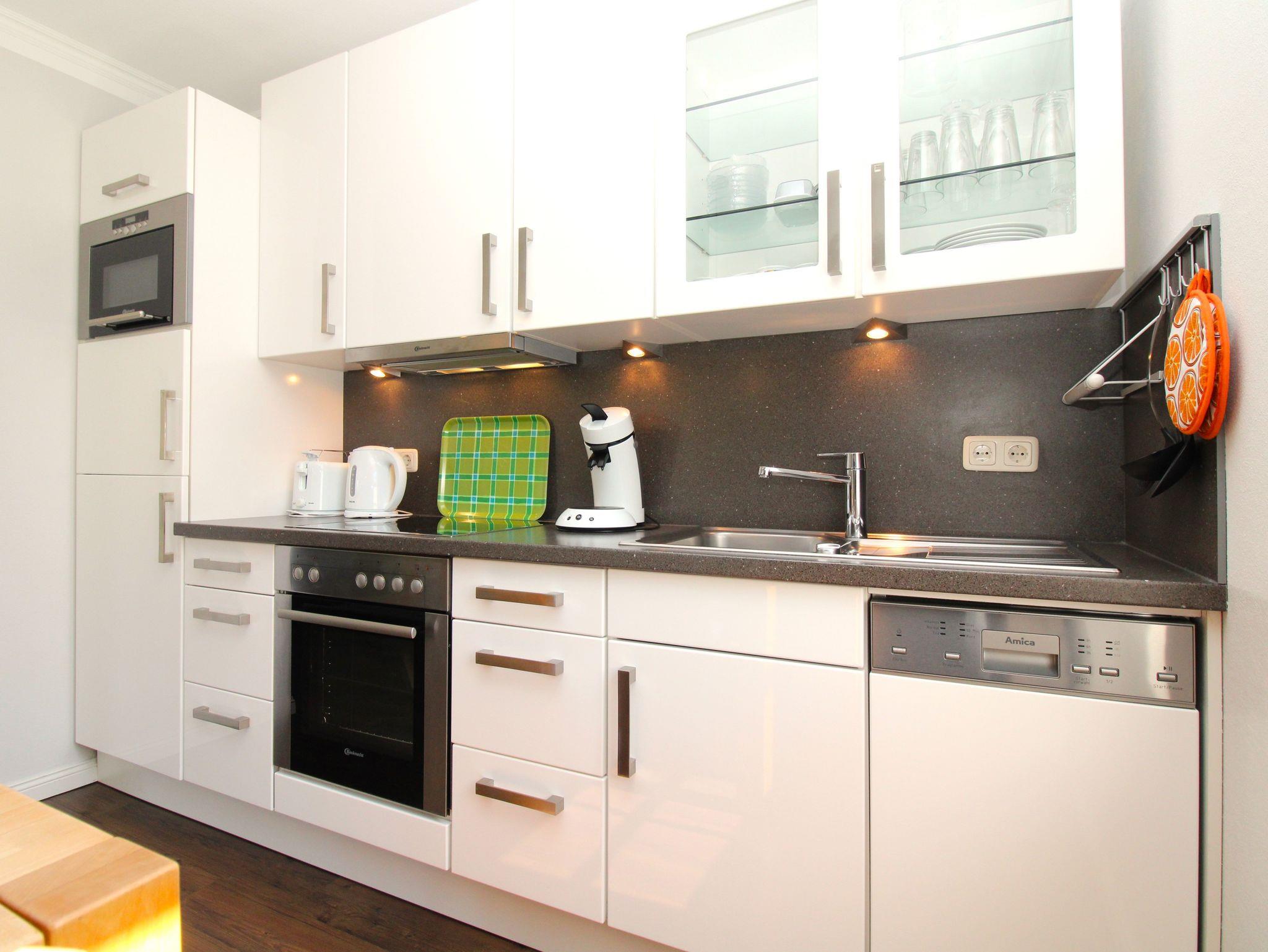 Das Wohnzimmer wird durch bodentiefe Fenstertüren lichtdurchflutet und bietet direkten Zugang zur großzügigen Terrasse mit Südost- Ausrichtung. Die angeschlossene und offene Einbauküche ist komplett ausgestattet mit Backofen, Ceranfeld, Wasserkocher, Toaster, Kaffeemaschine, Pad-Maschine, Kühlschrank mit Gefrierfach und einer Mikrowelle.