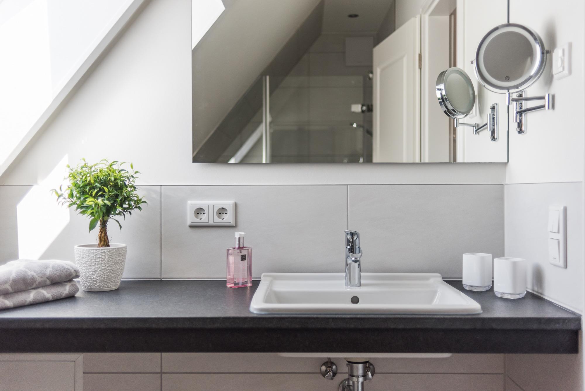 Beide BADEZIMMER verfügen über ebenerdige Dusche, WC, Waschtisch mit Spiegel, Handtuchwärmer und Haartrockner. Im Bad im 1. OG gibt es außerdem einen Waschtrockner zur kostenlosen Nutzung. Die Fußbodenheizung in der gesamten Wohnung sorgt für Wohlbefinden.