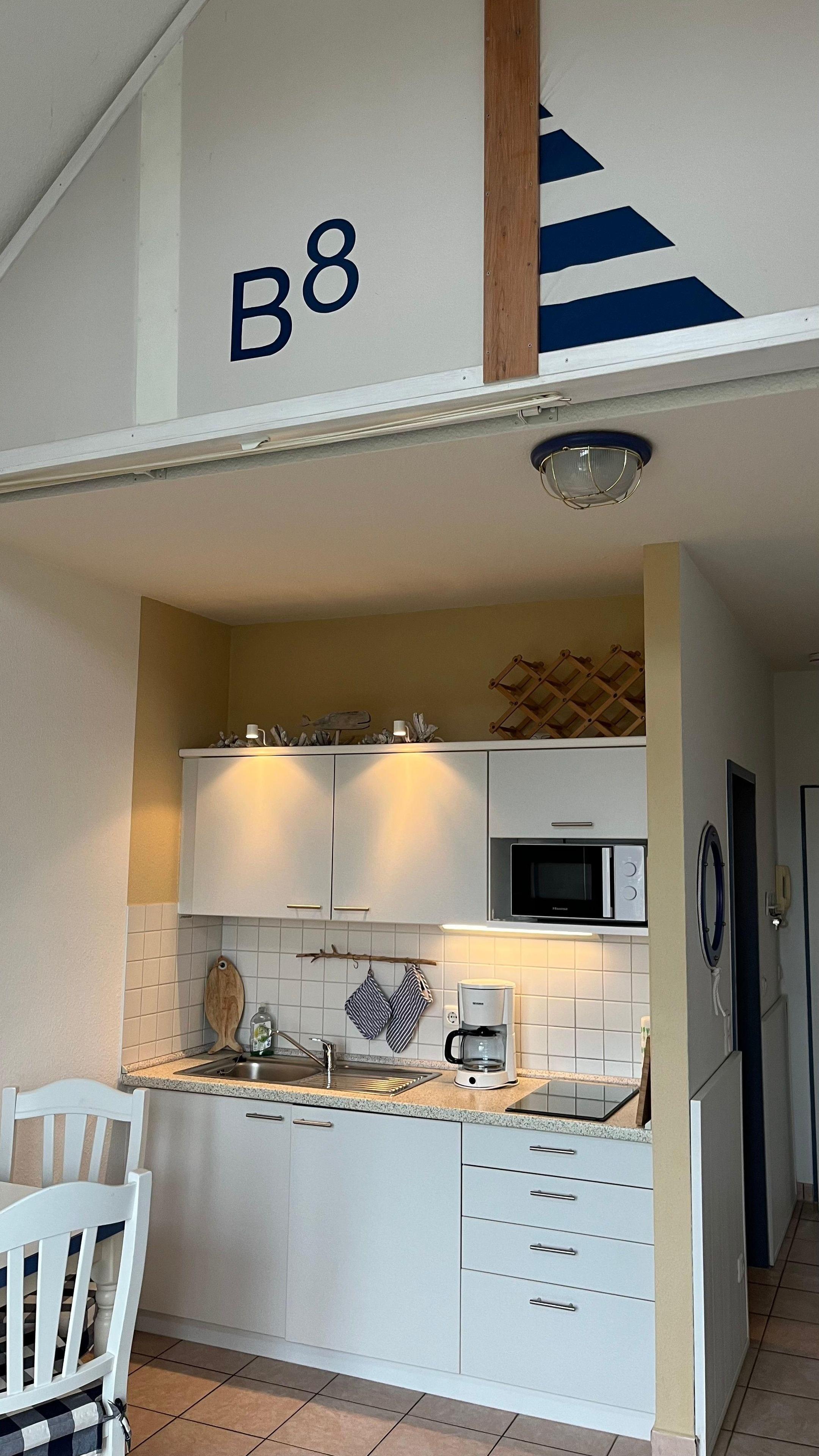Die Küchenzeile ist mit einem Glaskeramikkochfeld, Kühlschrank mit Gefrierfach, Mikrowelle, separatem Minibackofen, Kaffeemaschine, Wasserkocher, Toaster, Eierkocher, Mixer und liebevoll ausgesuchtem Geschirr ausgestattet.