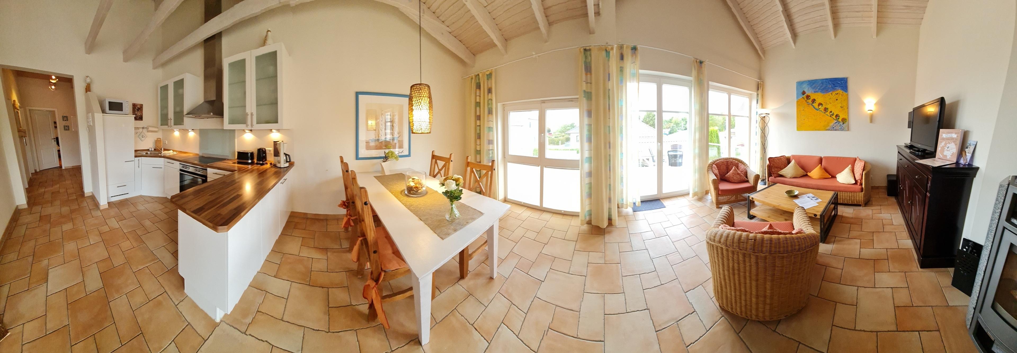 Offene, helle Wohnküche mit Esstisch, gemütlicher Sofaecke, TV und Zugang zum Balkon
