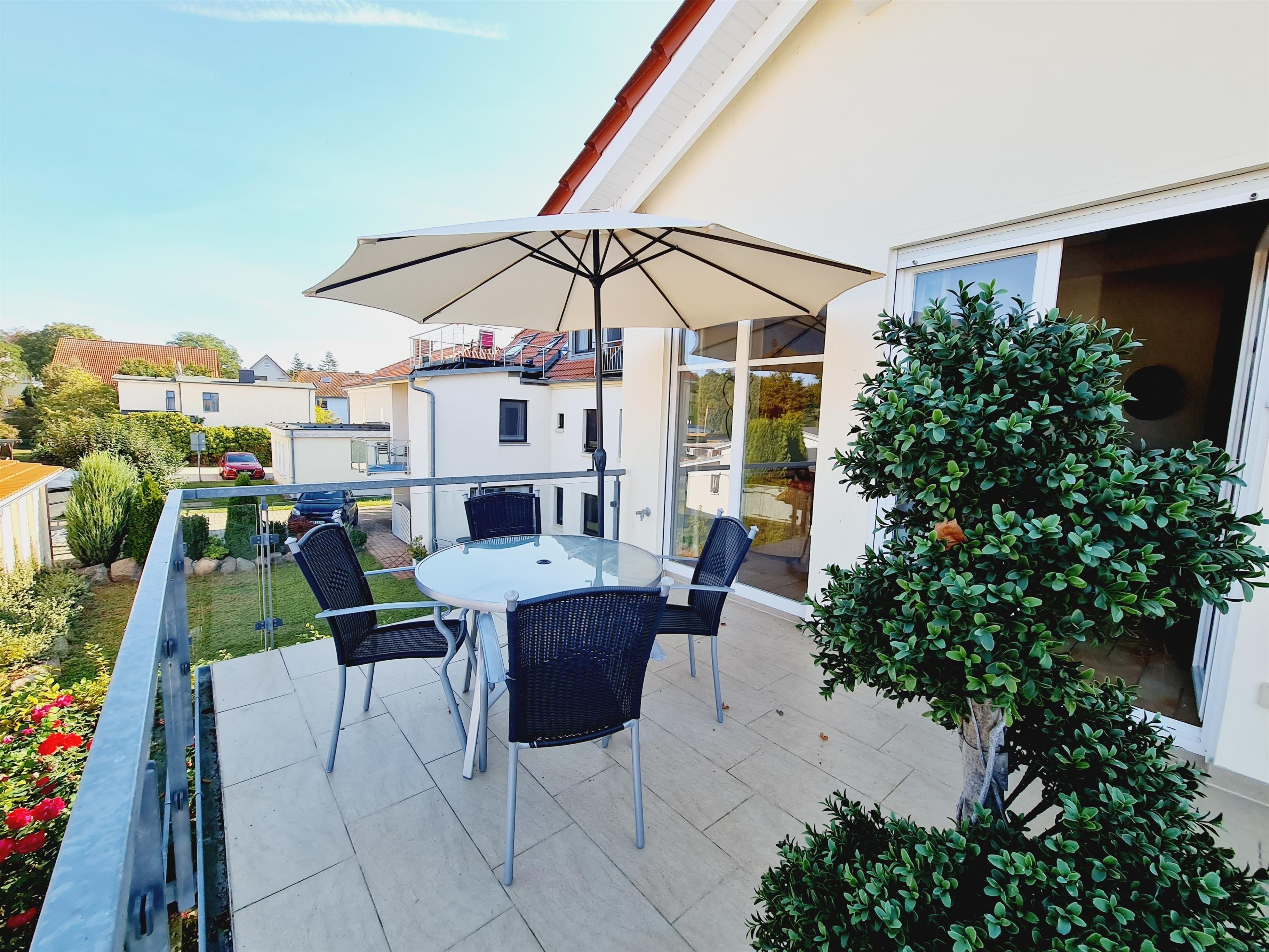 Für das gemeinsame Frühstück auf dem Balkon stehen Ihnen ein Tisch und Stühle zur Verfügung, so wie ein Sonnenschirm.