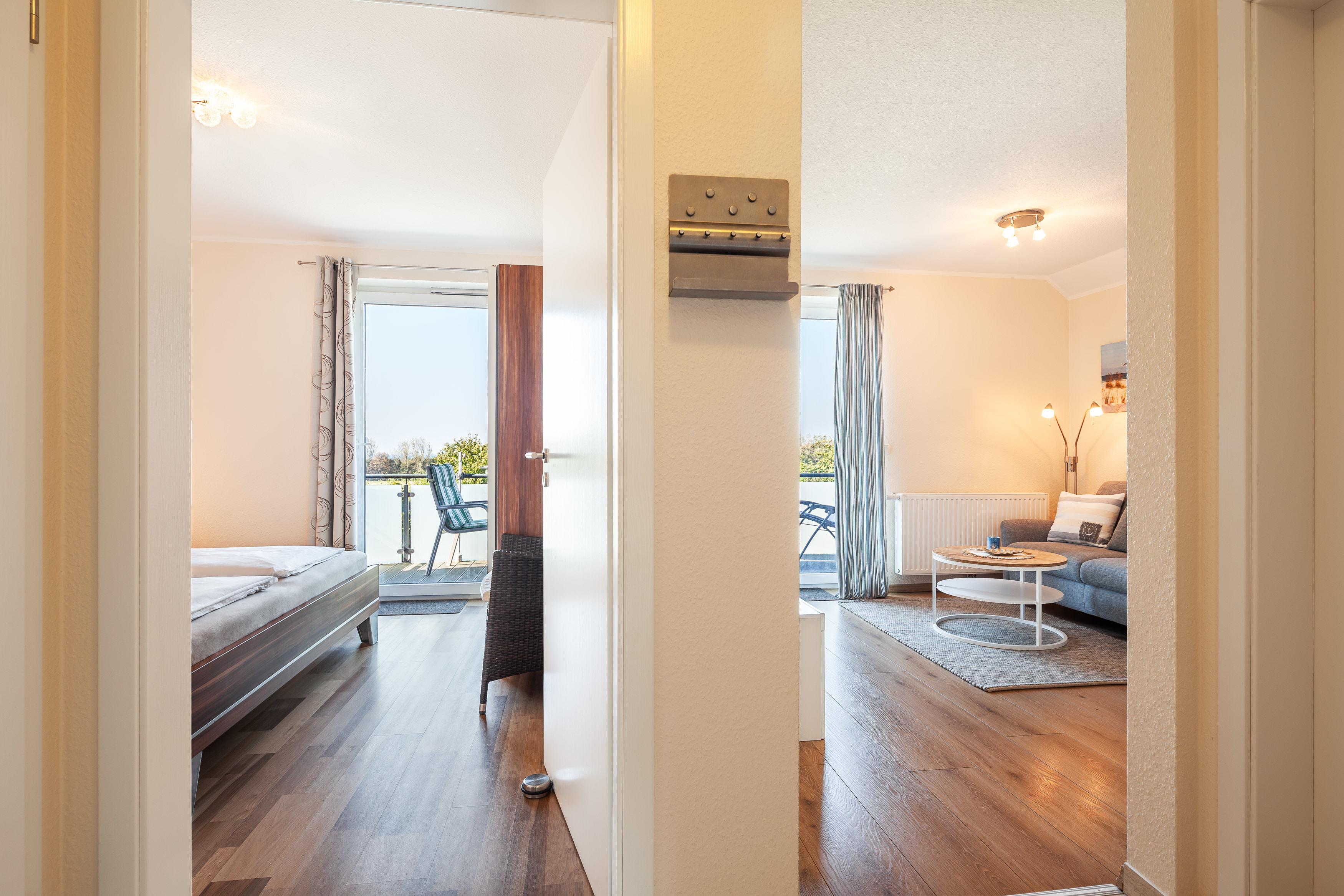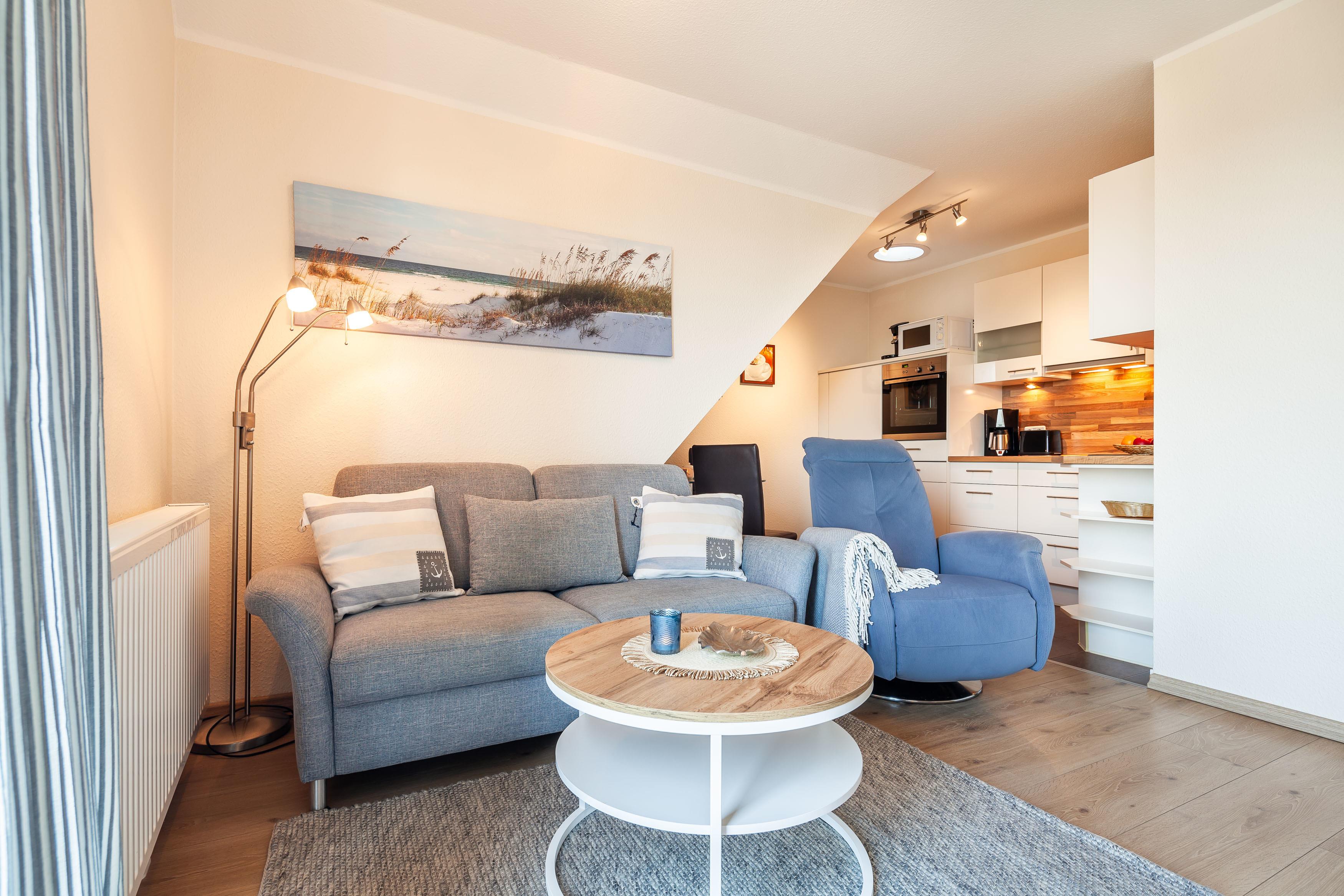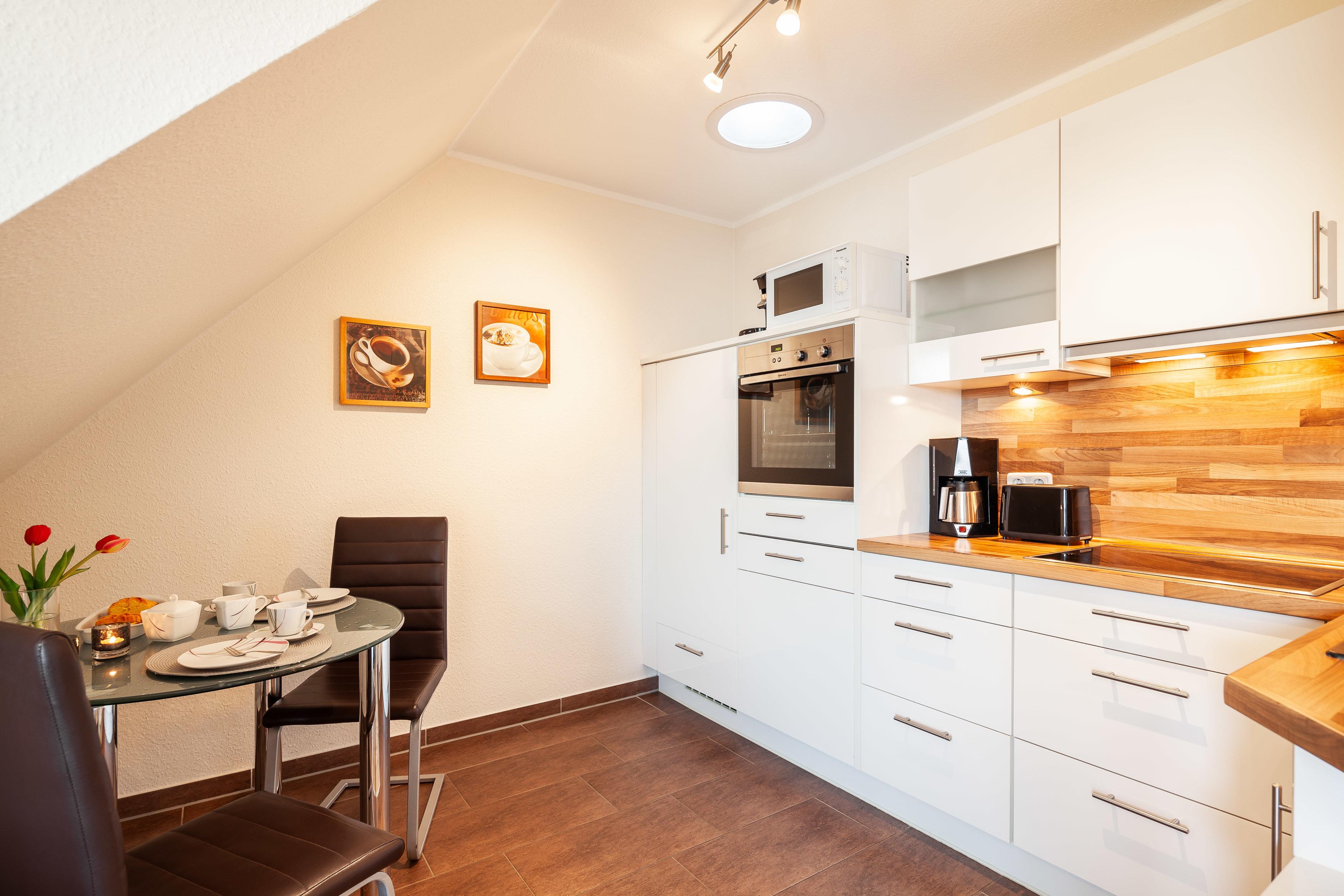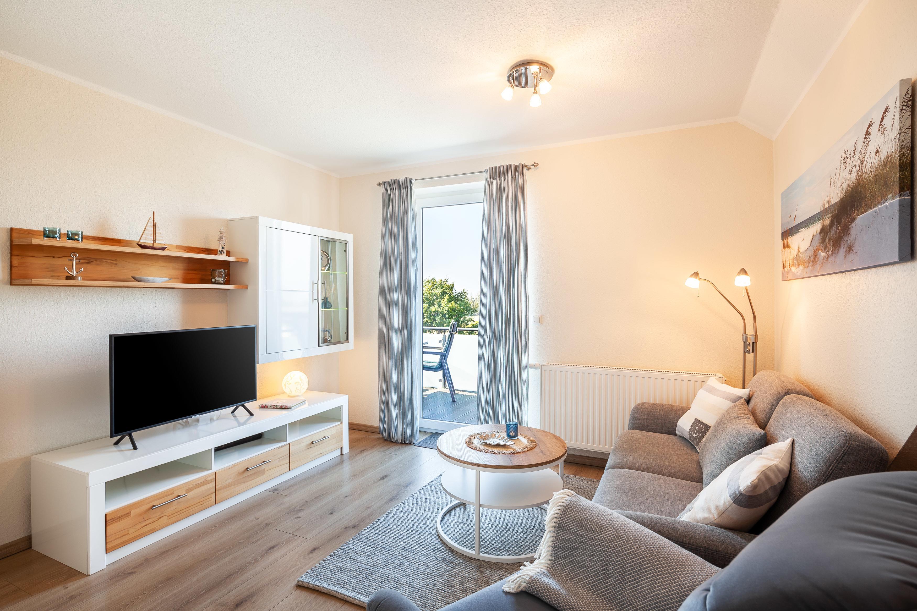 Die Fewo 'Hansekogge' , 36qm, mit einem großen Balkon liegt im Obergeschoss und bietet vom Schlaf- und Wohnzimmer den direkten Zugang zum Balkon mit tollem Ostseeblick. Sie verfügt über ein Schlafzimmer mit einem Doppelbett mit einer Liegefläche von 180 x 200 cm und einem Smart TV. Die offene Küche ist mit allem Komfort wie Geschirrspüler , Kühlschrank mit Gefrierfach, Ceranfeld, erhöhter Backofen, Granitspüle, Kaffeemaschine usw. ausgestattet. Der runde Esstisch mit seiner Glasoberfläche und den bequemen Schwingstühlen bietet Platz für 2 Personen. Der gemütliche Wohnraum ist mit einem komfortablen Sofa und einem bequemen Fernsehsessel eingerichtet. Ein großer LCD-Fernseher, Blu-Ray-Player, sowie Spiele, Bücher und Umgebungskarten sind vorhanden. Das kleine aber feine Badezimmer ist in creme/braun gehalten , mit einem großen Waschtisch, Dusche , Fußbodenheizung und Radio ausgestattet.