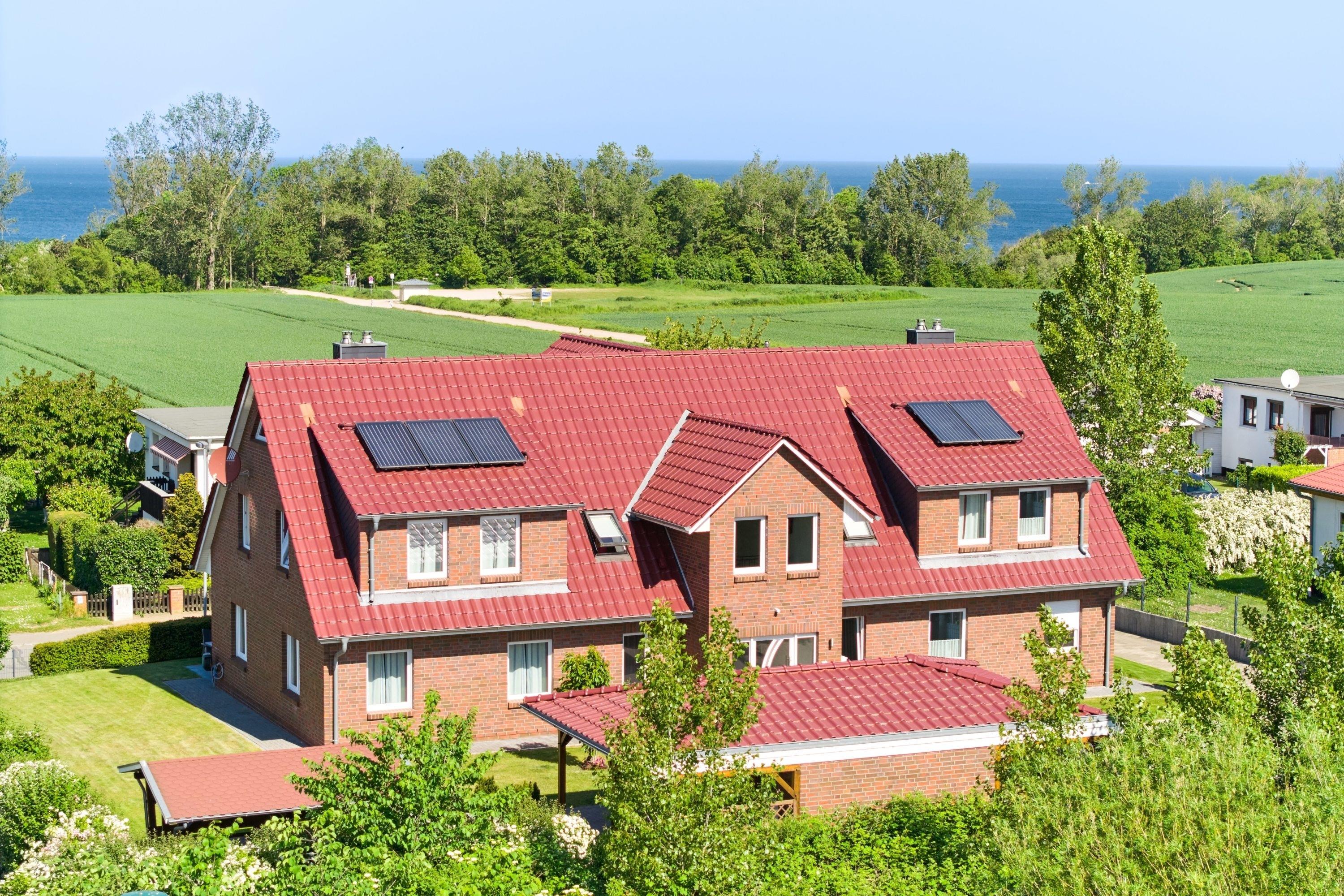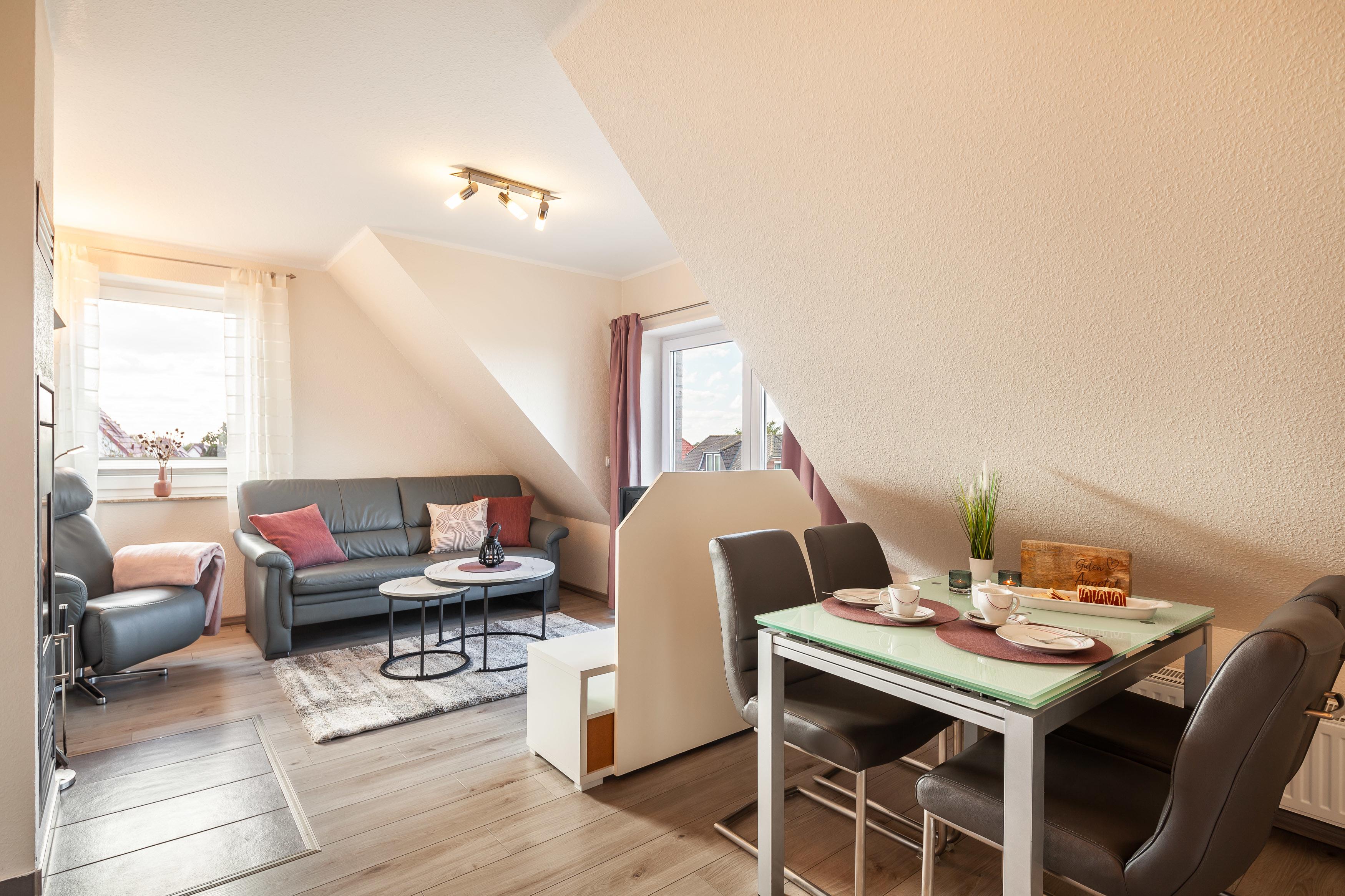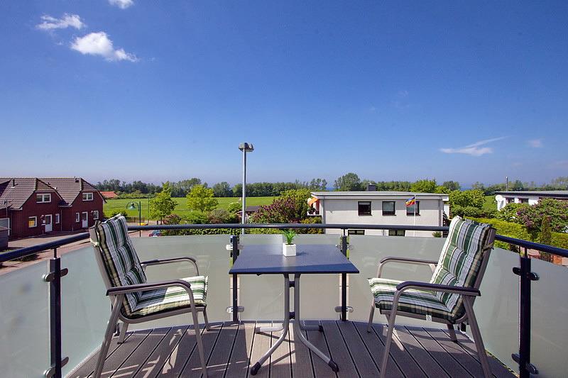 Die Fewo 'Santa Maria' , 62qm, mit einem Balkon liegt im Obergeschoss und bietet einen Blick auf die Ostsee. Sie verfügt über 2 Schlafzimmer, eines mit einem Doppelbett und Fernseher, das andere mit 2 Einzelbetten. Die offene Küche , in weiß gehalten mit grauer Arbeitsplatte, ist mit allem Komfort wie Geschirrspüler, Kühlschrank mit Gefrierfach, Cerankochfeld, Backofen, Granitspüle, Kaffeemaschine usw. ausgestattet. Der Esstisch mit seiner Glasoberfläche und den bequemen Schwingstühlen bietet Platz für 4 Personen. Der gemütliche Wohnraum mit Kamin ist mit einem Ledersofa und Fernsehsessel eingerichtet. Ein großer Smart TV, Blu-Ray-Player, sowie Spiele, Bücher und Umgebungskarten sind vorhanden. Das schöne Badezimmer mit Tageslichtfenster ist in Creme/braun gehalten und mit einem großen Waschtisch, Dusche 0,90 x 1,00 m, Fußbodenheizung und Radio ausgestattet. Der geräumige Flur und ein separater Abstellraum bieten viel Platz.