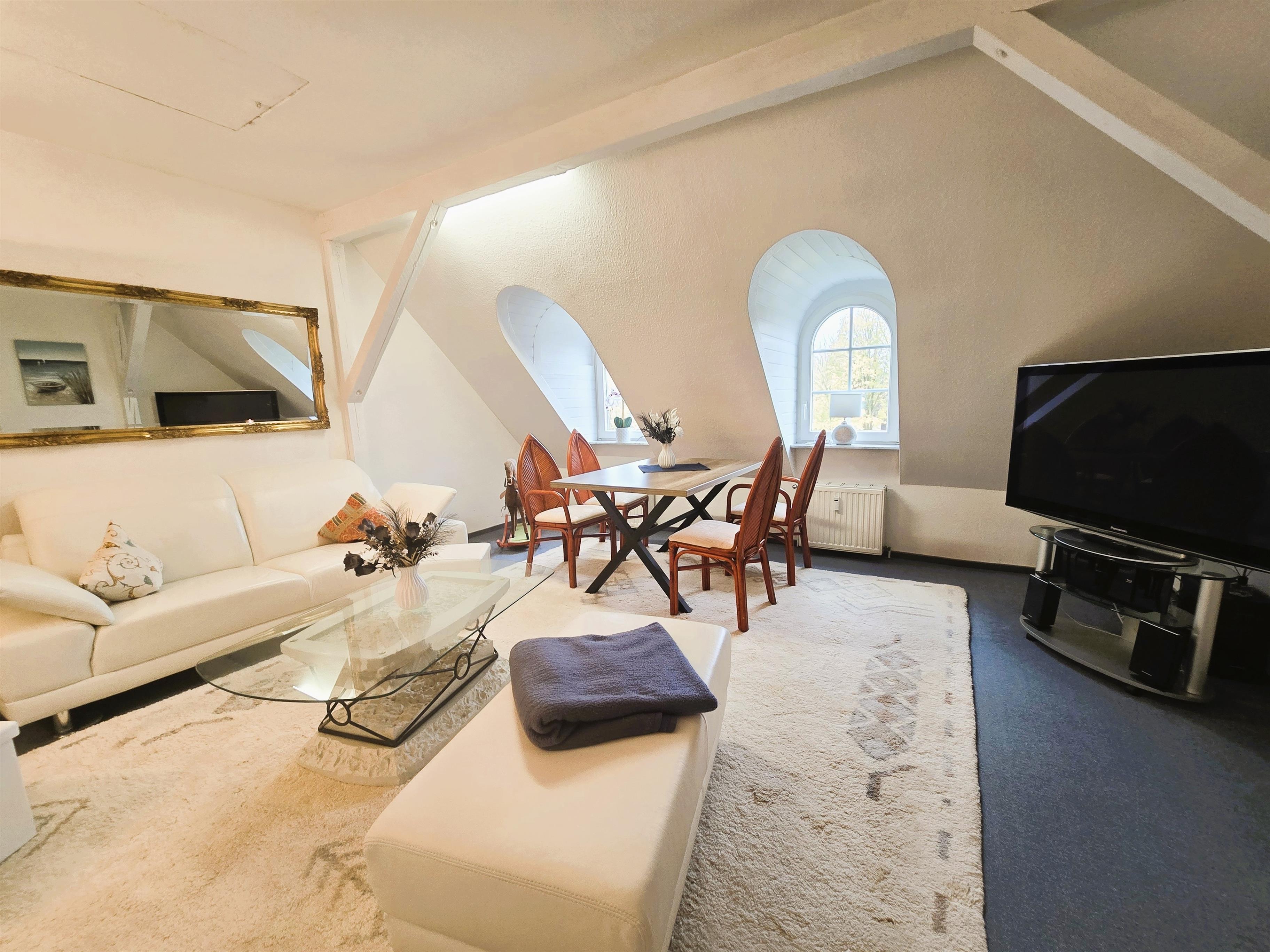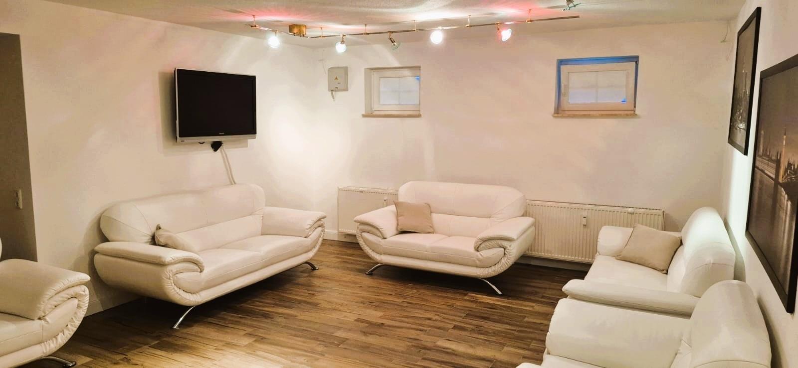 In der 2. Etage haben wir ein großzügiges und komfortables Wohnzimmer mit Essbereich, desweiteres befindet sich auf dieser Etage die Vollausgestattete Küche, ein weiteres Badezimmer mit einer Whirlpoolbadewanne und Dusche, sowie das 3. Schlafzimmer mit Doppelbett, Kleiderschrank und einen Fernseher.