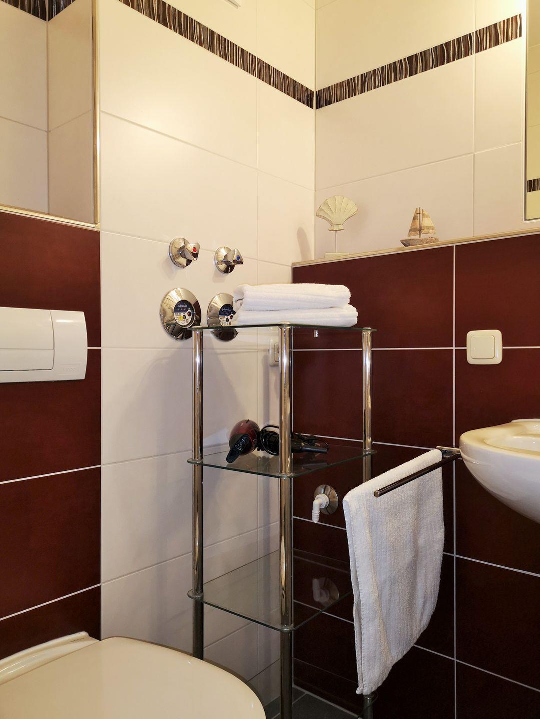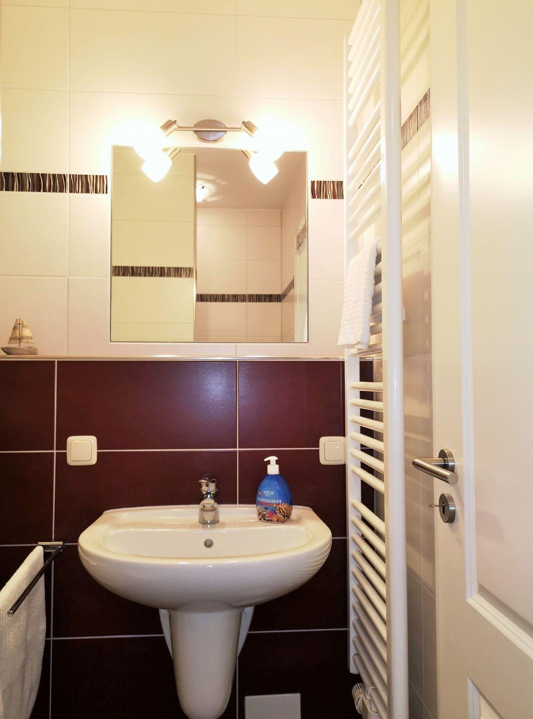 Das große und moderne Badezimmer verfügt über einen sehr großen Duschbereich (160 cm x 90 cm) mit ebenerdigem Einstieg (seniorenfreundlich!) und einer thermostatgeregelten Duschbrause, Waschbecken, WC, Föhn, Handtuch-Heizkörper, Fußbodenheizung sowie ausreichend Ablagemöglichkeiten.