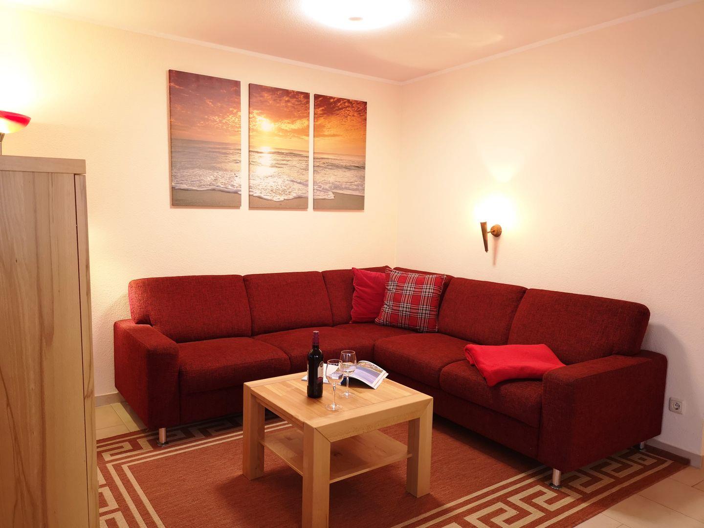 Das geräumige Wohn-/Esszimmer verfügt über eine separate Sitzgruppe mit großer, bequemer Couch und Couchtisch, einen separaten Esstisch mit 4 Stühlen sowie ein Sideboard und einen Schrank. Vom Wohnzimmer aus haben Sie direkten Zugang zu der ca. 16 m² großen und sonnigen Terrasse (nach Süd-Osten ausgerichtet) mit bequemen Terrassenmöbeln und kleinem Gartenanteil - hier sitzen Sie entspannt und gemütlich im Grünen!