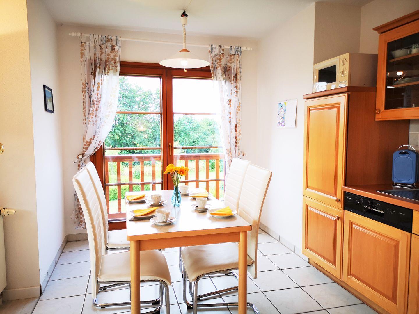 Das freundliche und geräumige Wohn-/Esszimmer verfügt über eine separate Sitzgruppe mit bequemer (ausziehbarer Schlaf-)Couch, 3 Sesseln und Couchtisch, einen separaten Esstisch mit 4 Stühlen sowie 2 Sideboards. Vom Wohnzimmer aus haben Sie direkten Zugang zu dem ca. 3 m² großen und sonnigen Balkon (nach Süd-Osten ausgerichtet) mit Balkonmöbeln und herrlichem Blick in die Natur. Hier sitzen Sie entspannt und gemütlich mitten im Grünen und können abends bei einem guten Glas Wein in Ruhe die lauen Sommernächte genießen!