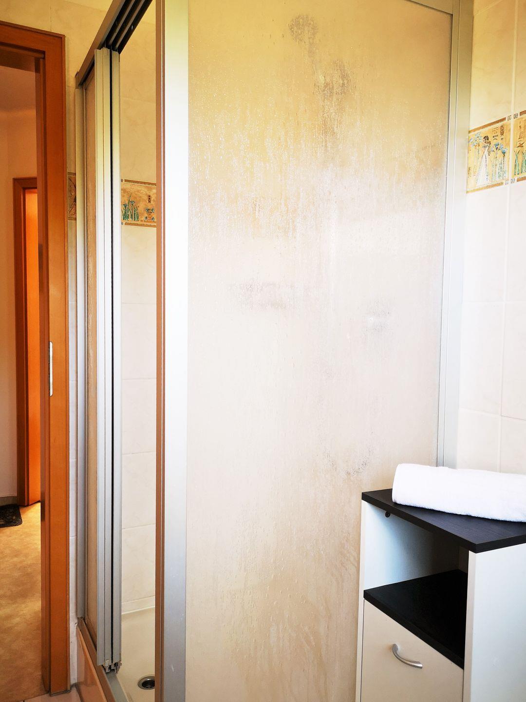Das helle Badezimmer (mit Tageslicht / Fenster) verfügt über eine Dusche, Waschbecken und WC, einen kleinen Badezimmerschrank sowie ausreichend Ablagemöglichkeiten.