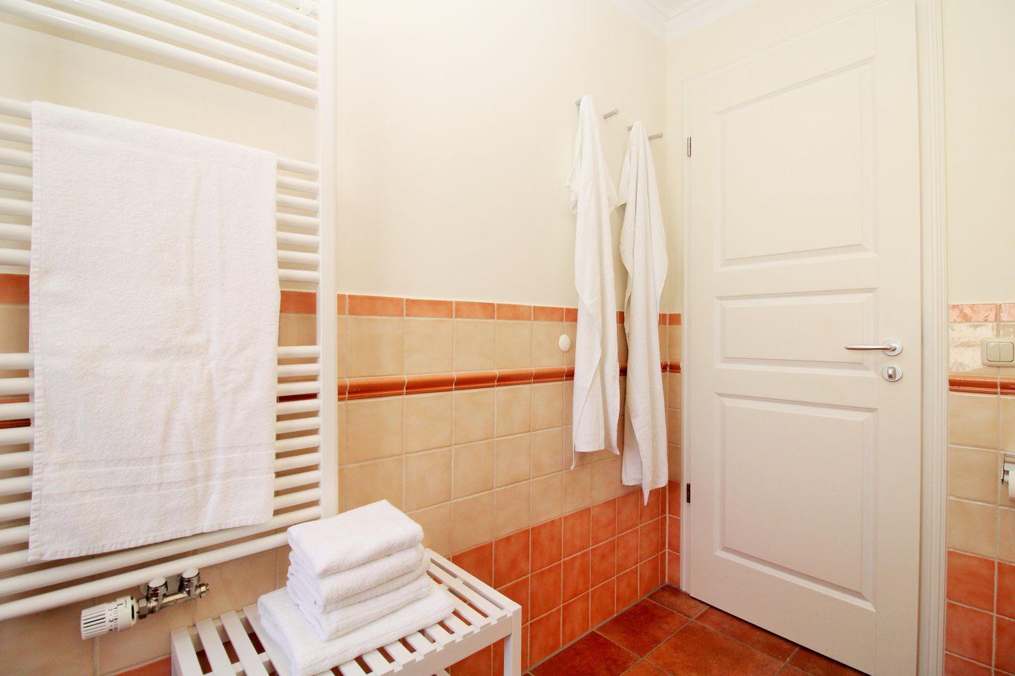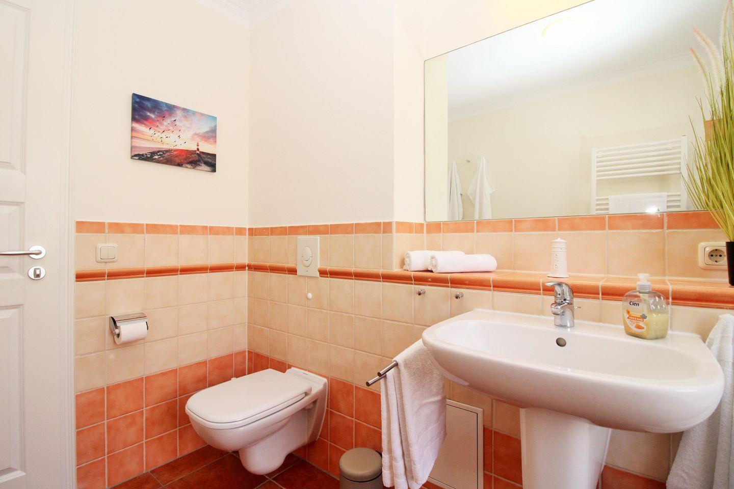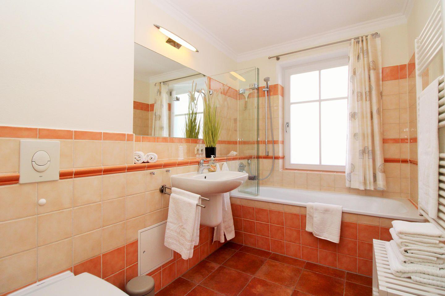 Das mediterran anmutende geräumige Badezimmer (mit Tageslicht / Fenster) verfügt über eine Badewanne mit Echtglas-Duschtrennwand, Waschtisch mit großem Wandspiegel, Föhn, WC, ein Badezimmerregal, Fußbodenheizung, einen Handtuch-Heizkörper sowie genügend Ablagemöglichkeiten.