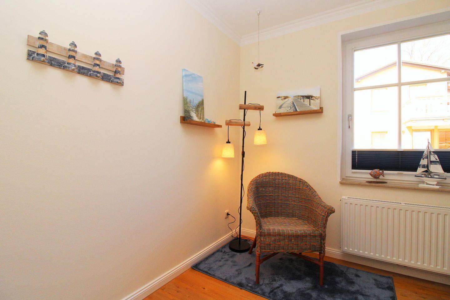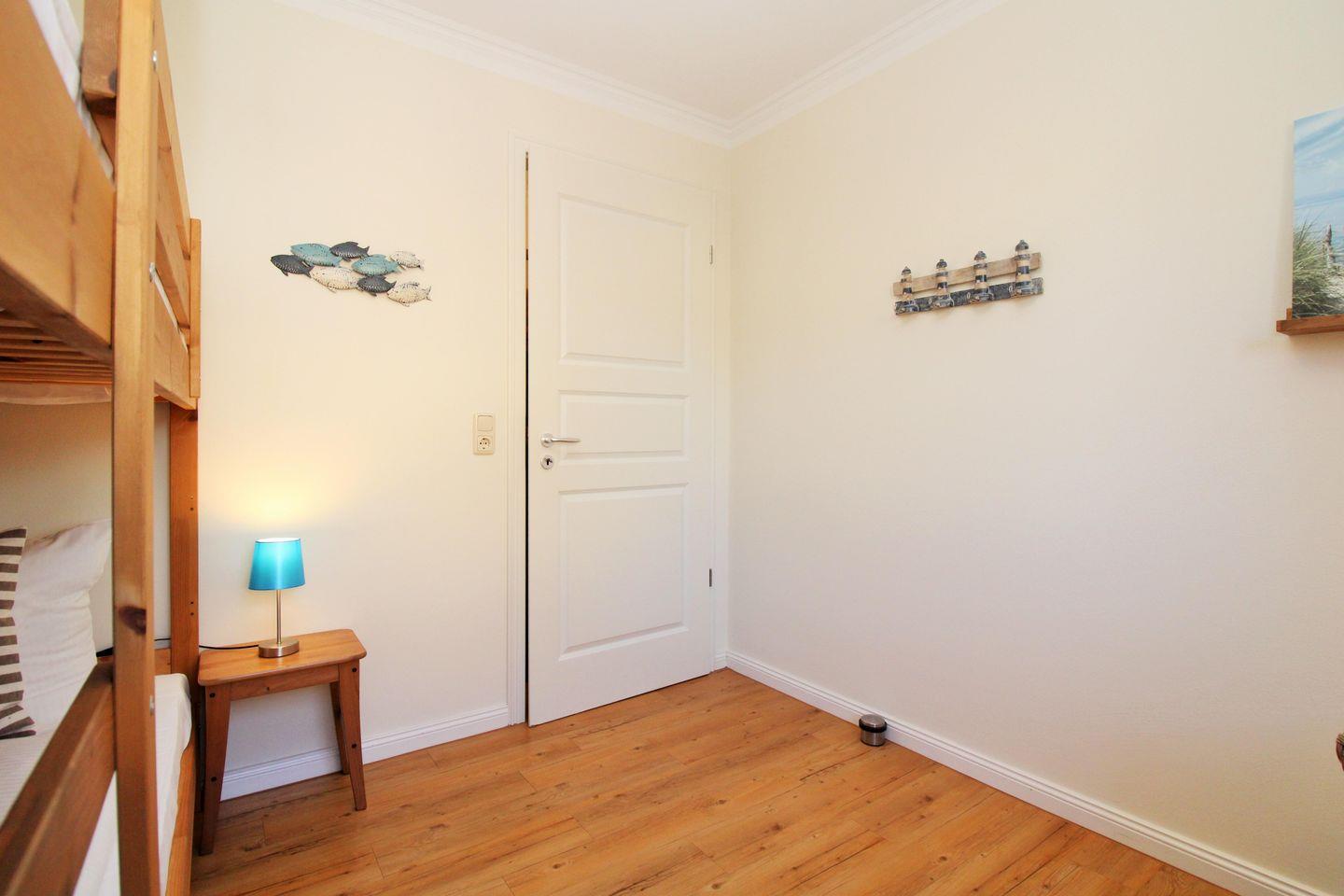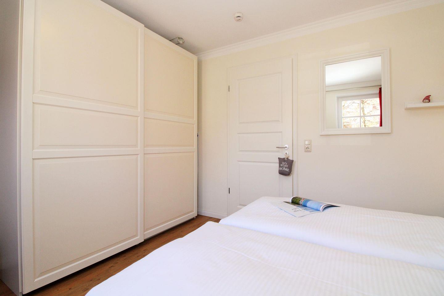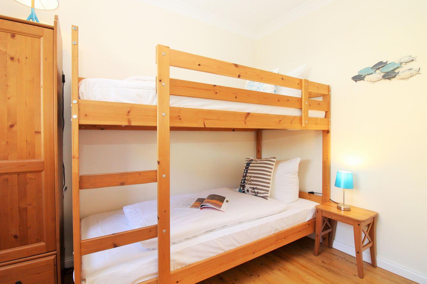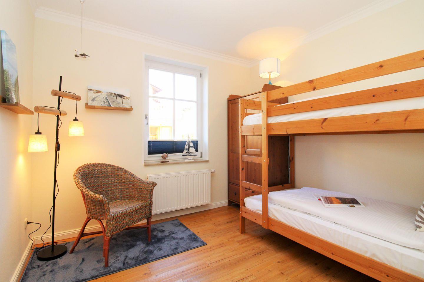 Das separate 2. Schlafzimmer verfügt über ein Doppelstockbett, Nachttisch mit Lampen, einen Kleiderschrank sowie eine kleine Leseecke mit einem Korbsessel.