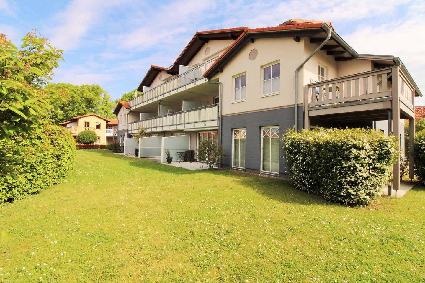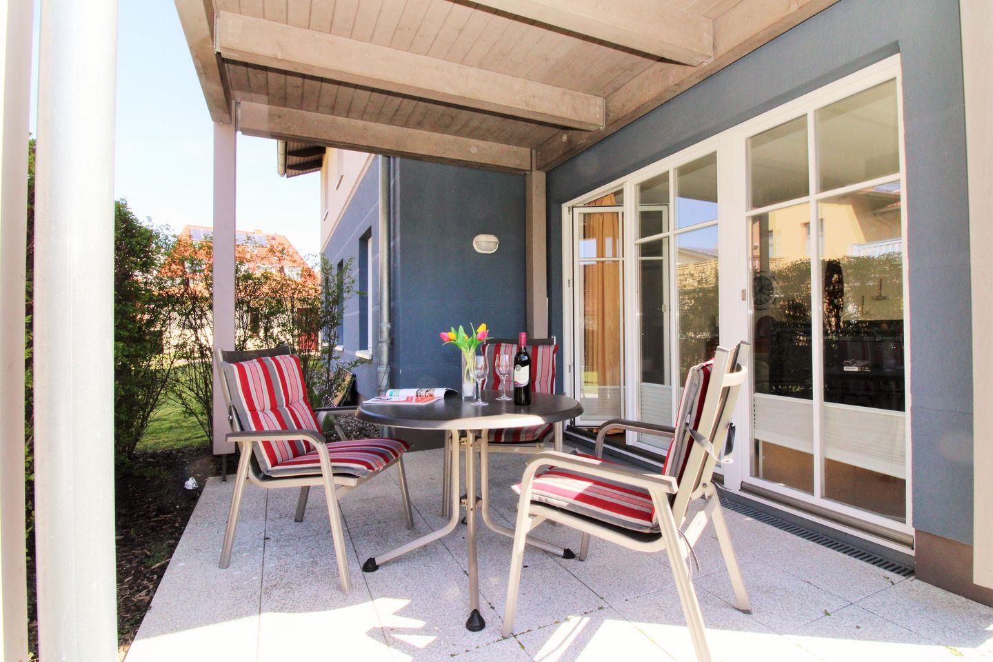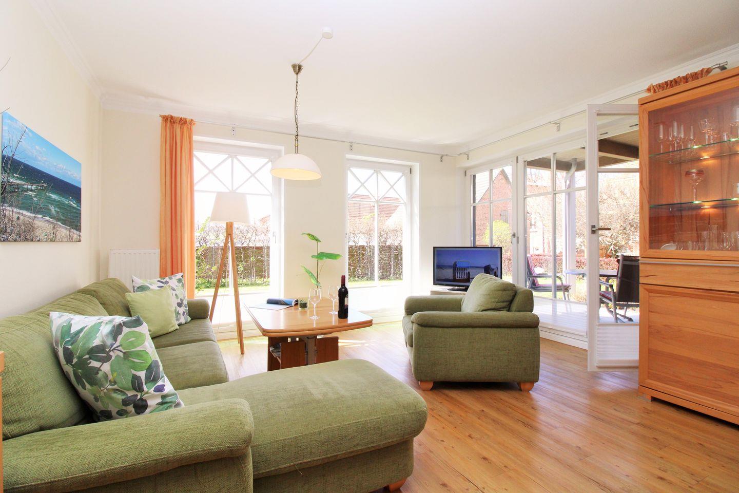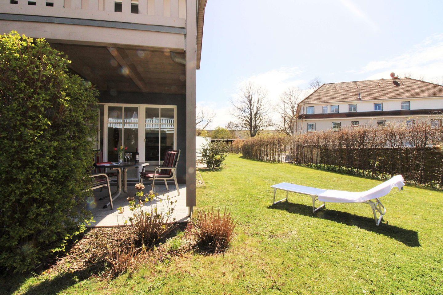 Das freundliche und gemütliche Wohn-/Esszimmer verfügt über eine separate Sitzgruppe mit bequemer Eckcouch, Sessel und Couchtisch, einen separaten Esstisch mit 4 Stühlen, einen großen Schrank sowie ein Sideboard. Vom Wohnzimmer aus haben Sie direkten Zugang zu der ca. 8 m² großen und überdachten Terrasse (nach Süd-Westen, Westen und Norden ausgerichtet) mit Gartenmöbeln. Hier sitzen Sie entspannt und gemütlich mitten im Grünen und können abends bei einem guten Glas Wein in Ruhe die lauen Sommernächte genießen!
