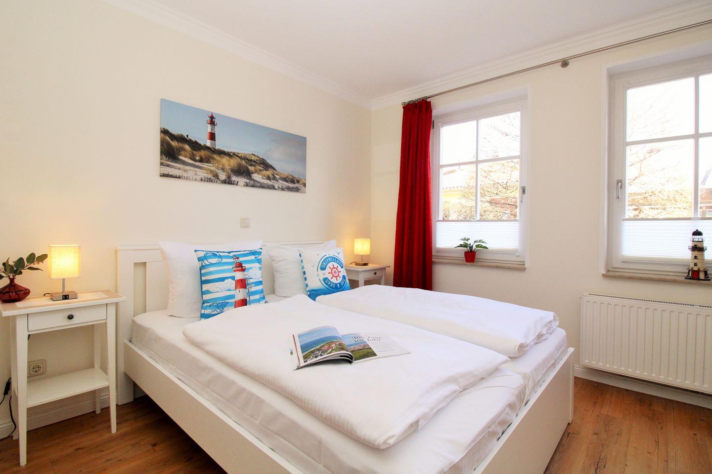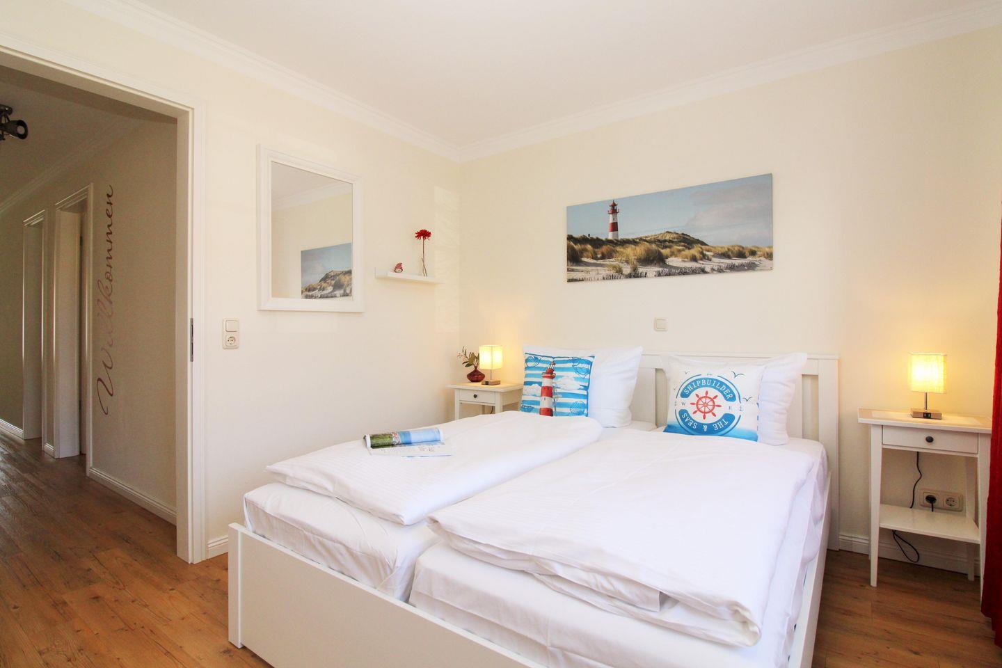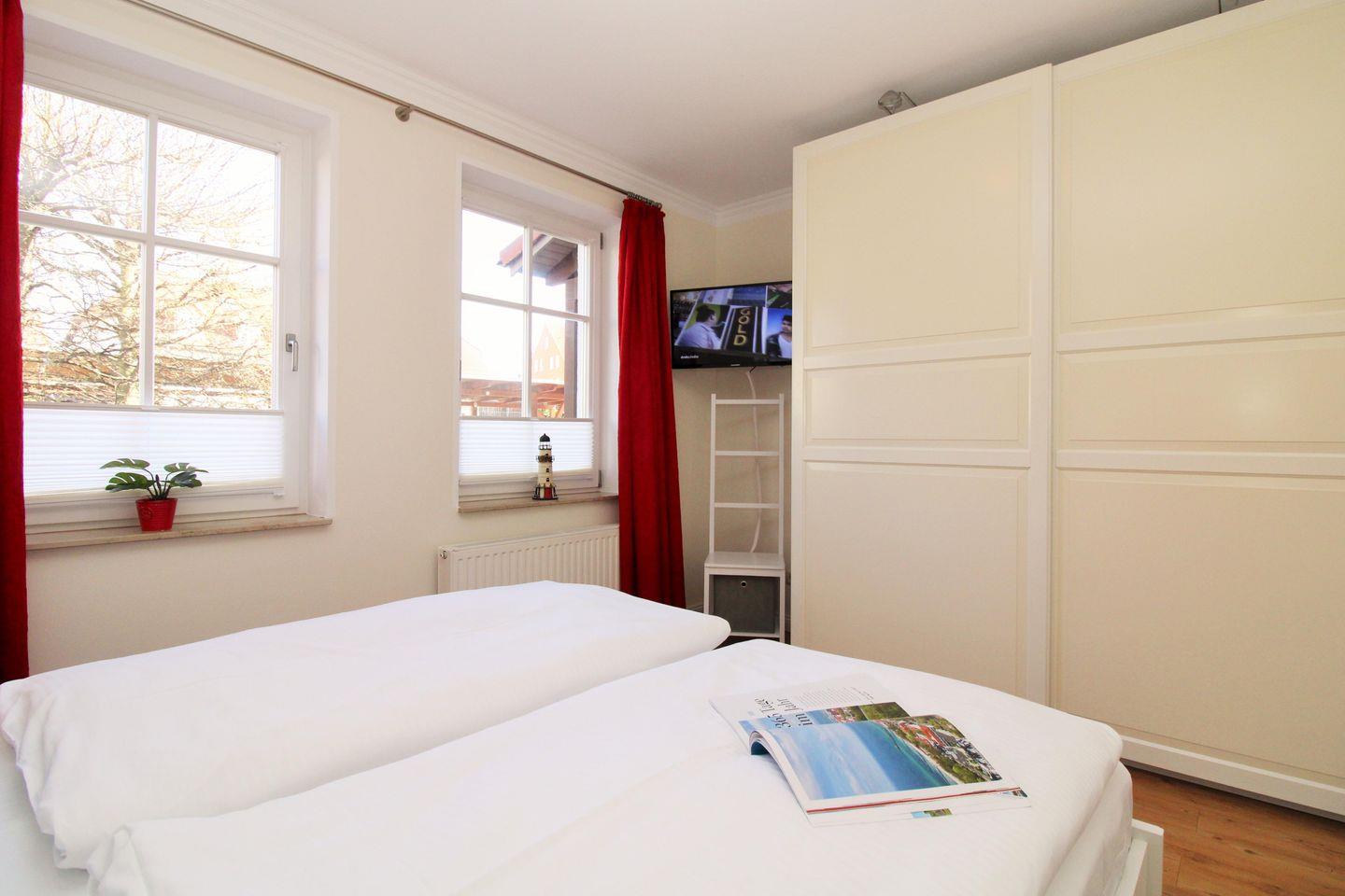 Das helle und freundliche 1. Schlafzimmer ist mit einem bequemen Doppelbett (160 x 200), Nachttischen sowie einem geräumigen Kleiderschrank eingerichtet und verfügt über ein zusätzliches TV-Gerät.