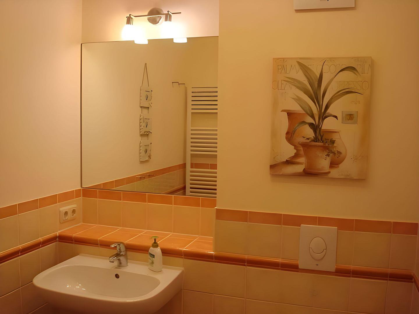 Das Bad besticht mit ebenerdiger Dusche, Ablagemöglichkeit sowie Haartrockner.