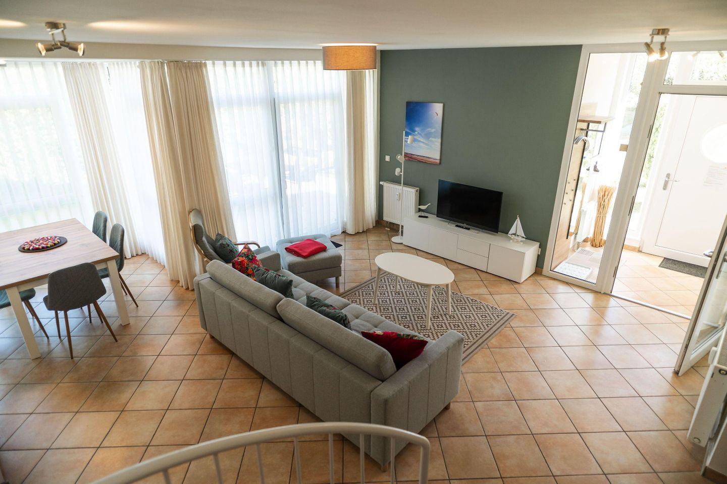 Wohnraum mit Schlafcouch und Couchtisch, Esstisch mit 6 Stühlen, Flachbild - TV, Stereoanlage