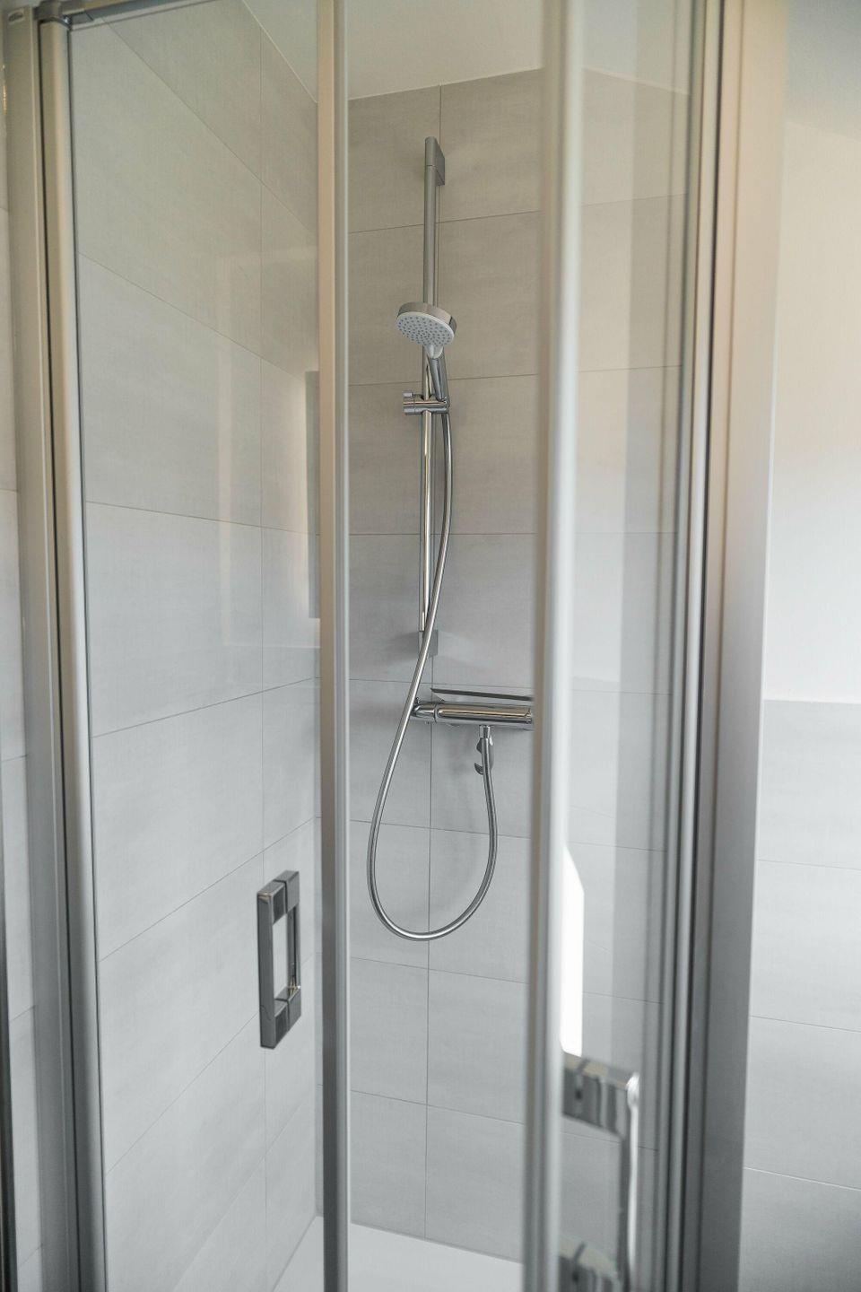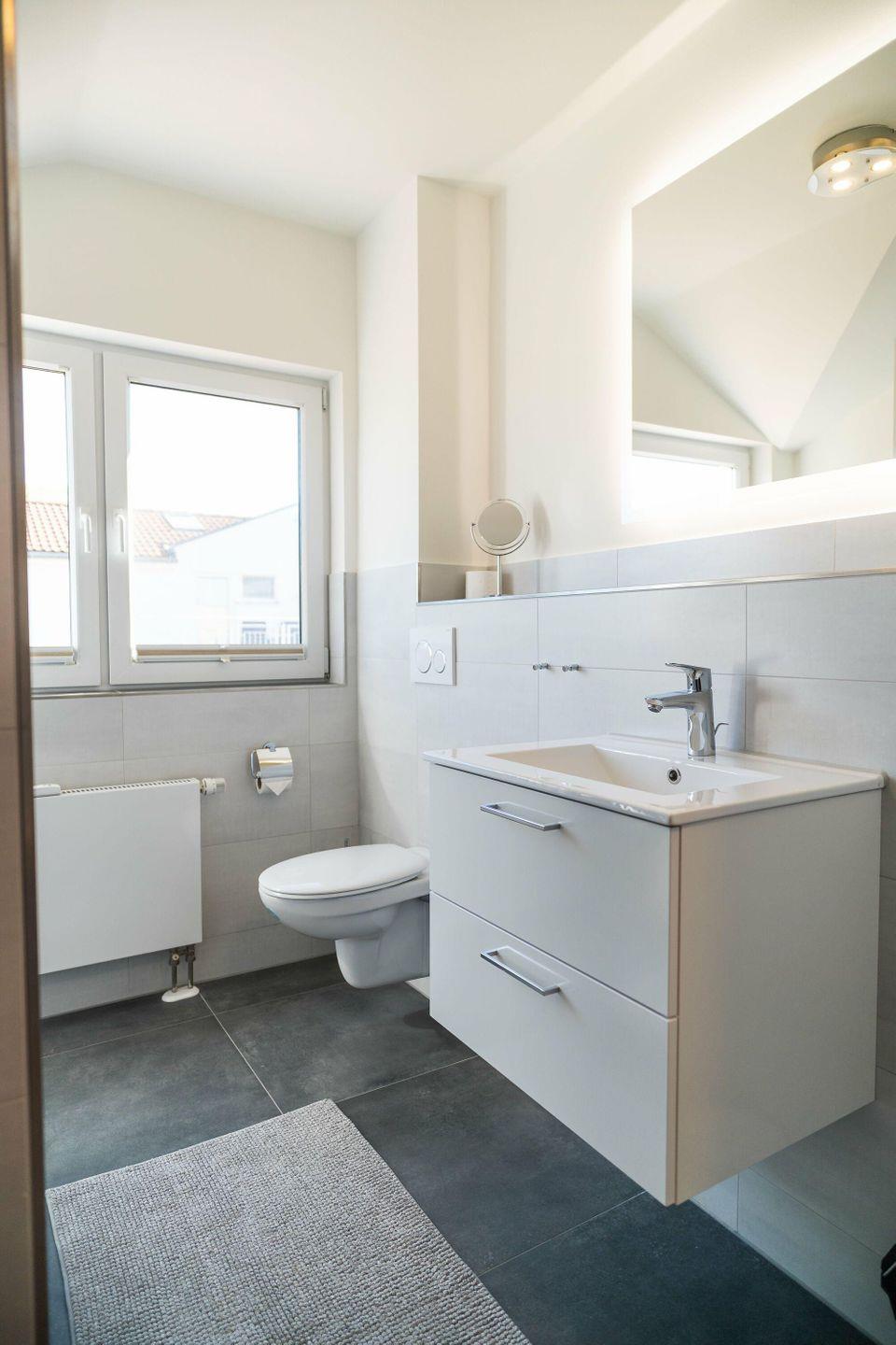 Badezimmer mit Badewanne und bodentiefer Dusche, Fußböden gefliest