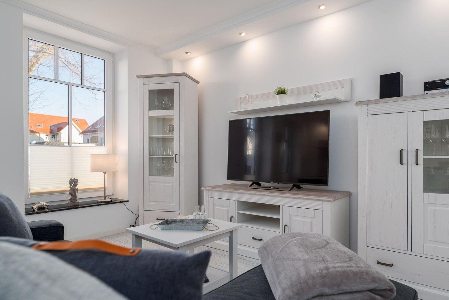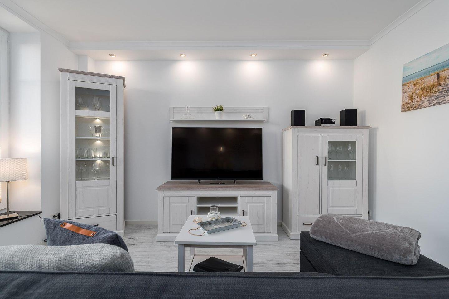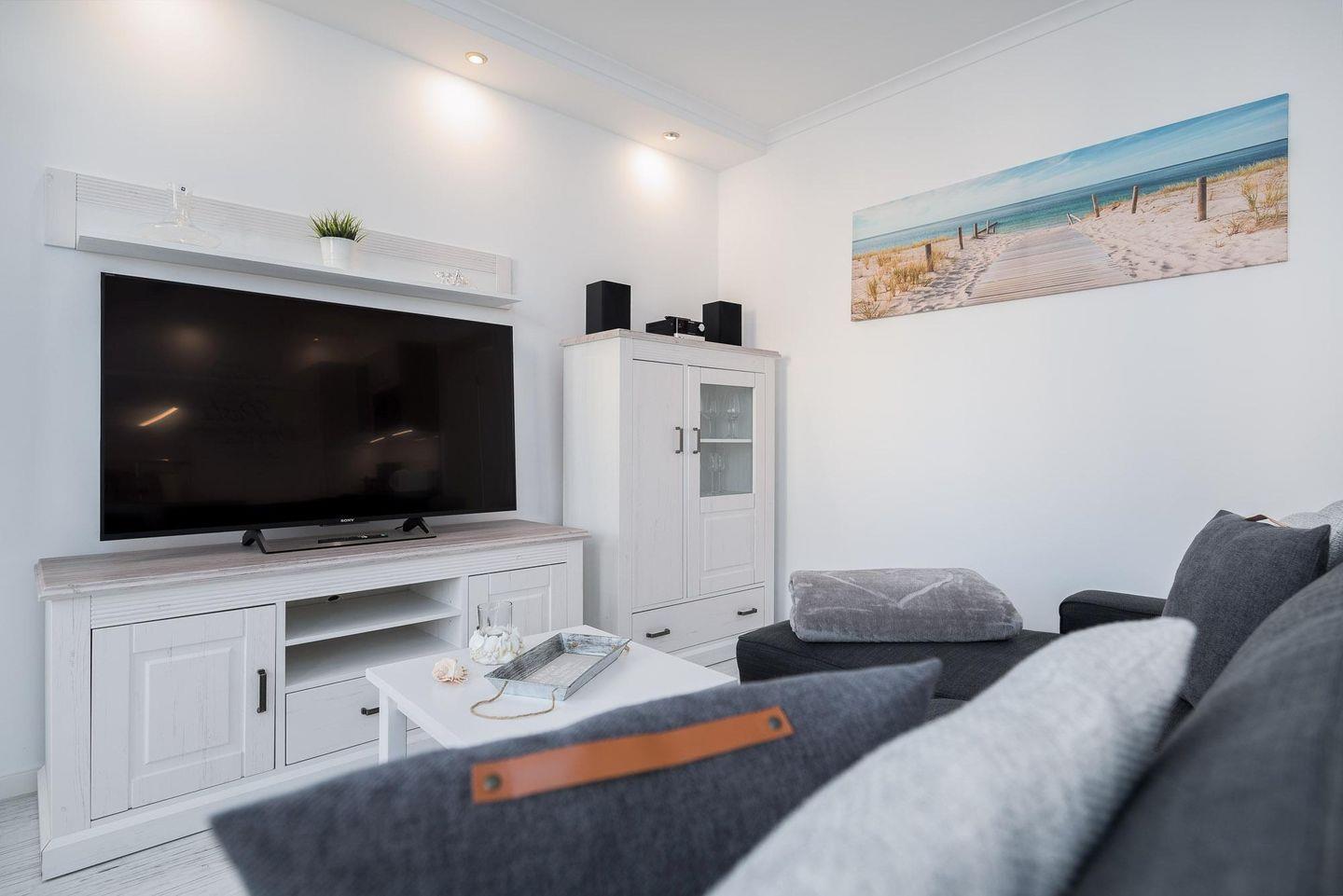 Der Wohnbereich ist mit einem großen TV-Gerät, einem