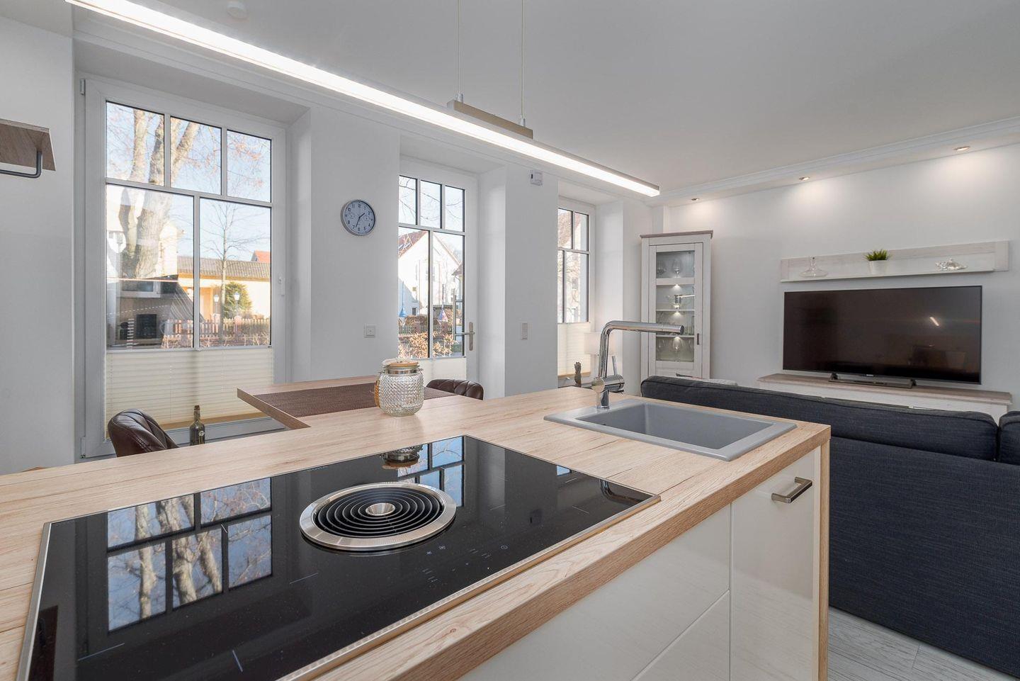 Die angrenzende offene Küche bietet allen Komfort wie z. B. Kühlschrank mit