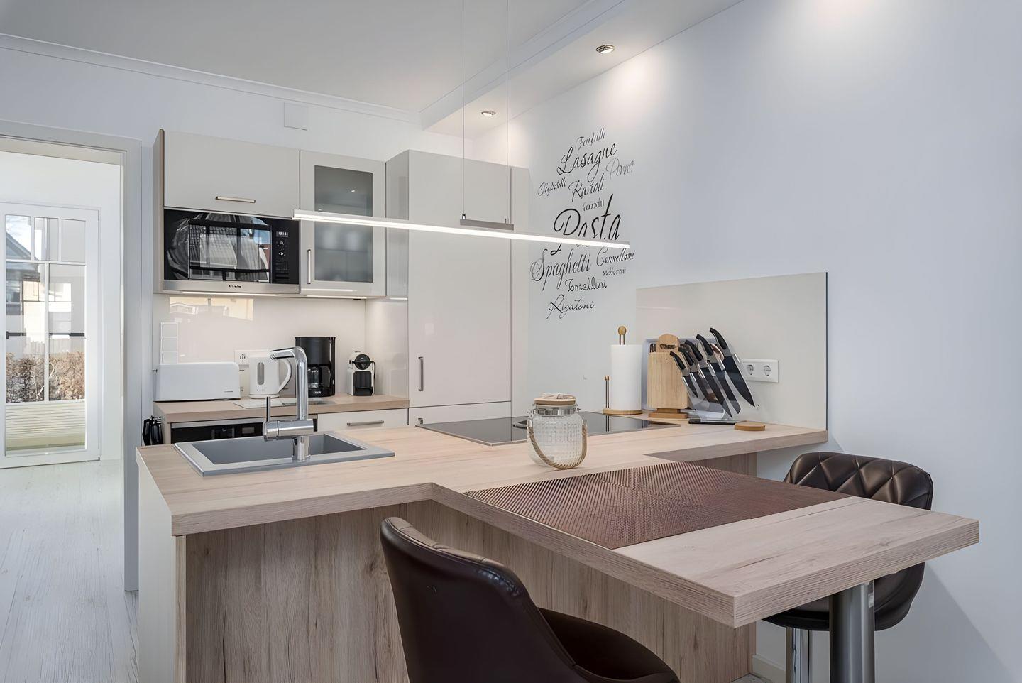 Platz finden Sie an der Ess-Theke mit Hockern.