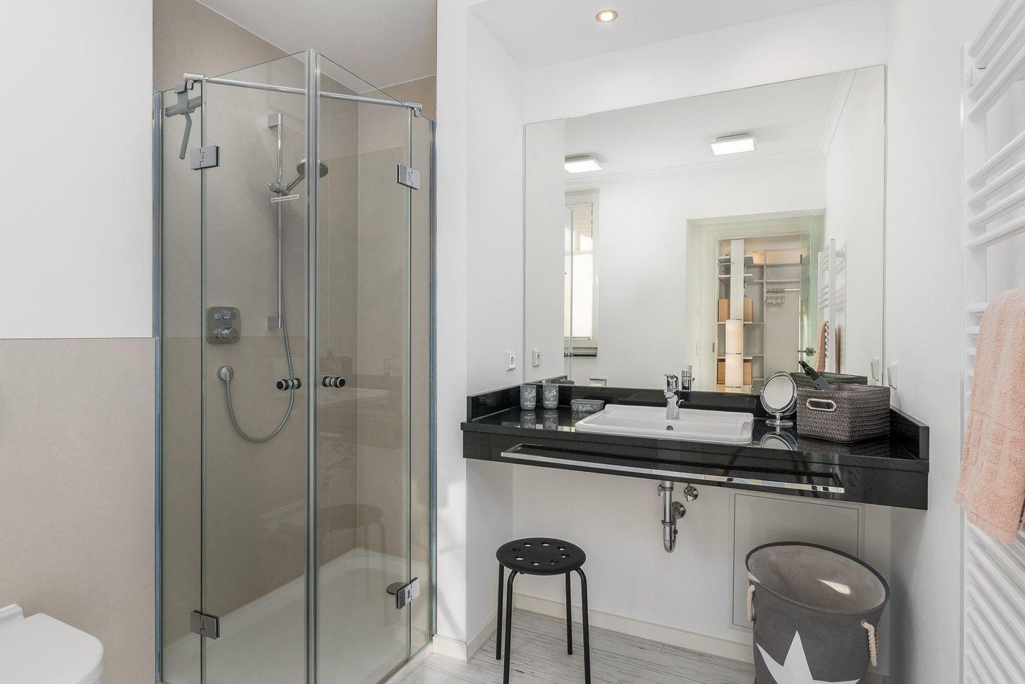 Das Badezimmer verfügt über eine bodengleiche Dusche, einen Waschtisch aus