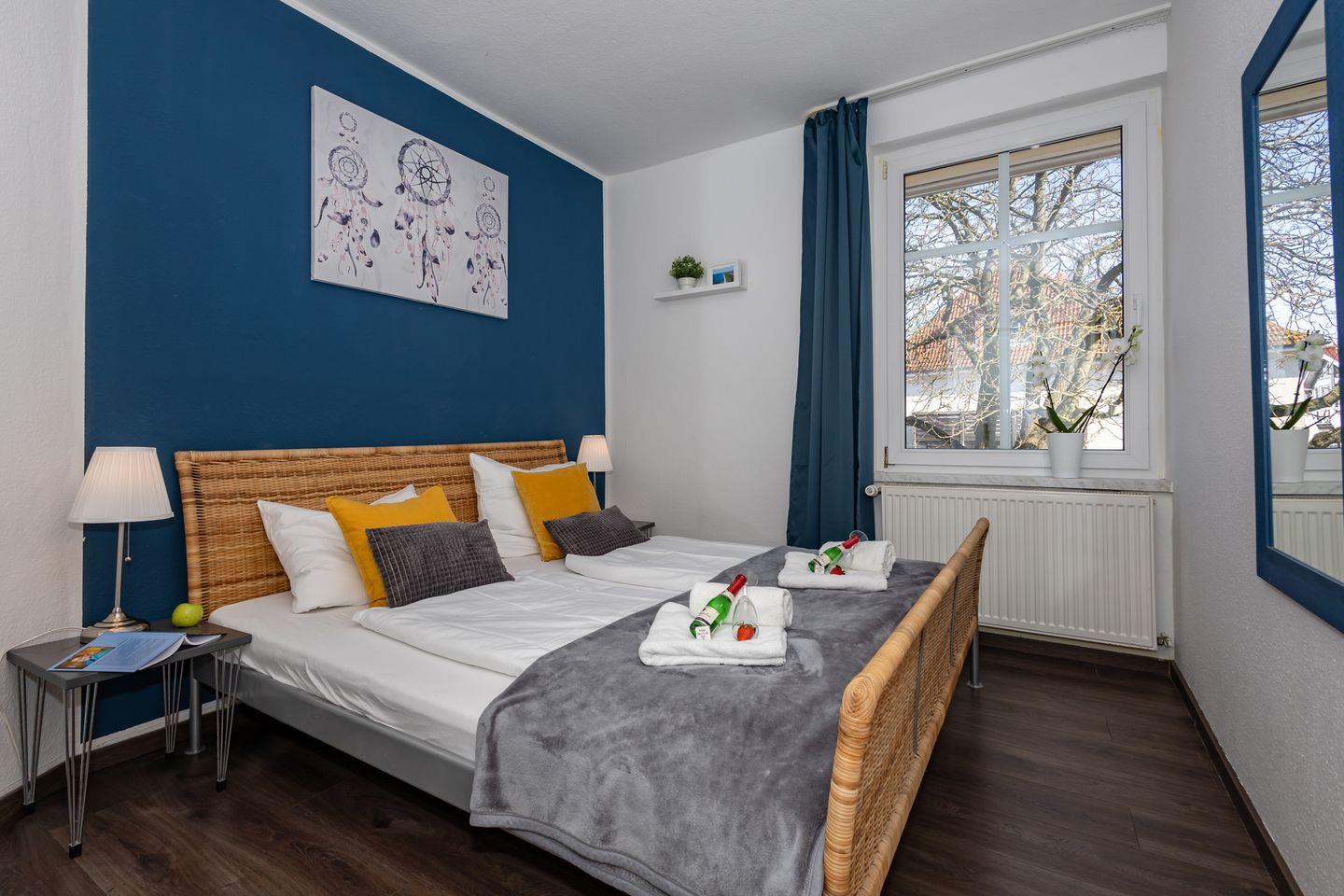 Die Wohnung liegt im 1. Stockwerk und verfügt über insgesamt drei Zimmer. Zwei separate Schlafzimmer sorgen für Privatsphäre und ausreichenden Raum für bis zu vier Personen. Der freundliche Wohnbereich ist mit Laminatboden ausgestattet, bietet eine gemütliche Sofaecke, einen Fernseher (25–34 Zoll), einen DVD-Spieler sowie einen zuverlässigen Internetzugang per WLAN. Familien fühlen sich hier ebenso wohl wie Paare, wobei besonders die kinderfreundliche Ausstattung hervorzuheben ist: Babys und Kinder sind ausdrücklich willkommen, ein Sandkasten im Außenbereich sowie ein Spielplatz in der Nähe sorgen für Spaß und Abwechslung.
