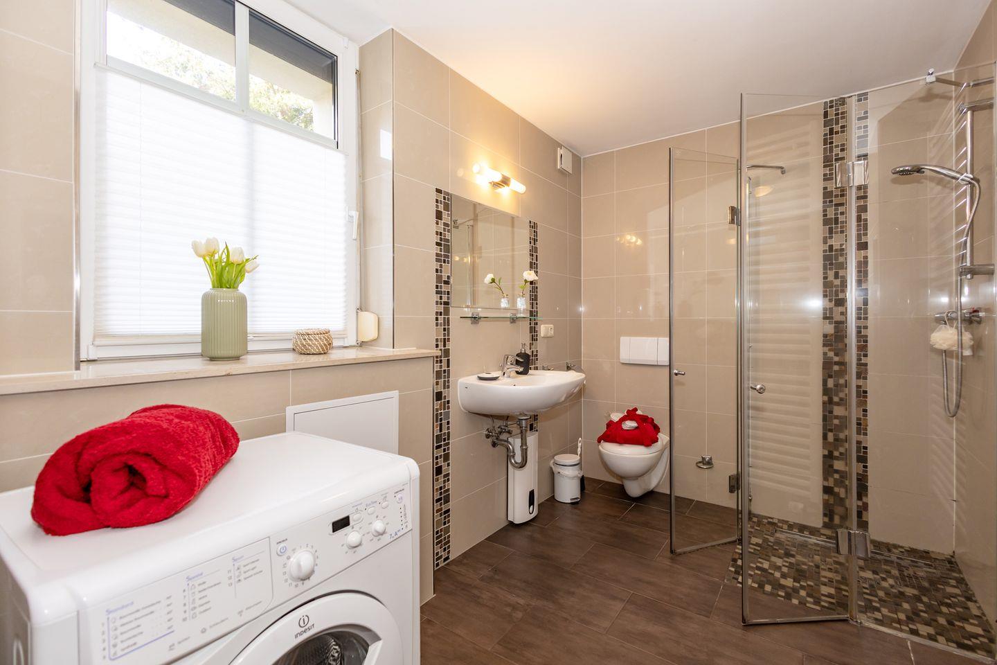 Im modernen Badezimmer finden Sie eine bodengleiche Dusche, ein Waschbecken, einen Spiegel, WC sowie einen Haartrockner. Warmes Wasser ist selbstverständlich vorhanden und rundet den Komfort ab.