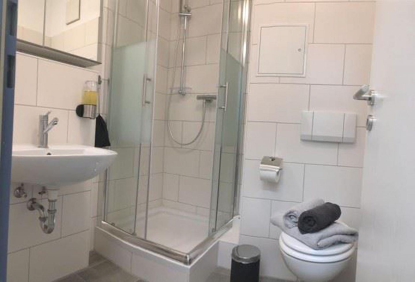 Schon beim Betreten der Wohnung werden Sie sich wohlfühlen: Der kleine Flur heißt Sie mit einem großen Schrank willkommen, der reichlich Platz für Ihr Gepäck bietet. Direkt vom Flur aus erreichen Sie das innenliegende Duschbad – ausgestattet mit Dusche, Waschbecken und WC.