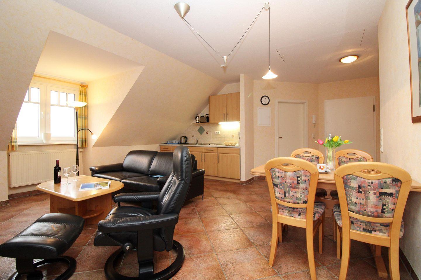 Auf rund 65 m² bietet die Wohnung ausreichend Platz für bis zu 4 Personen. Das helle Wohn-/Esszimmer lädt mit einer gemütlichen Sitzgruppe und einem Esstisch zu entspannten Stunden ein. Durch die große Balkontür gelangen Sie auf den möblierten Balkon mit Morgensonne – ideal, um bei einer Tasse Kaffee den Blick auf die Ostsee und das Salzhaff zu genießen.